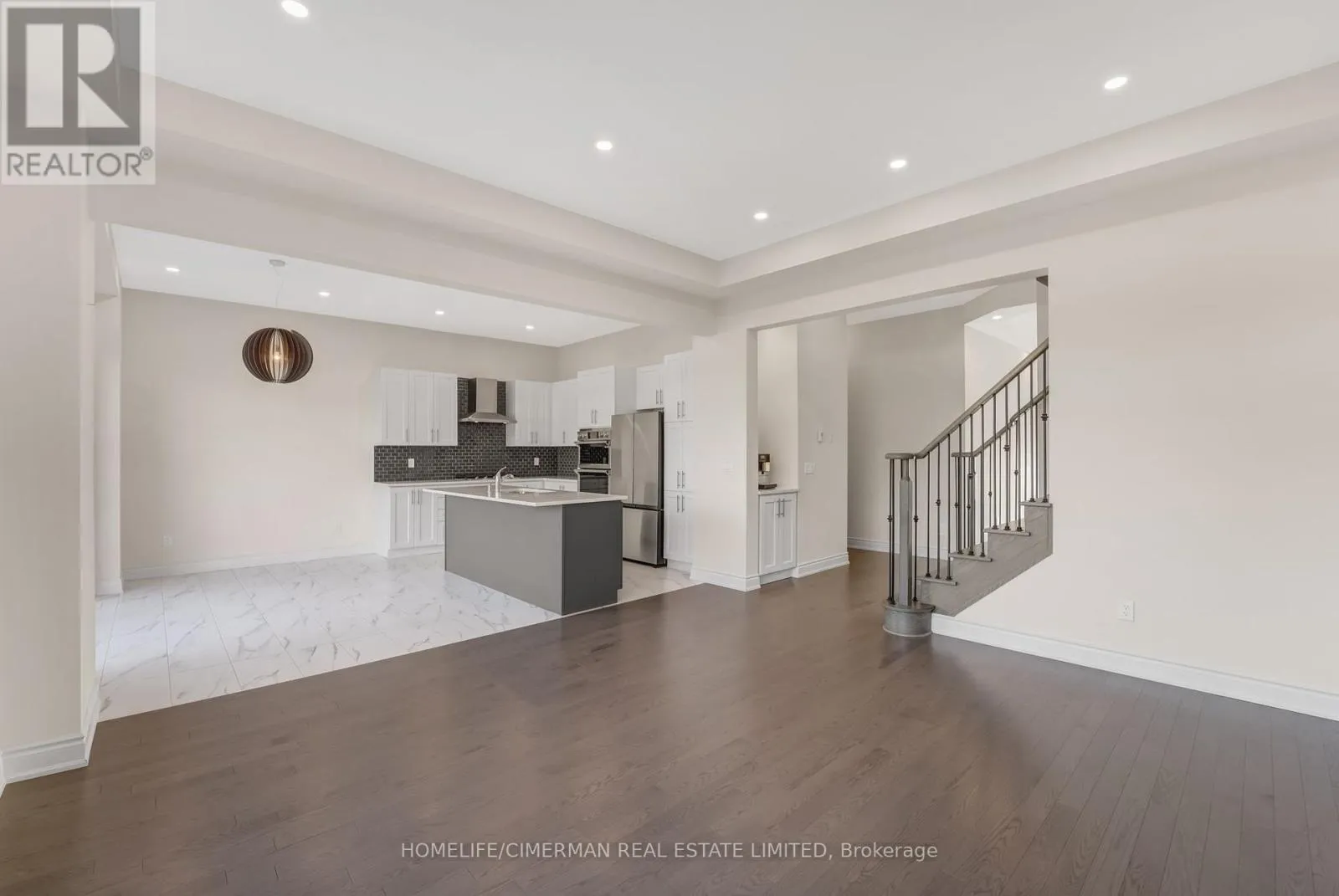 A modern open concept Kitchen W/Large Island with designer touches such as a custom gas fireplace. (id:27476)