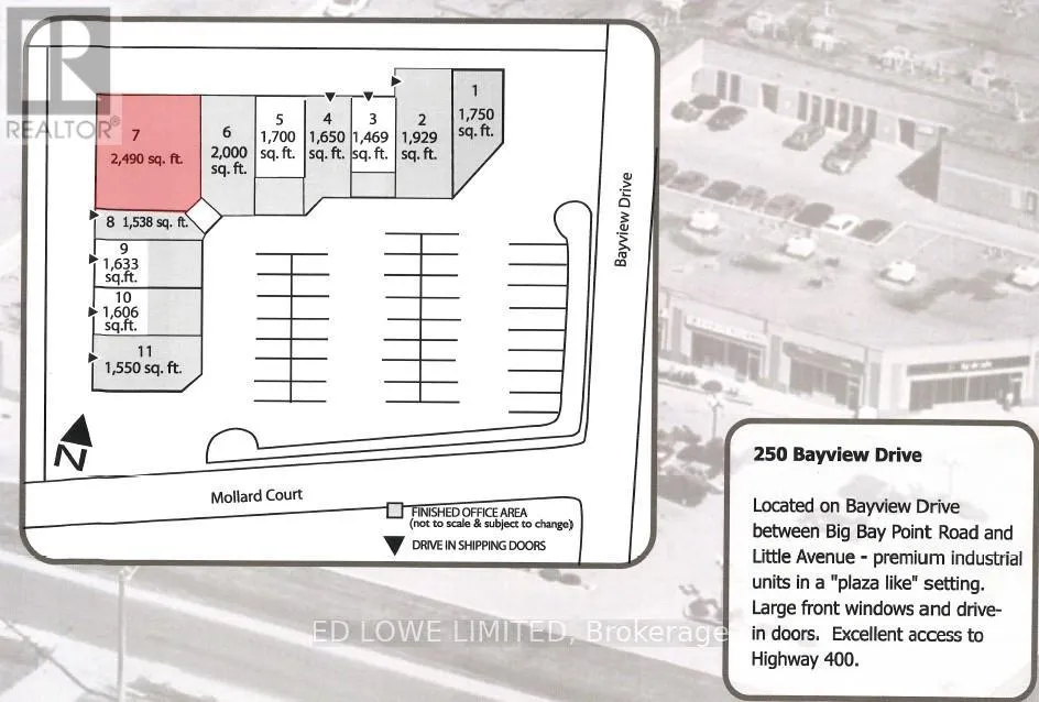 BIG BAY POINT TO BAYVIEW 2,490 s.f. industrial unit in Barries bustling south end. This storefront-style corner unit offers excellent visibility and natural light, ideal for a variety of industrial or commercial uses. Prime Location with easy access to Hwy 400 Ample on-site parking for staff and visitors. Storefront entrance perfect for showroom or office use. Well-suited for light industrial, warehousing, or service-based businesses.