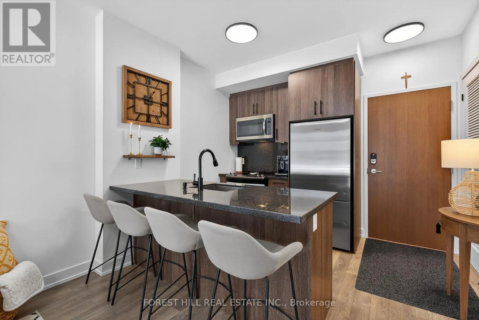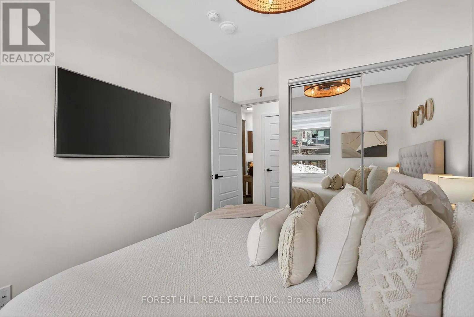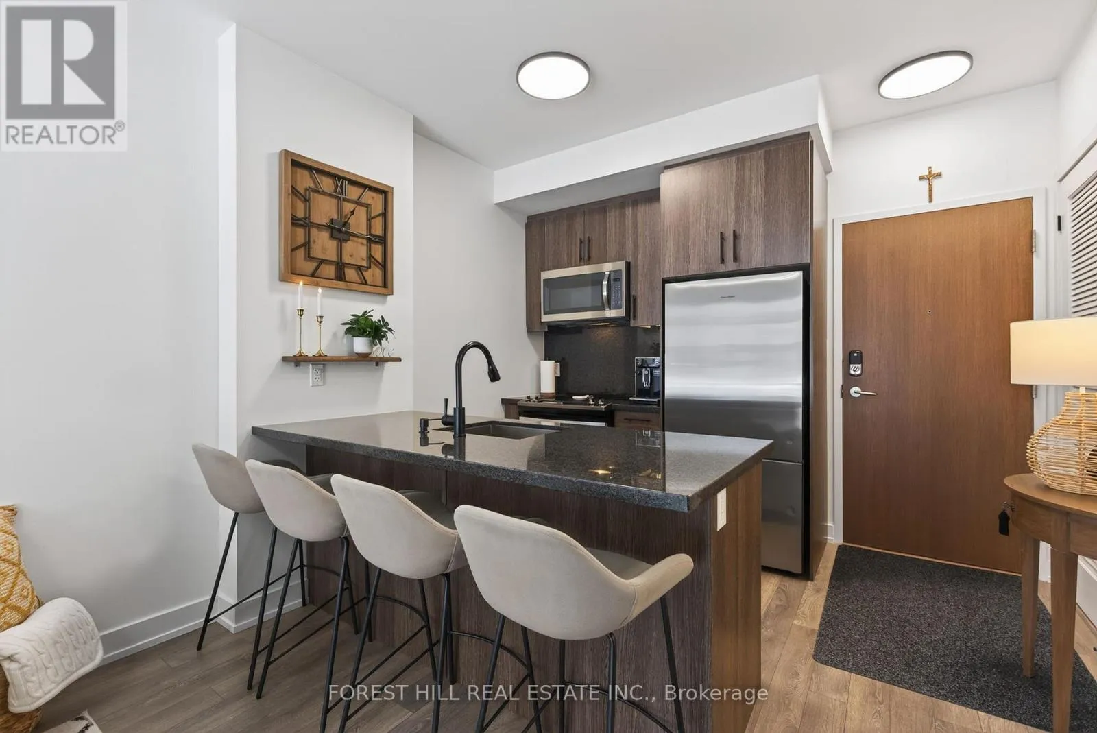Friday Harbour/Big Bay Point Welcome to waterfront living at its finest! This immaculate, east-facing ground floor 1-bedroom, 1-bathroom unit showcases true pride of ownership. Beautifully maintained and tastefully decorated, this fully equipped open-concept suite is completely move-in ready, just unpack and enjoy. The bright living space flows seamlessly into the kitchen and dining area, creating an inviting atmosphere for everyday living.