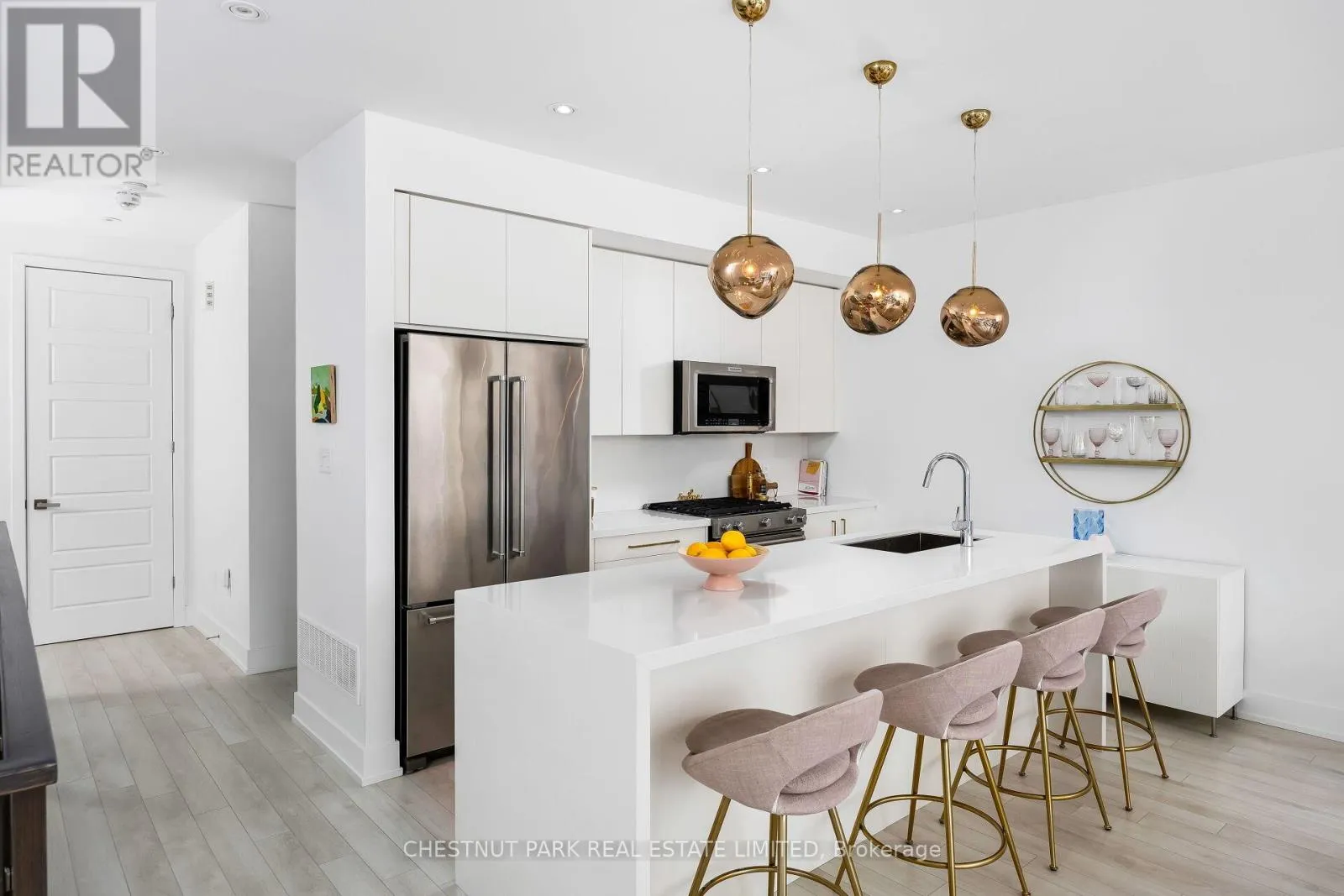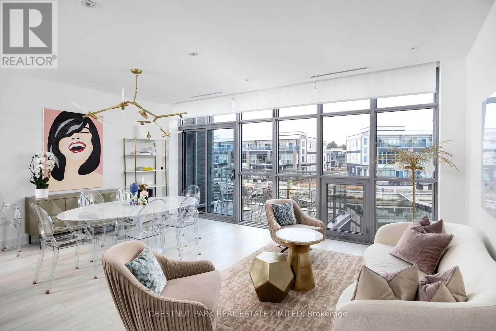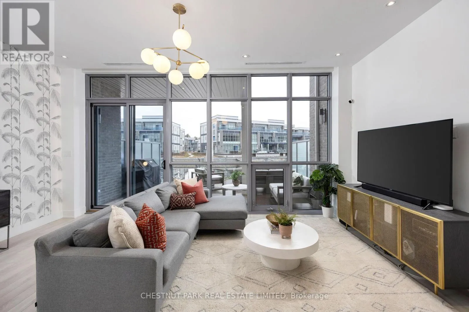 Soaring ceilings, oversized floor-to-ceiling windows, and a premium west exposure carry the light, the sunsets, and the water through every level. The ground level opens with a built-in 2-car garage, an oversized Statuario Venato tile foyer, and an entertainment room with a full built-in bar that walks out to the deck and the boat slip. The second level is the heart of the home: open-concept Paris Kitchens cabinetry, a quartz waterfall island, KitchenAid stainless steel appliances, and a living and dining room that flow out to a glass-railed balcony. The primary suite anchors this floor with a walk-in closet and a five-piece ensuite featuring a soaker tub and oversized glass shower. The third level holds two further bedrooms, each with a private ensuite, opening to a generous terrace. Mangusta residents enjoy exclusive use of a private pool and cabana - shared only among the island's 68 owners. Full Lake Club access includes pool, hot tub, restaurant, fitness centre, and theatre. The Nest golf course, the 200-acre nature preserve, and Mount St. Louis Moonstone are minutes away. Highway 400 keeps Toronto close. A fully furnished, turn-key option is available, including the boat and golf cart. Newly priced at $1,499,000 - a deliberate move, made with intent. The right buyer will recognize it on first walk-through. (id:27476)