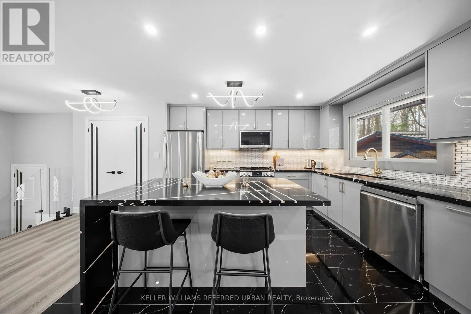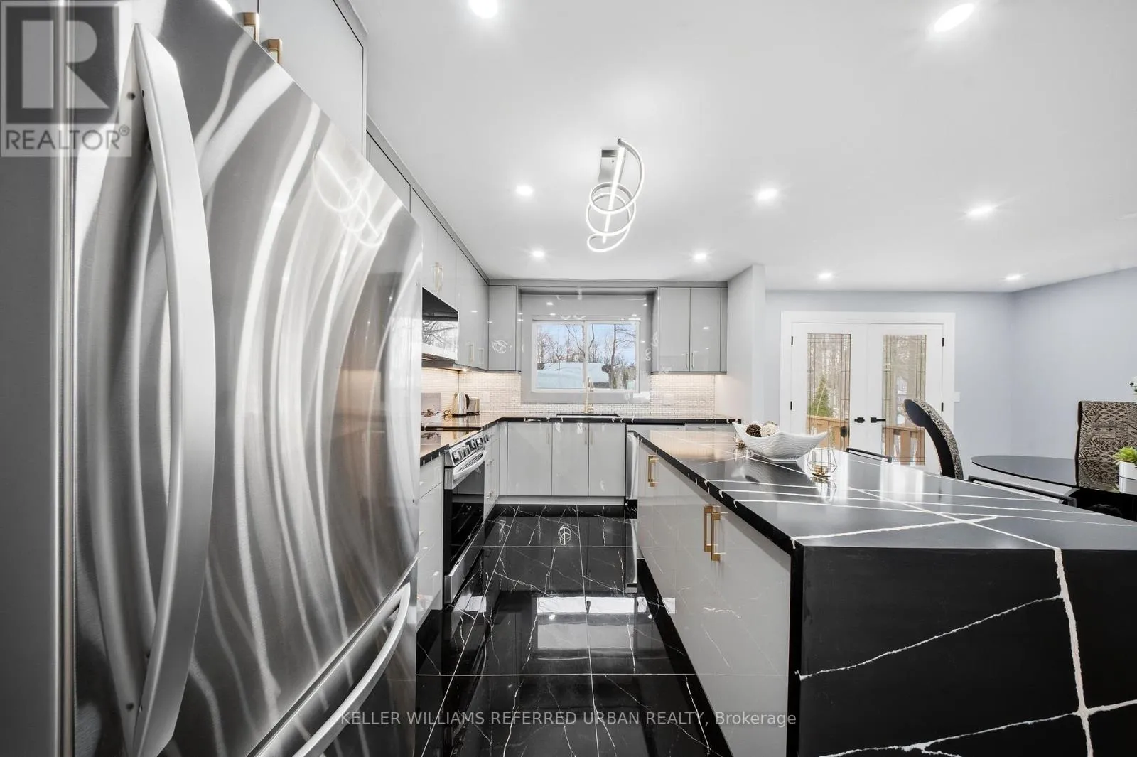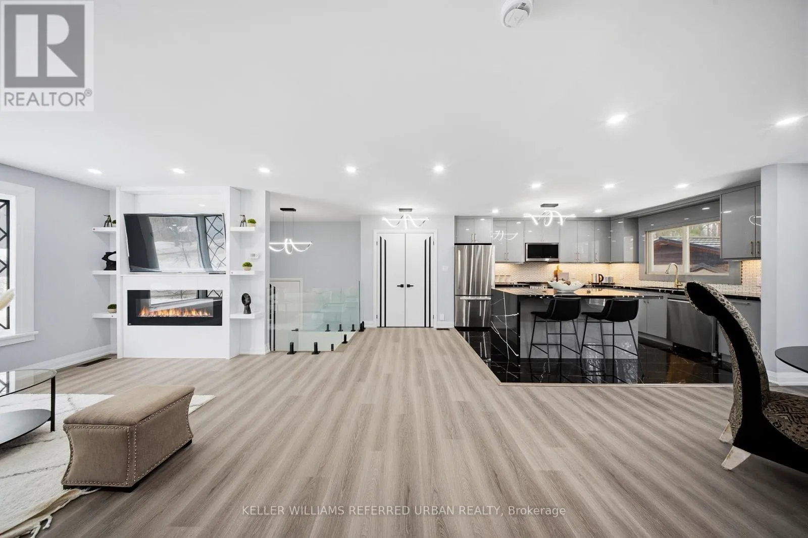 The bright open-concept layout creates an impressive great room ideal for entertaining, anchored by a welcoming living area featuring an electric fireplace, custom built-in shelving, and a sun-filled bay window that floods the space with natural light. The brand new designer kitchen is a true showpiece, complete with granite countertops, new stainless steel appliances, and an oversized island perfectly suited for hosting and everyday living. Retreat to the large primarily newly renovated 3-piece ensuite and beautifully updated spa-inspired bathrooms. Comfort and efficiency are enhanced with newer exterior & garage insulation, updated windows and doors, newer basement insulation, and a durable metal roof (under 15 years) with updated roof insulation. Outdoors, enjoy a spacious two-tier deck large enough for a gazebo, a 24 x 16 ft detached workshop, a garage with convenient backyard access, and a new gravel driveway at the rear for extra parking for your trailer and toys. Ideally located just 5 minutes from Friday Harbour Resort and 15 minutes to Barrie and Highway 400, this remarkable property seamlessly blends lakeside living, privacy, and luxury. (id:27476)