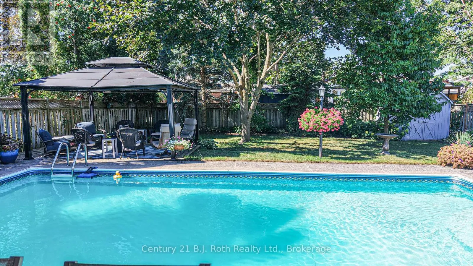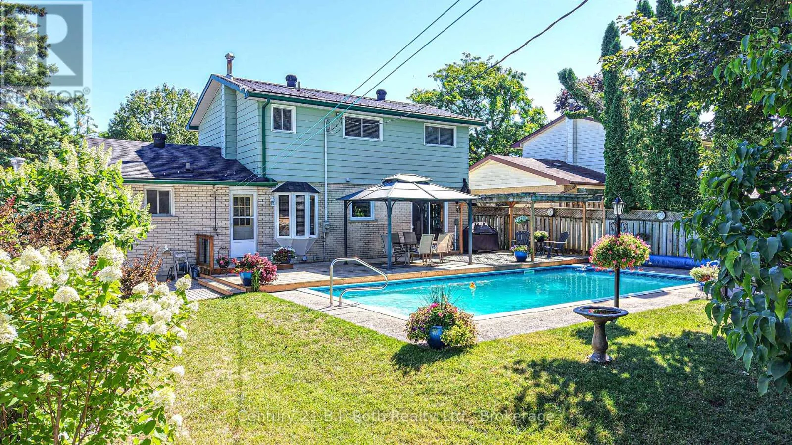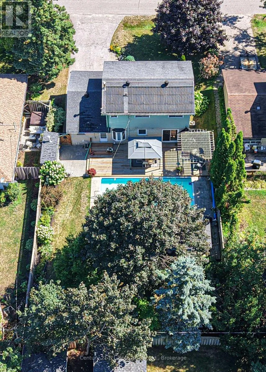 The spacious living room with bay window fills the space with natural light, while the adjacent dining area overlooks the picturesque back yard. The efficient galley-style kitchen boasts classic oak cabinetry, a cozy breakfast nook, and direct access to your fully fenced backyard oasis. A convenient 2-piece powder room is located on the main level. The original garage has been converted into a versatile space currently used as a main-floor laundry, but it would easily function as a playroom, home office, recreation room-or be converted back to a garage if desired. Upstairs, you'll find a beautifully updated 4-piece bathroom and four bedrooms, including one with a charming built-in desk/craft area and a spacious walk-in closet. The mostly finished basement offers a cozy family retreat complete with a gas fireplace and a bar area, ideal for relaxing or entertaining. Step outside to your private, treed, fully fenced backyard, featuring an expansive updated deck overlooking the inground pool, complete with a newer gas heater. Relax in the sunshine under the Pergola or choose to sit under one of the 2 Gazebos. It's the perfect setting for summer gatherings and family fun. Additional updates include windows & shingles. The home is equipped with natural gas heating and central air conditioning for year-round comfort. Located close to parks, schools, shopping, and just a short walk to downtown, this property offers the ideal blend of lifestyle and location. (id:27476)