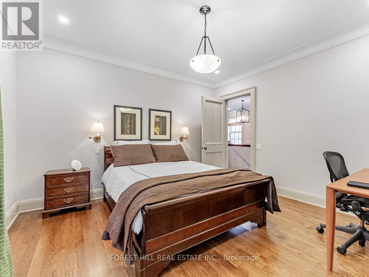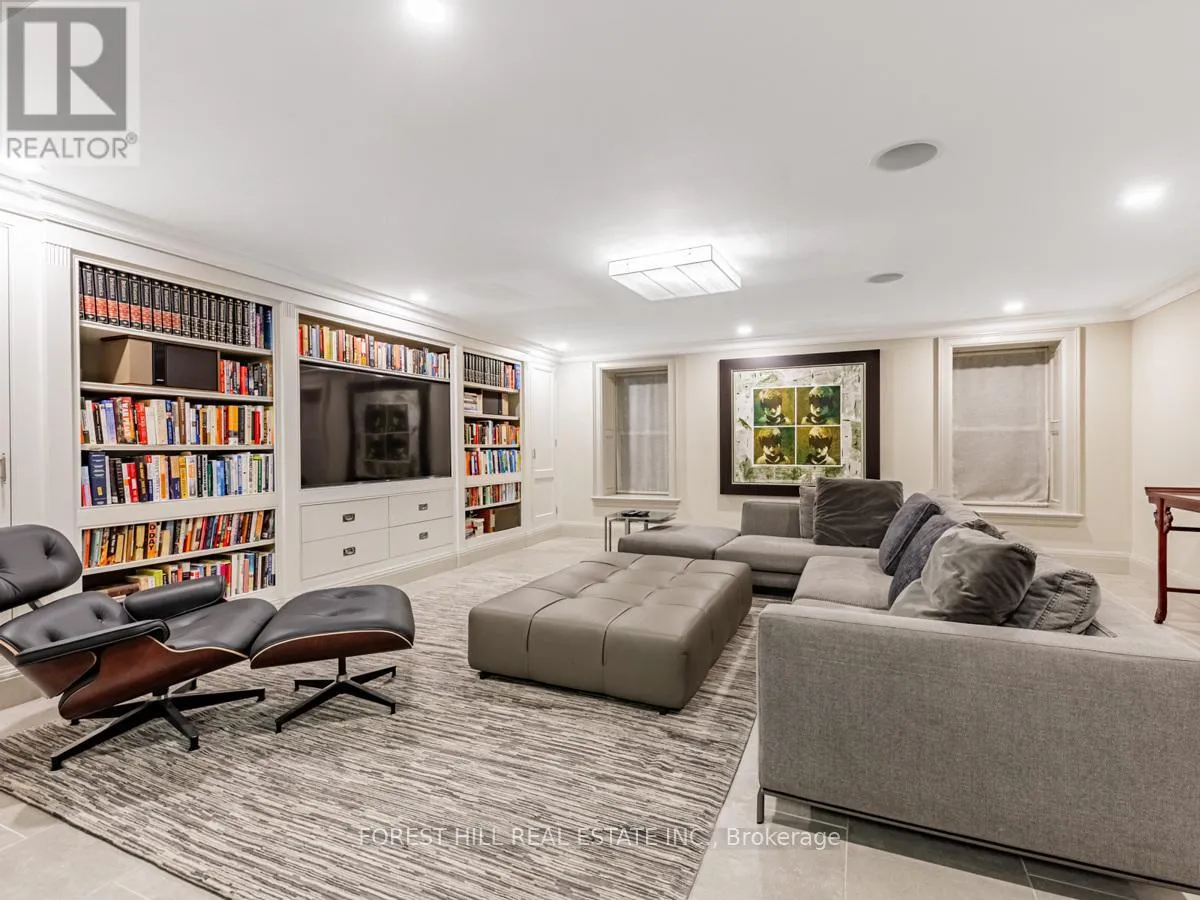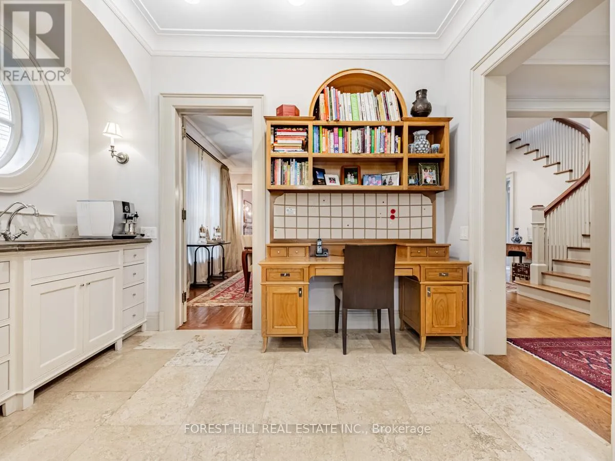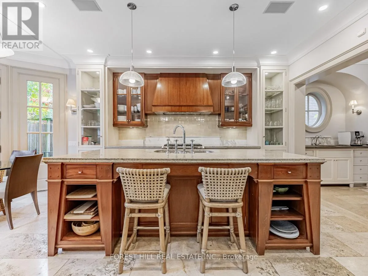 The gourmet kitchen offers a coffee station, built-in desk, oversized island, and a bright breakfast room with French doors opening to an oversized terrace, perfect for al fresco dining or quiet relaxation. The adjacent family room features a fireplace, custom shelving, and walk-out access to the stone terrace. Separate living and dining rooms provide additional versatility. A mudroom with a separate entrance and ample closet space completes the main floor, which boasts 9'6" ceilings. Upstairs, the south-facing primary suite offers a walk-in closet and spa-like ensuite with dual vanities. Three additional generously sized bedrooms with abundant closet space and large windows, along with beautifully appointed bathrooms, complete this level. The lower level features heated floors, a large great room with built-in bookshelves and a wall-mounted TV, a gym/office with built-in desks, and a fifth bedroom with a large closet. A fully-finished laundry room with ample storage, a walk-in wine cellar, and an additional four-piece bath provide exceptional convenience. The spectacular stone terrace leads to professionally landscaped gardens with a stone BBQ area. The detached stone garage, built in 2010, complements the homes exterior and features a heated driveway. Ideally located within walking distance to the best private schools (BSS and UCC, )as well as shops, restaurants, transit, and places of worship. This home offers the perfect blend of luxury, convenience, and style! (id:27476)