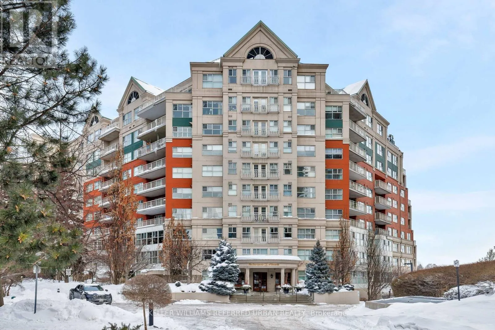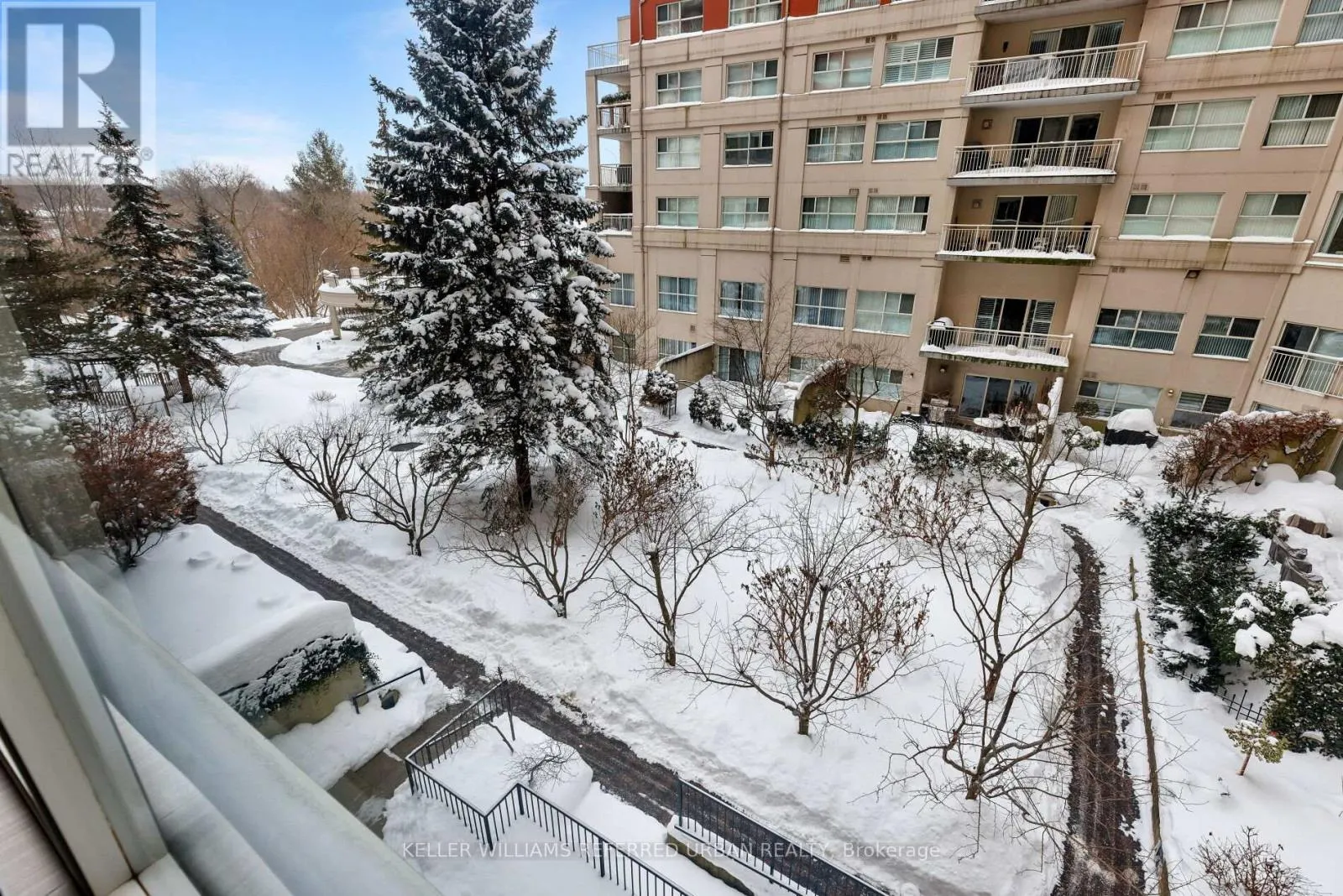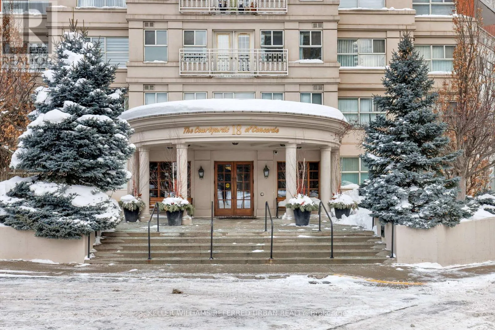 Wynford Dr & Concorde Pl Welcome to The Courtyards of Concorde Place, a private, luxury enclave in the heart of Don Mills. This sun-filled corner 2 bedroom + den, 2 bathroom suite offers approximately 1,550 sq. ft. and is tucked away in a quiet corridor with only six suites. Enjoy the rare convenience of same-level parking with step-in access-no elevator required. The spacious kitchen and dining area overlook a serene ravine, while the living room features a gas fireplace and walkout to a balcony with gas BBQ hookup.