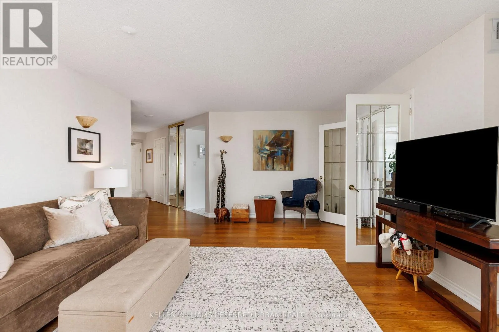 French doors open to a versatile den/home office. The primary bedroom accommodates a king-size bed and includes two closets and a 4-piece ensuite; the second bedroom offers a double closet. New engineered hardwood flooring throughout-no carpet. Personal in suite alarm system. Outstanding resort-style amenities include a saline pool and whirlpool, fitness centre, 24-hour concierge, guest suite, rooftop terrace, tennis court, and fenced dog run, bike storage, garden plots available, library, billiard room, private garden area with fish pond. Steps to Shops at Don Mills, TTC at the door with express service downtown. Parking: #1-52 (same level) | Locker: UC Level #66 |Pet-Friendly Building. Welcome Home! (id:27476)