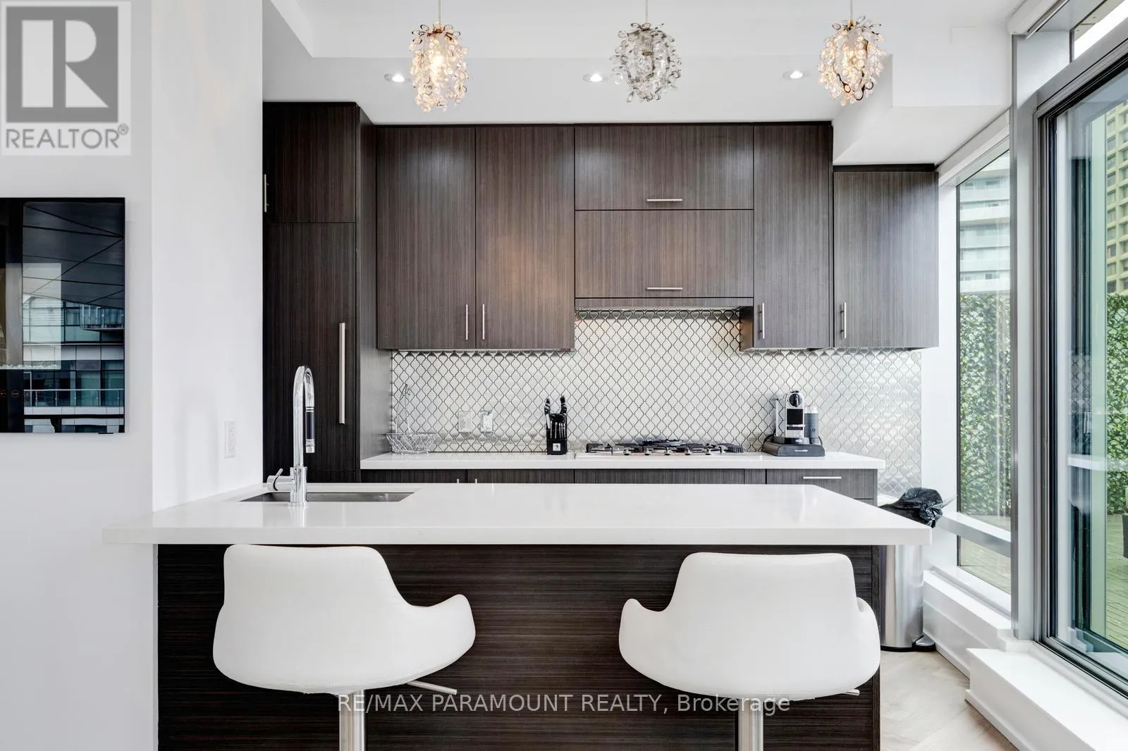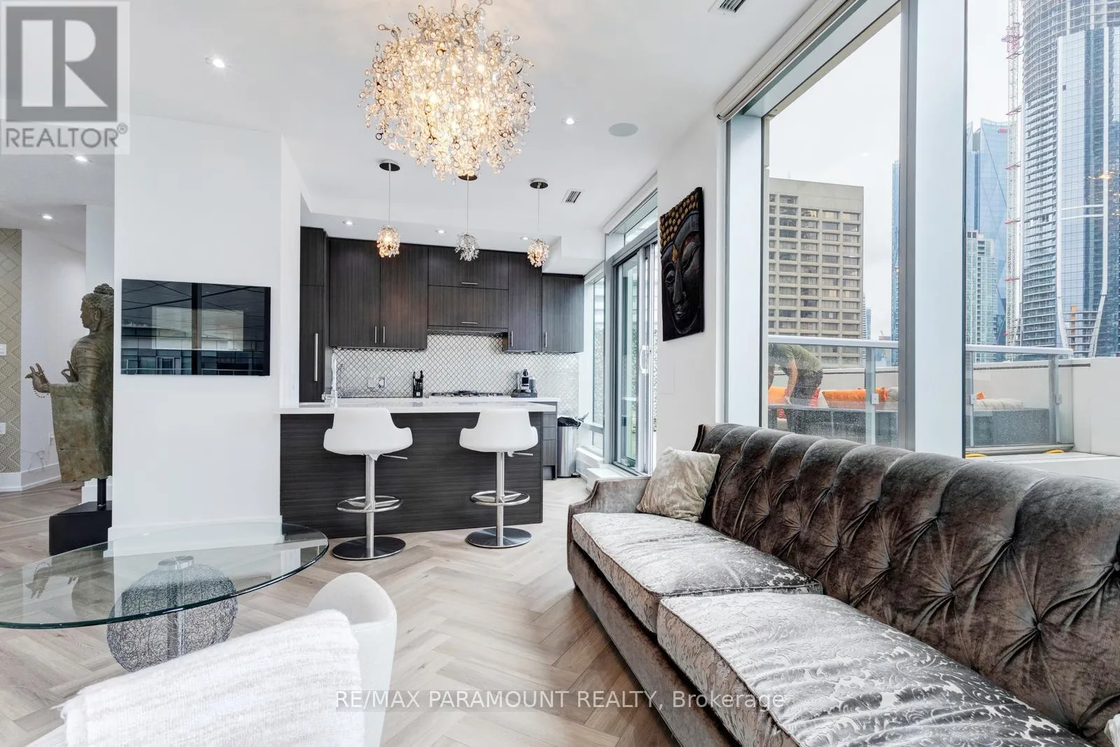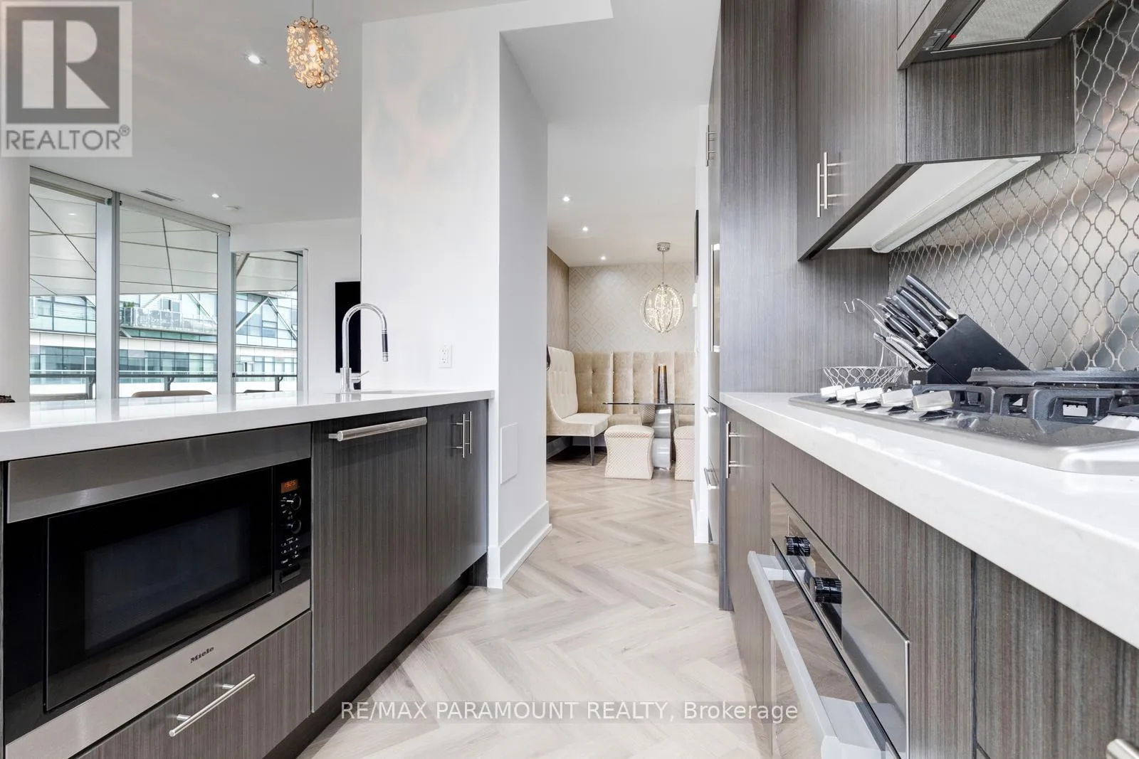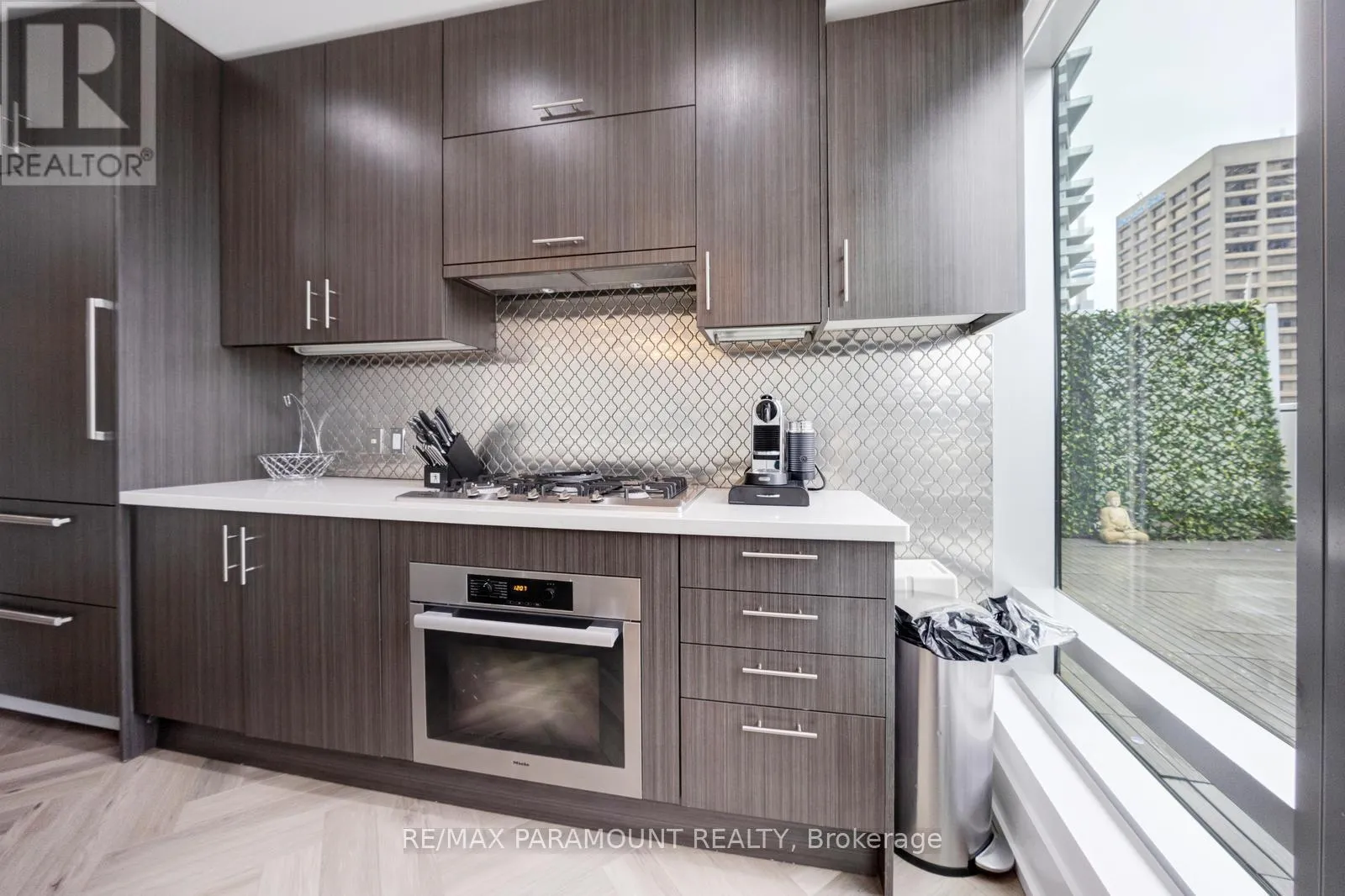 Yonge St & Queens Quay E Stunning Designer Residence with Private Terraces & Smart Home Features. Step into this spectacular, upgraded home featuring a grand living room illuminated by elegant pot lights and enhanced with automated floor-to-ceiling curtains. Soak in the natural light from expansive windows, and enjoy seamless indoor-outdoor living with a walk-out to your large private terrace. The modern chef-inspired kitchen is a true show stopper equipped with a Downsview Kitchen, sleek modern-profile cabinetry, Miele appliances, gas cooking, granite countertops, and a stylish breakfast bar perfect for entertaining or everyday living.