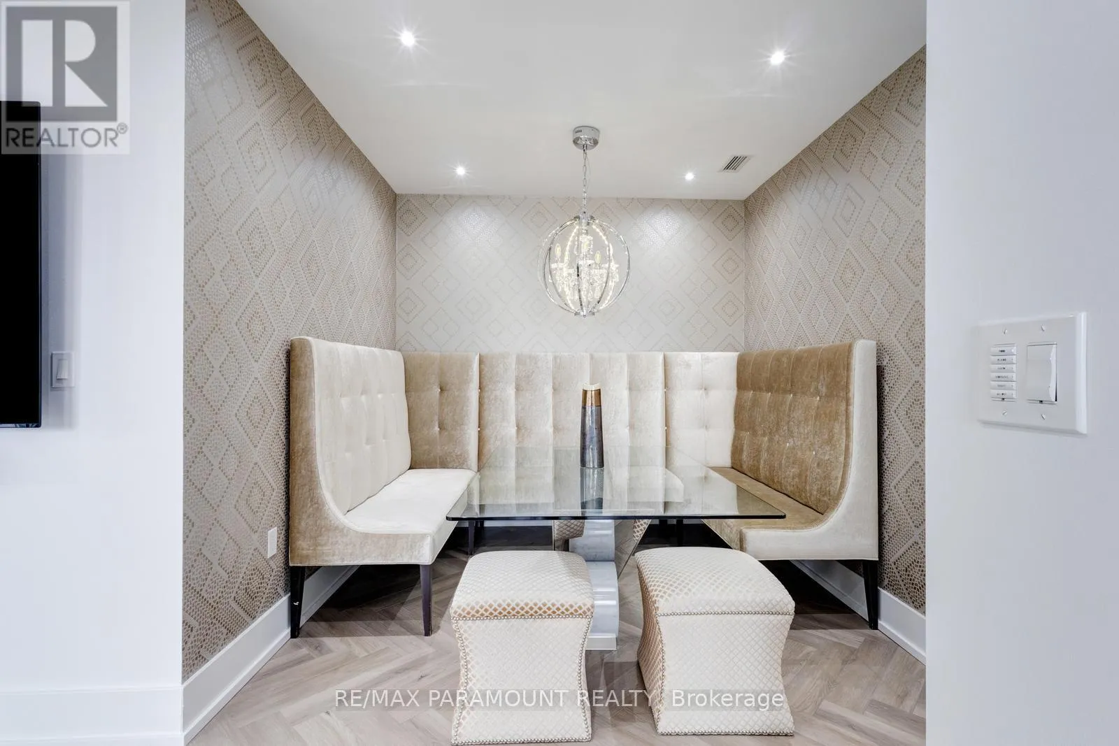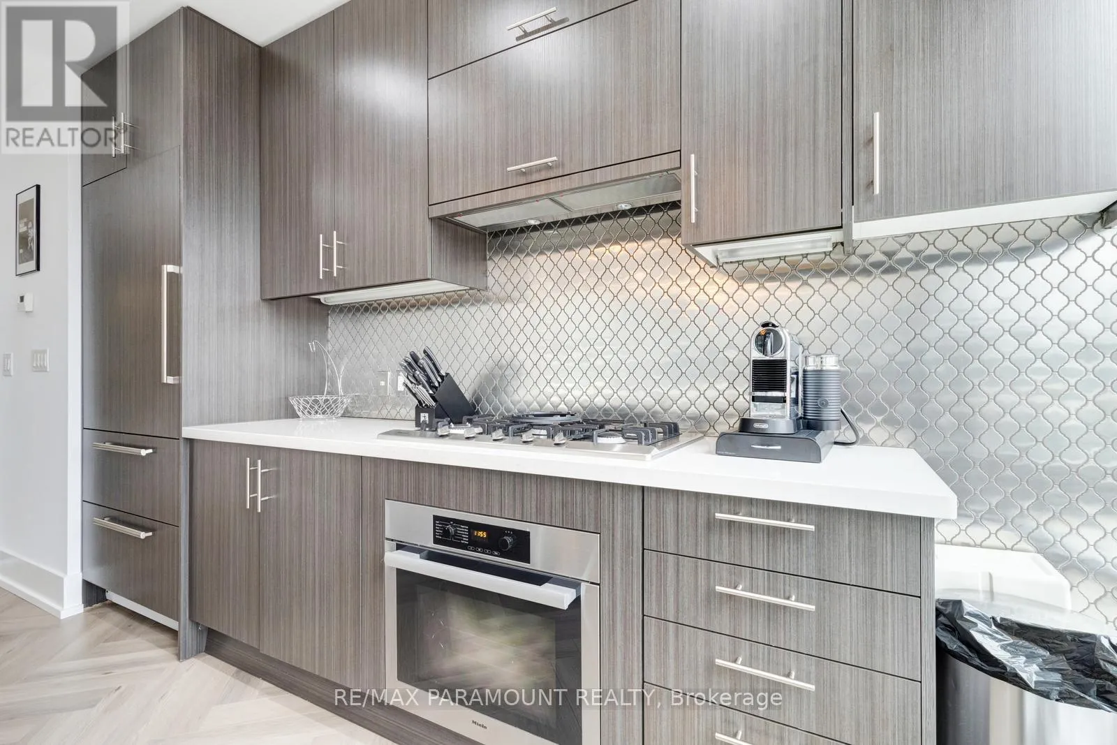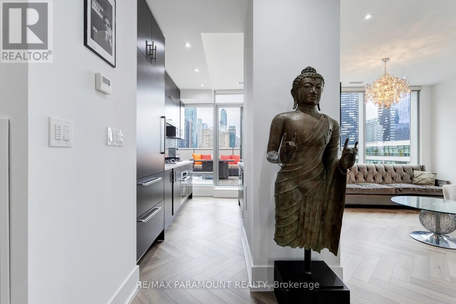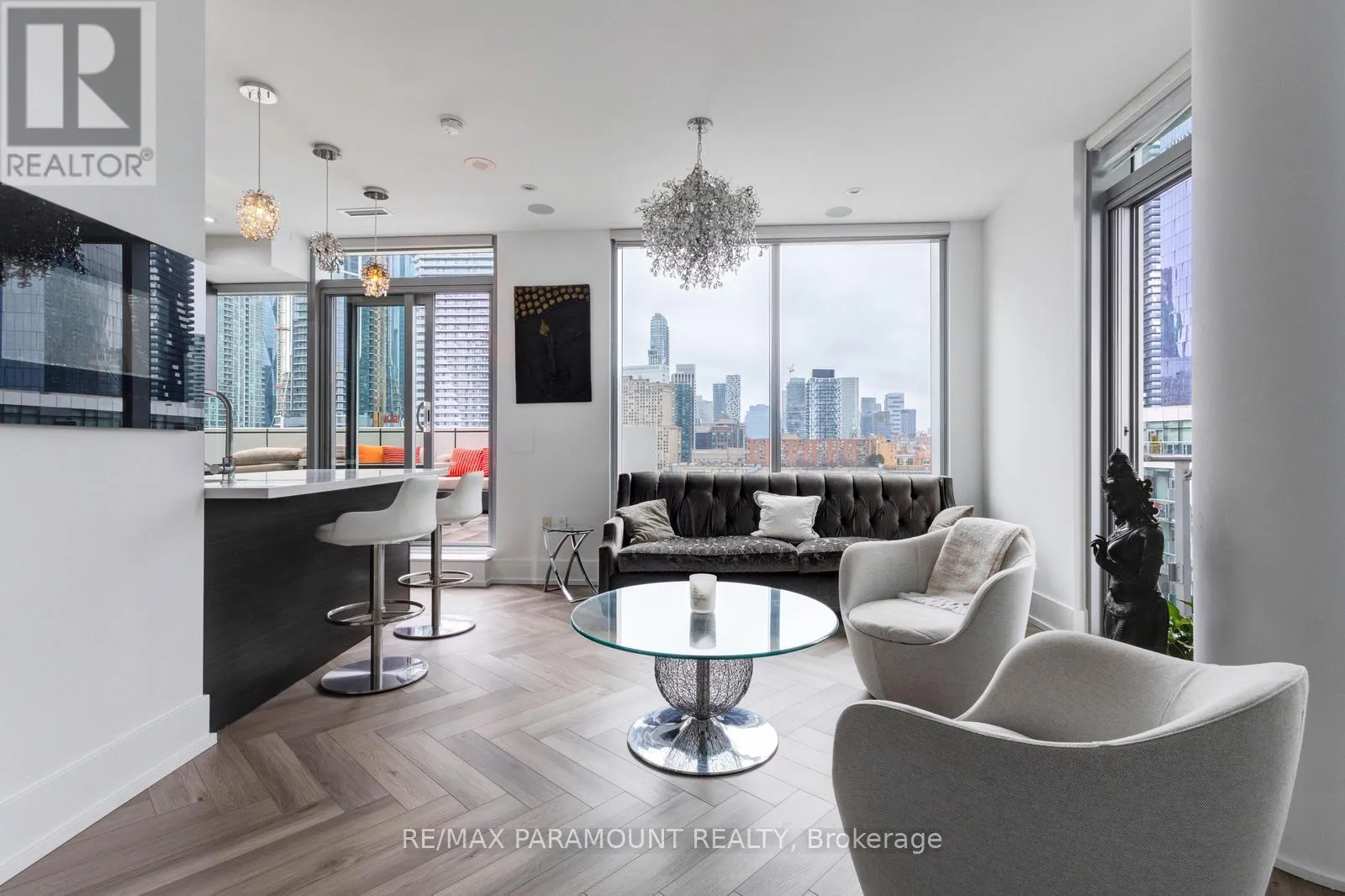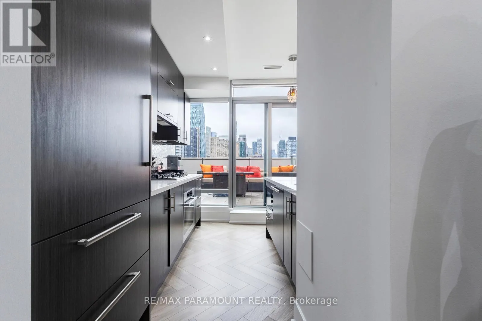 Yonge St & Queens Quay E Stunning Designer Residence with Private Terraces & Smart Home Features. Step into this spectacular, upgraded home featuring a grand living room illuminated by elegant pot lights and enhanced with automated floor-to-ceiling curtains. Soak in the natural light from expansive windows, and enjoy seamless indoor-outdoor living with a walk-out to your large private terrace. The modern chef-inspired kitchen is a true show stopper equipped with a Downsview Kitchen, sleek modern-profile cabinetry, Miele appliances, gas cooking, granite countertops, and a stylish breakfast bar perfect for entertaining or everyday living.