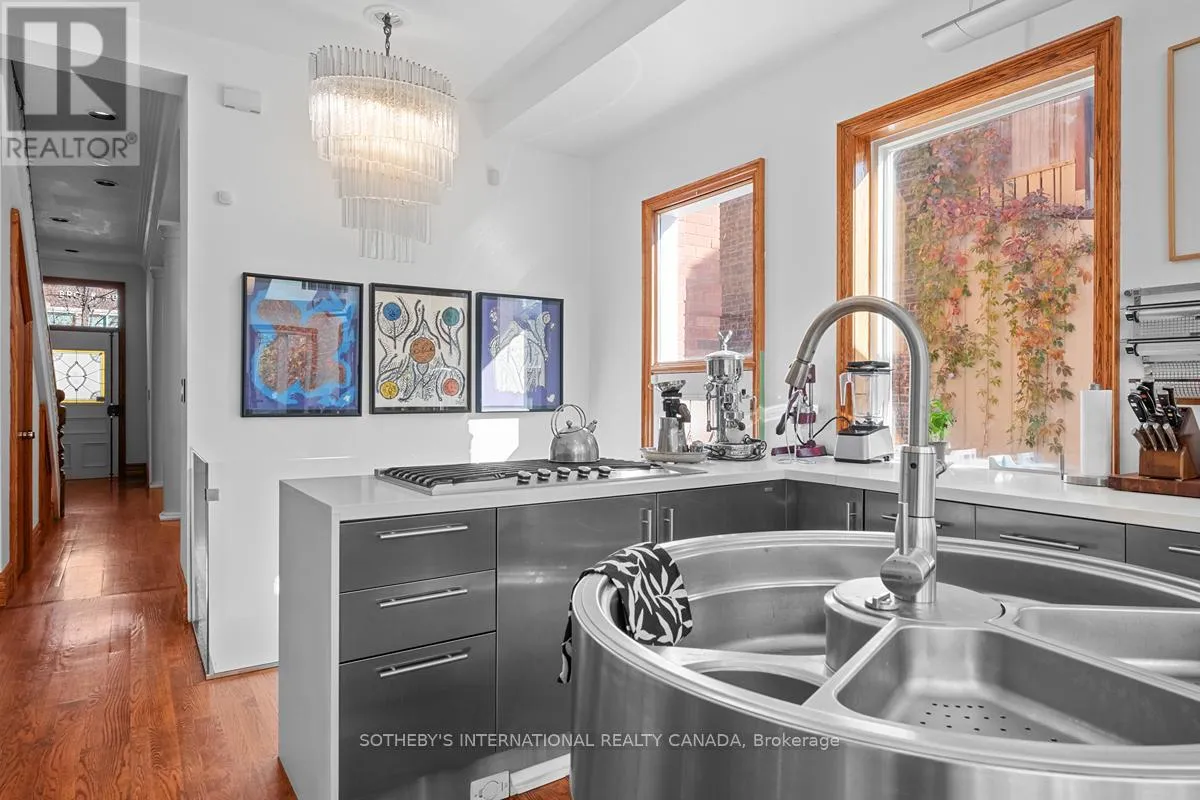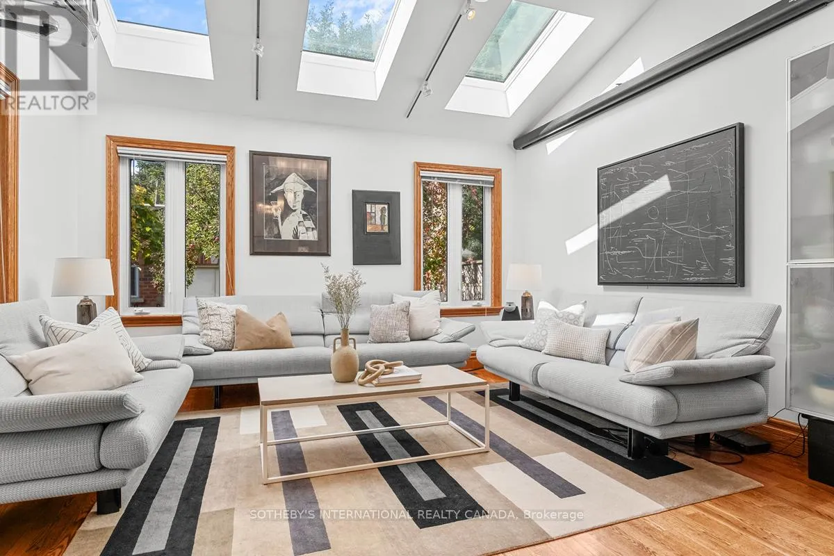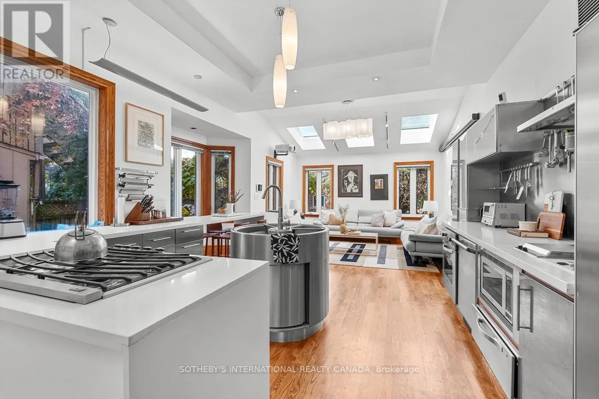 The result is a perfect blend of striking modernity + timeless craftsmanship. Sun-drenched interiors framed by towering windows reveal soaring 12-ft ceilings, exquisite oak flooring + trim, elegant crown mouldings + charming original bannisters. The stunning Scavolini kitchen is a culinary dream - fully integrated with white Caesarstone countertops, sleek stainless steel cabinetry, appliances, double-door pantry + slide-out storage. At its centre is an award-winning rotating water station that makes wash + prep effortless without sacrificing counter space. A cozy breakfast bar overlooks the private side patio through a bright bay window. The sunlit family room is perfect for red-carpet movie nights beneath a trio of skylights. The second floor hosts the spacious primary bedroom, a second bedroom + a third bedroom currently used as a home office with access to the first of two sundecks. The third floor features a cozy fourth bedroom, a jewel-like 3-pc bath lined in shimmering Bisazza mosaic tiles + another large sundeck with spectacular sunset views. The lower level offers a fully soundproofed media room currently used as a bedroom, a full 4-pc bath, a convenient laundry/utility room. A self-contained, privately accessed basement studio apartment with a 4-pc bath provides an excellent opportunity for supplementary income or multi-generational living. Please see the attached Property Information Sheet for a detailed list of features, updates, inclusions + exclusions. (id:27476)
