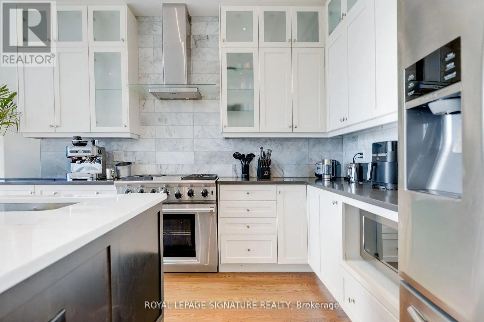 At The Heart Of The Home, The Gourmet Kitchen Impresses With Soaring 12-Ft Ceilings, Illuminated Cabinetry, Premium Quartz Countertops, A Large Centre Island, And Stainless Steel Appliances. The Adjacent Family Room Continues The Sense Of Scale With Matching 12-FtCeilings, A Fireplace, And Direct Access To The Deck And Professionally Landscaped Backyard. The Upper Level Offers Three Well-Proportioned Bedrooms With 9-Foot Tray Ceilings, Enhanced By Abundant Natural Light From Skylights And Contemporary Glass Railings. With Four Bathrooms In Total, Including Three Full Baths And A Main-Floor Powder Room, The Home Is Well Suited For Both Family Living And Entertaining. The Lower Level Features 9-FootCeilings And A Walk-Up To The Backyard, Offering Flexible Space For Recreation Or Extended Living. The Basement Is Also Roughed In For Radiant Floor Heating. Refined Finishes Include Flagstone Walkway, 9.5" Baseboards, 4.5" Poplar Backbend Casing, Hardwood, Marble, And Porcelain Flooring, Generous Storage, An Integrated Security Camera System, And A Built-In Garage. Located In One Of Toronto's Most Desirable Waterfront Communities, This Is A Rare Opportunity To Own A Truly Turn-Key Home (id:27476)