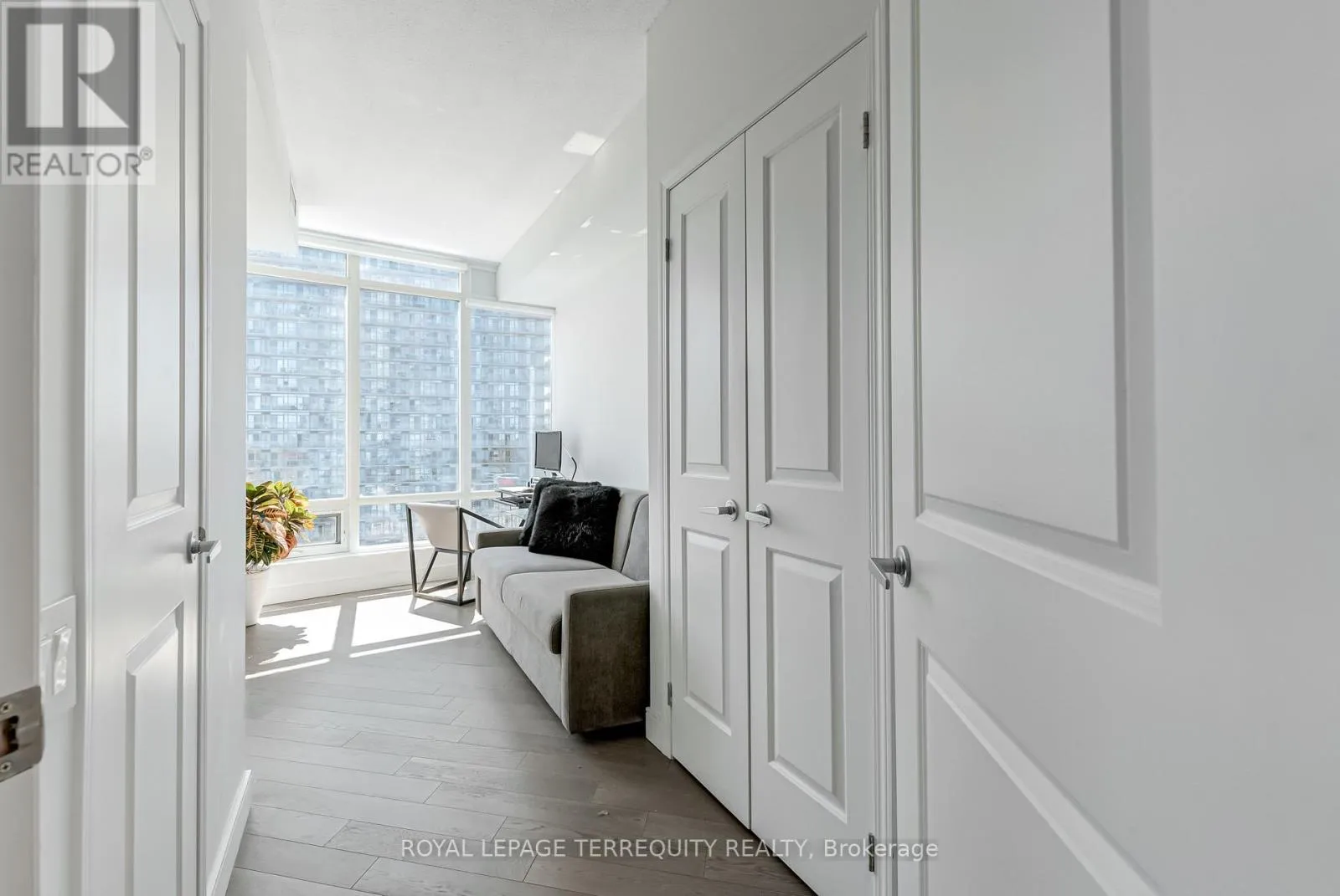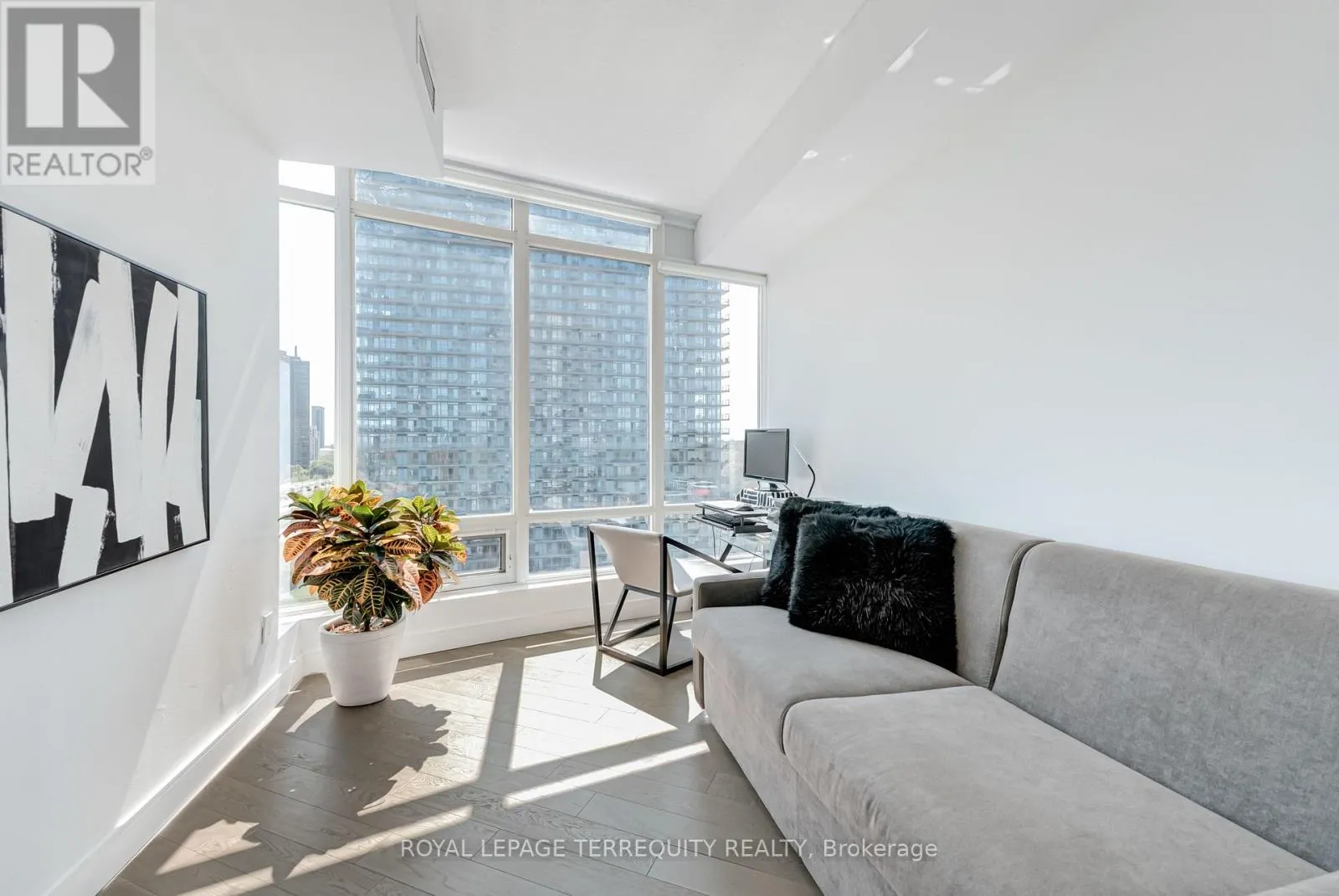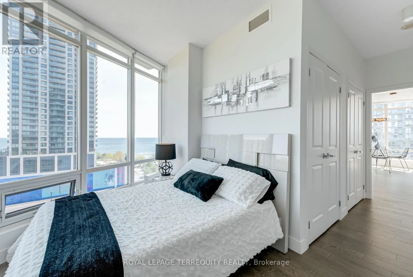 Enjoy breathtaking 180-degree panoramic views of the city skyline, shoreline, and sunsets through dramatic 9-ft floor-to-ceiling windows. A wall of glass fills the open-concept living and dining area with natural light, creating a warm and expansive atmosphere. Step onto the balcony to unwind and take in golden hour over the lake. A sleek, contemporary kitchen appointed with a quartz waterfall island, countertops, backsplash, and top-of-the-line appliances. The versatile den overlooks the main living space and can function as an office or nursery. The primary bedroom offers a 4-piece ensuite and double closets, while the second bedroom features floor-to-ceiling windows and ample storage. Premium interior upgrades include designer lighting, custom frosted glass panels with backlighting in both bathrooms, custom designed kitchen, upgraded quartz countertops with waterfall edges, and superior hardwood flooring throughout. Nestled in a lush waterfront enclave, this residence offers the perfect blend of serenity and city life. Just mins from High Park, Sunnyside Beach, Grenadier Pond, and the Lake Ontario boardwalk- nature and leisure await. You're also under 8 minutes to the charm of Bloor West Village with cozy cafes, fine dining, artisan markets, and boutique shopping. With top-rated schools, hospitals, seamless transit, and only 20 minutes to downtown, every urban convenience is easily within reach. (id:27476)