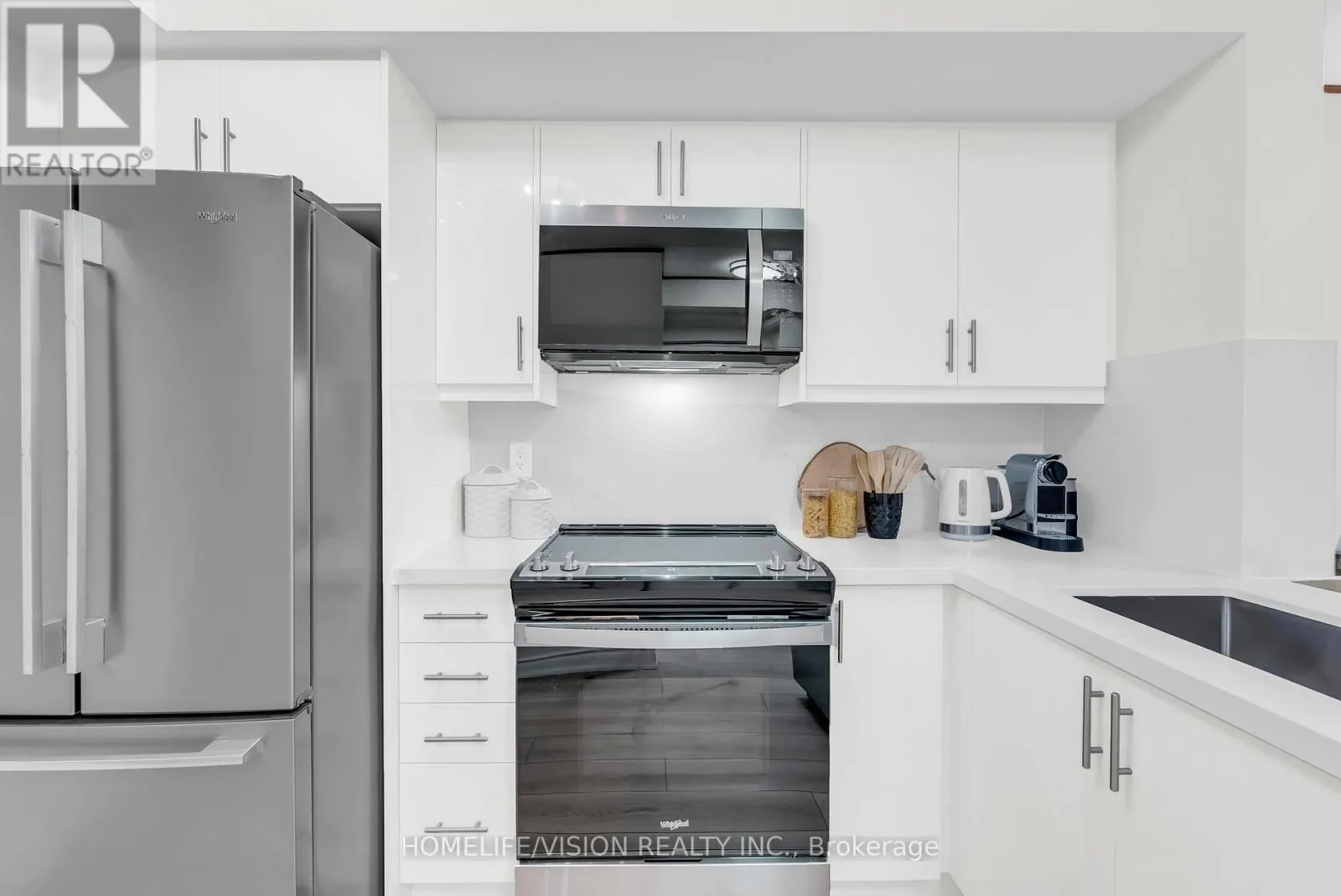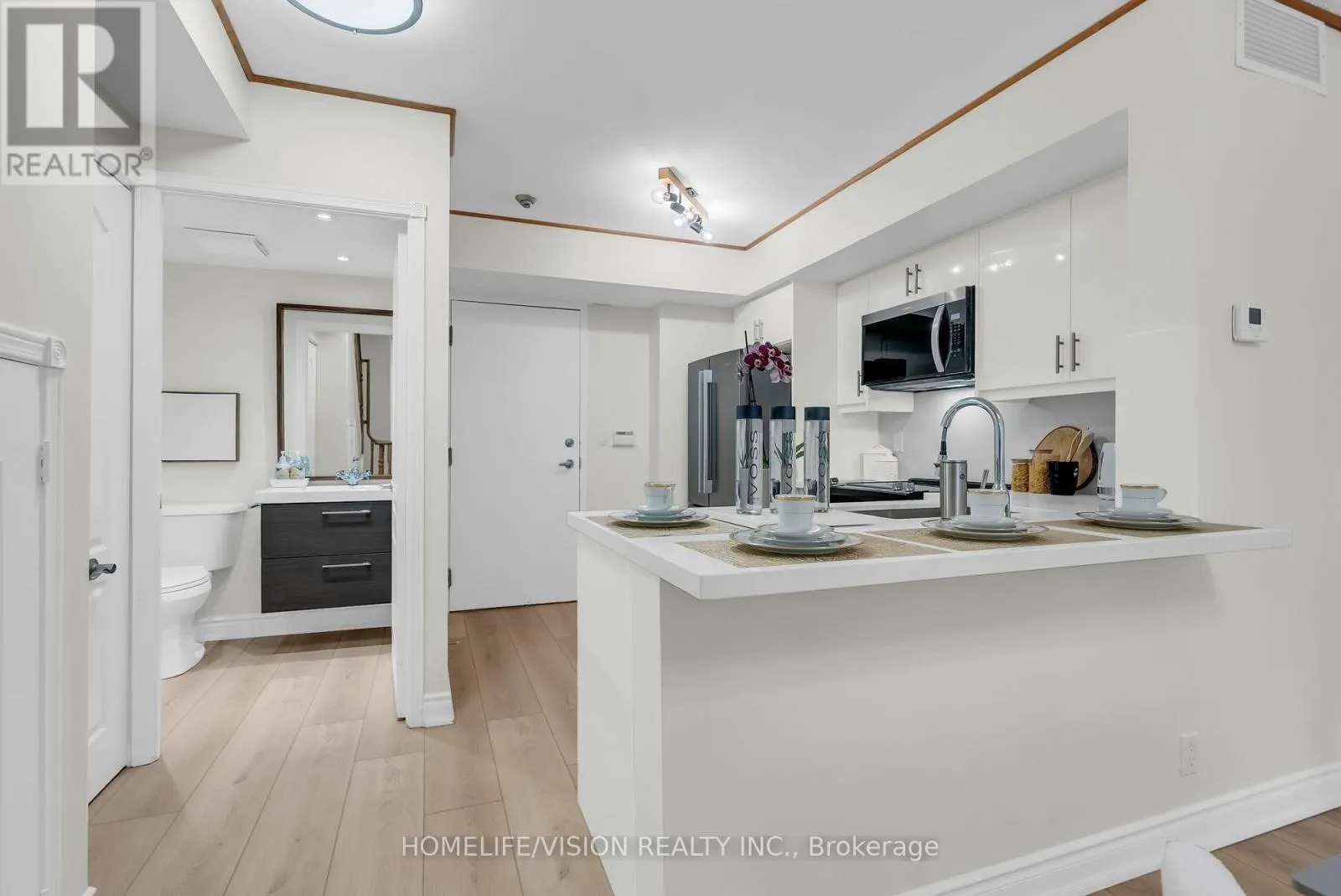 Yonge/Finch Outstanding townhouse in a quiet gated community (1492 sqft), SOUTH exposure with park view, renovated, walking distance to Subway, family friendly complex, featuring private balcony with gas BBQ hookup. Newly renovated flooring (12mm Vinyl throughout first floor and entrance stairs) , soft-touch custom cabinets (brand new), Quartz backsplash and countertops, deep kitchen sink, faucet (MOEN), brand new GE appliances (French-door fridge, range, microwave, dishwasher).