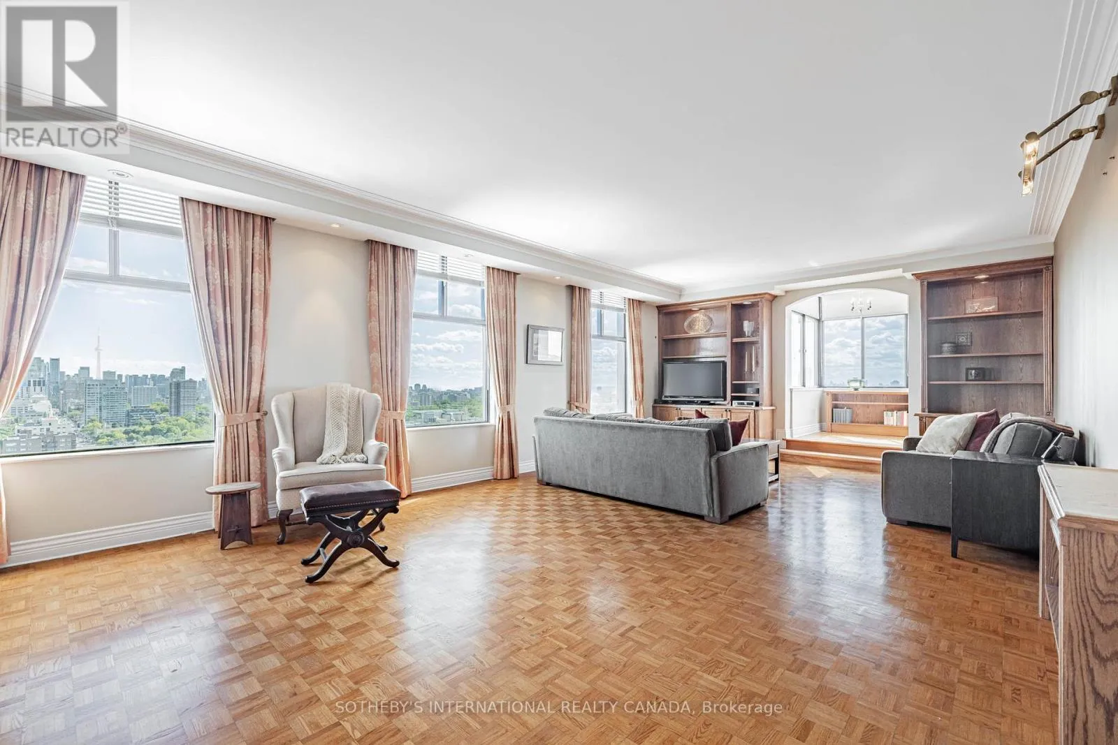 5 baths, and a flexible den or sunroom ideal for a home office, library, or quiet retreat. The enclosed sunroom delivers a truly serene experience, surrounded by sweeping city vistas.The open concept living and dining areas are thoughtfully updated with elegant parquet flooring, custom built-in bookcases, and pot lighting throughout. A renovated kitchen features granite counters, quality appliances, and a functional layout suited to both everyday living and entertaining.The primary suite includes a well-appointed 5-piece ensuite. The second bedroom enjoys its own private 3-piece ensuite, offering comfort and privacy for guests or family.One suite per floor ensures an exceptional level of privacy and exclusivity. Additional features include ensuite laundry, one underground parking space, and an out-of-suite locker.An outstanding opportunity just steps to Yonge and St. Clair shops, restaurants, parks, top schools, and the TTC. Luxury living paired with unmatched convenience. Some photos have been virtually staged. (id:27476)