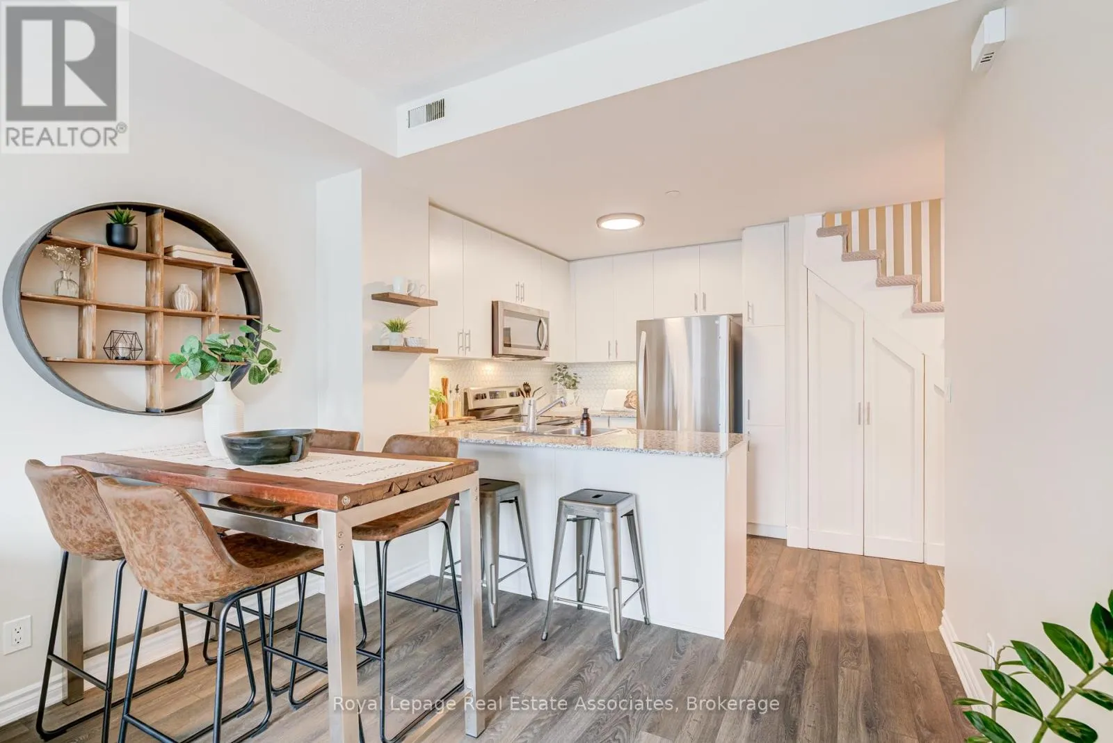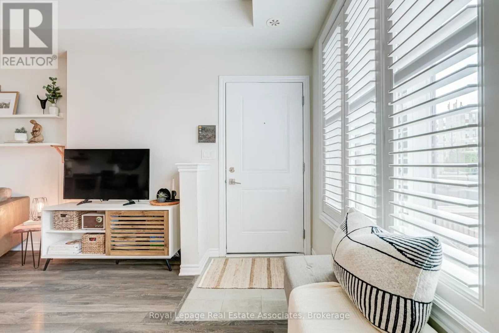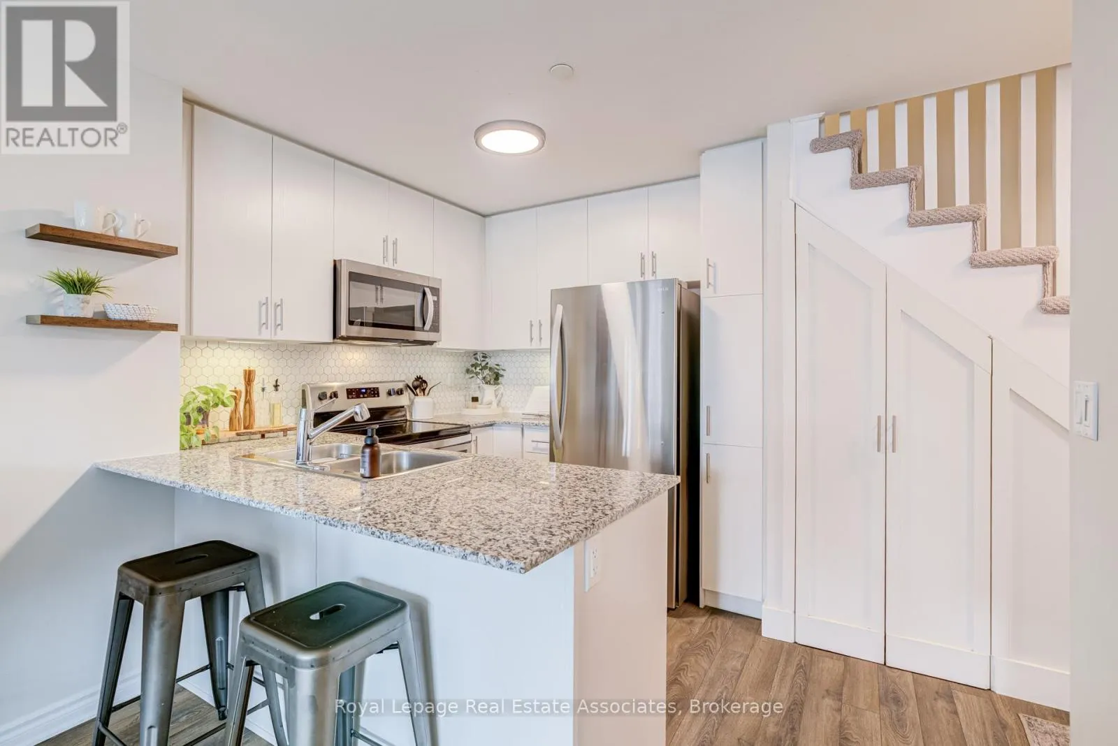 Thoughtfully designed with 981 sq ft of bright, functional space, this 2-bedroom, 2.5-bath home features an open-concept main level. Tucked along the outer edge of the complex, this suite enjoys a clearer view and beautiful evening light through its west-facing windows. The private terrace perfect for relaxing evenings and summer entertaining. The modern kitchen is finished with quartz countertops and a sleek backsplash. Upgrades large and small make this a charming, move-in-ready option: next to the kitchen and under the stairs, the owners have added a walk-in storage area, crucial for many uses. You'll find upgraded light fixtures, California shutters in the living room, a roller blind on the patio door, and cordless cellular shades in the bedrooms. This is a welcoming, community-oriented complex centred around a playground and green space. The owners love the ability to walk to cafes (Terminal 3), bakeries (Happy Bakers & Sourdough Garden), restaurants (850 Pizza), yoga studios (Solis), and daily essentials. Sherway Gardens and major highways are a 5 min drive. Enjoy the convenience of underground parking while paying a low maintenance fee. Visitor parking is available right out front of the home. Come be a part of one of Etobicoke's most vibrant and growing communities! (id:27476)