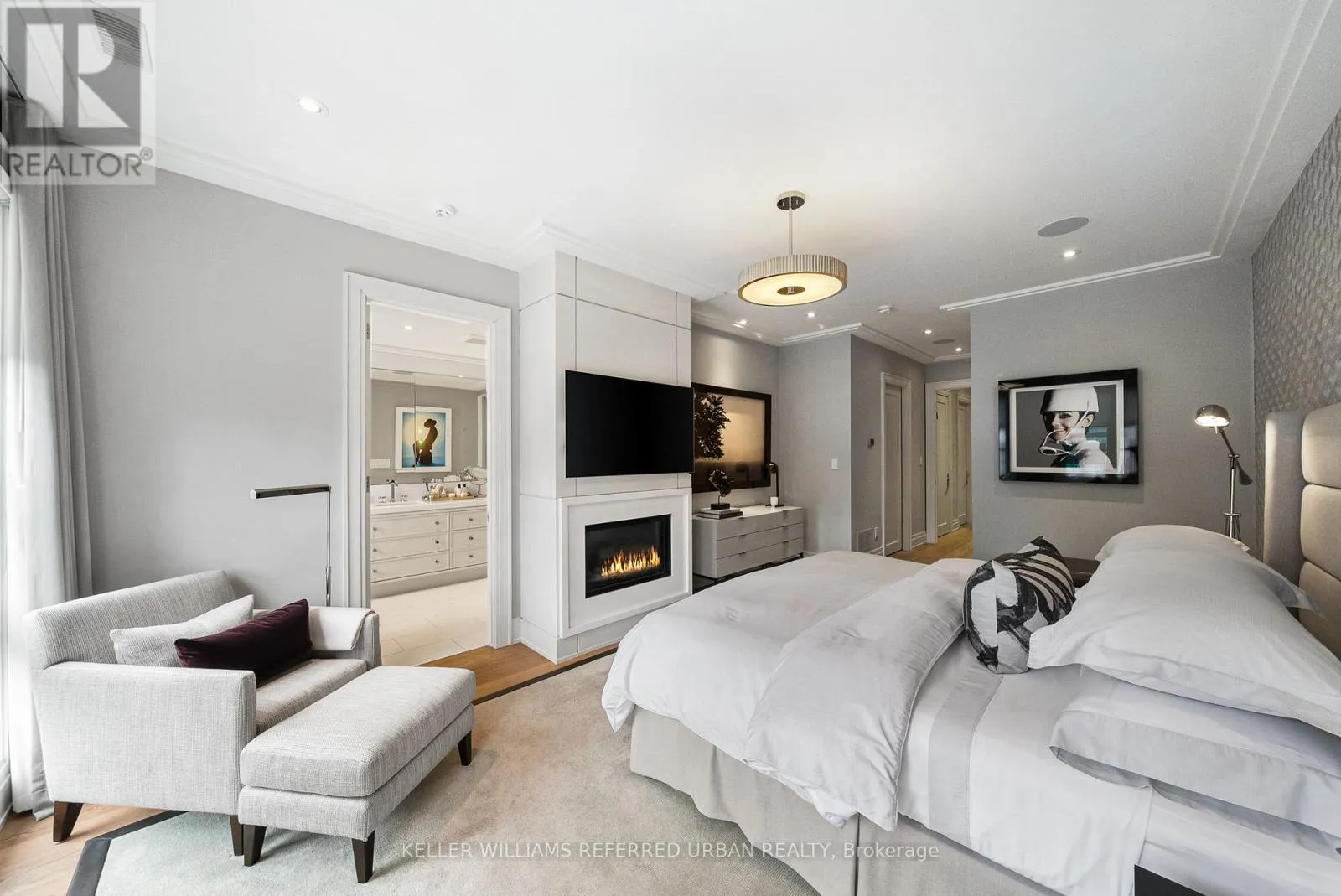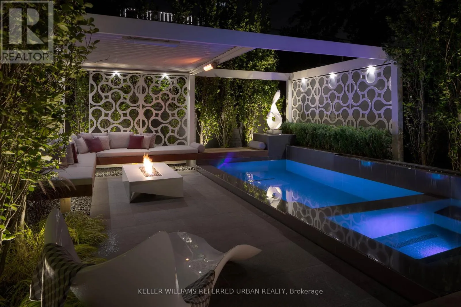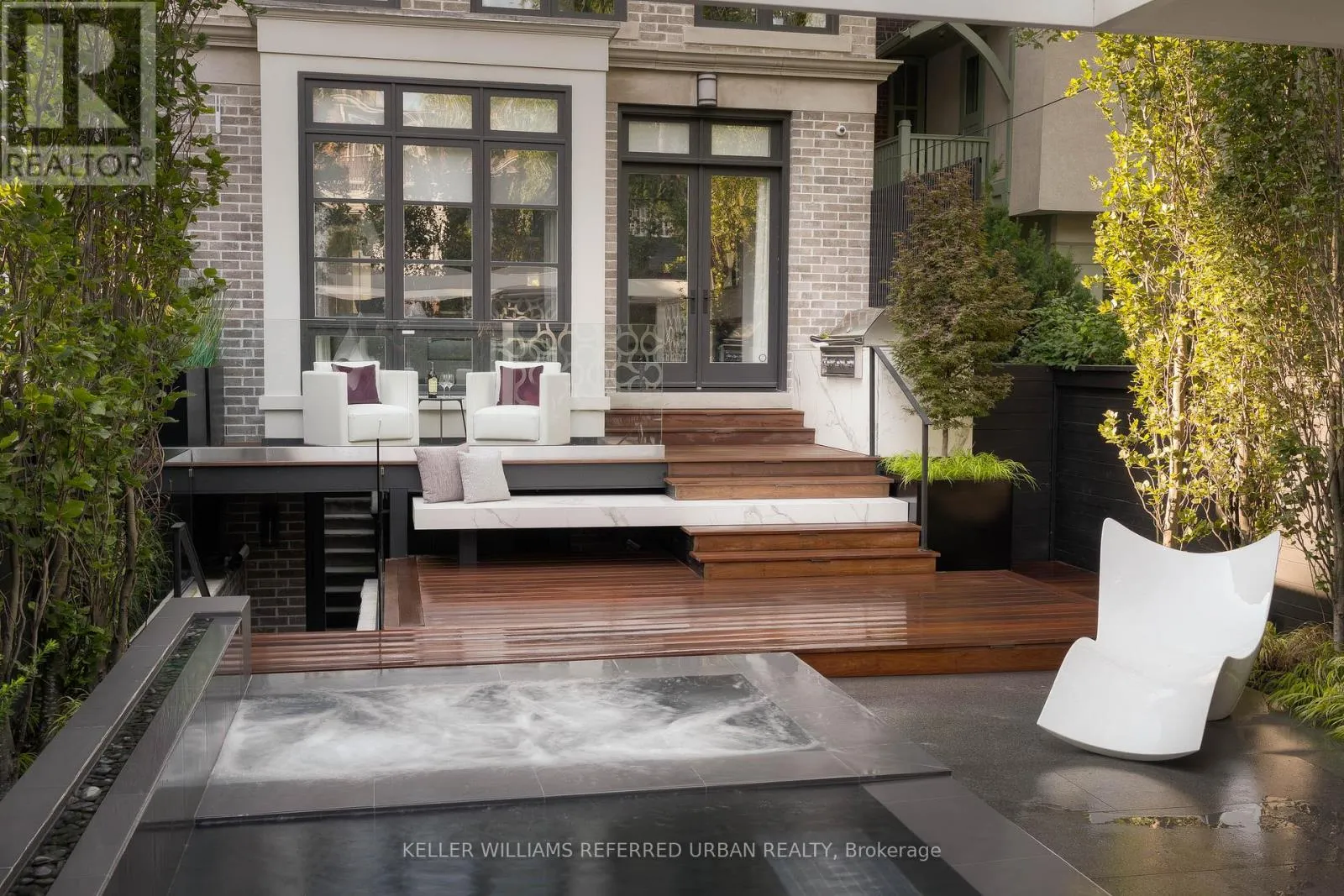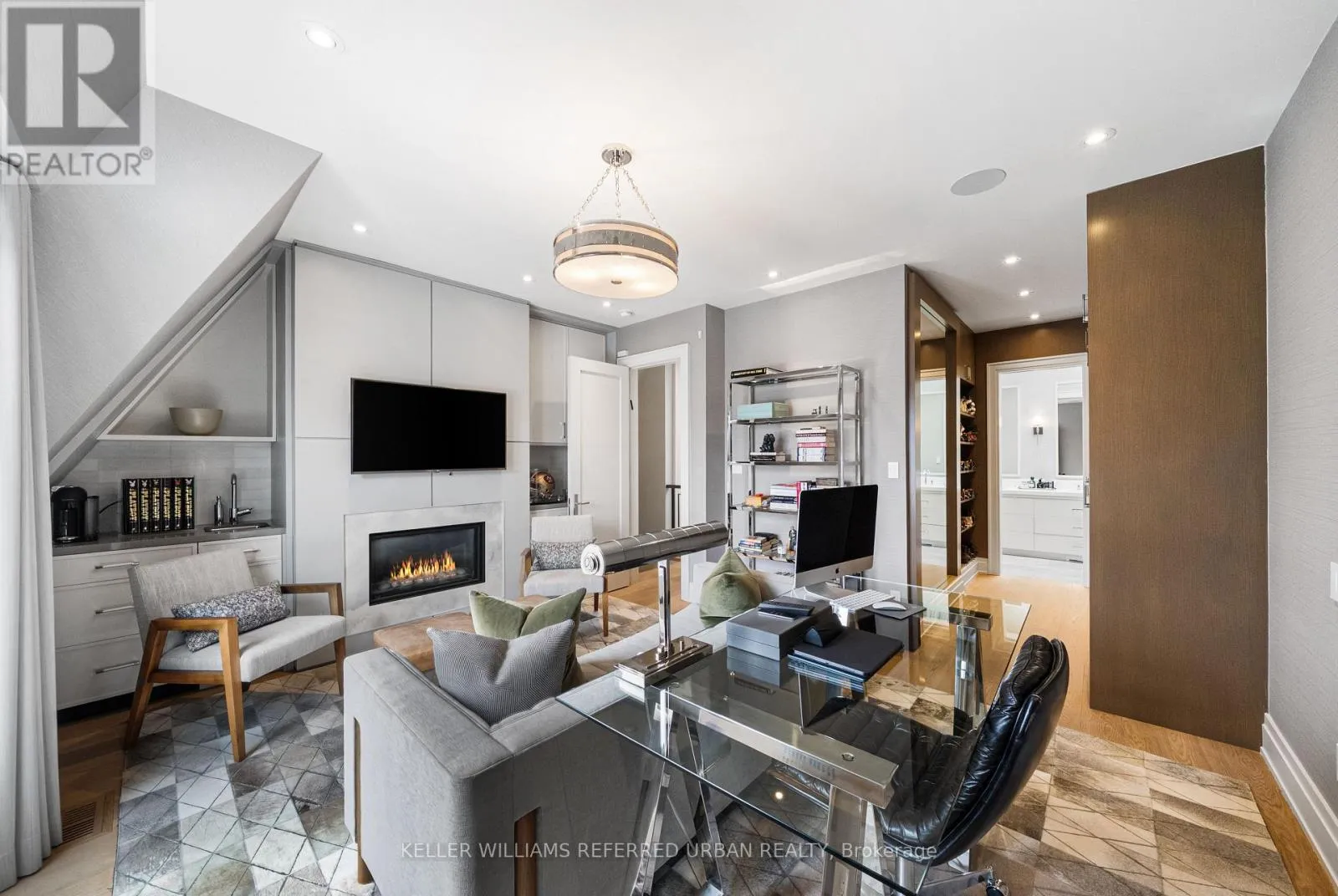 At the heart of the home, a chef's kitchen - featuring a 48" Wolf gas range, an expansive 8-foot marble top island, and bespoke finishes throughout. The adjoining family room is both inviting and refined, anchored by a gas fireplace and seamlessly connected to your private award winning (TopLandscape Design of the Year (2018) backyard oasis - complete with a pool and hot tub, perfect for entertaining or unwinding in total privacy. Upstairs, the second level offers a tranquil retreat. The primary suite evokes a five-star hotel experience, with a gas fireplace, ambient pot lighting, and his and hers walk-in closets. The spa-inspired 5-piece ensuite features a deep soaker tub, steam shower, double vanity, and heated marble floors. A second bedroom on this level includes its own 3-piece ensuite and walk-in closet, while a convenient laundry room completes the floor. The third level offers exceptional versatility - ideal as a secondary primary suite or an executive home office. This stunning space features a gas fireplace, a luxurious 3-piece ensuite, and a private minibar, creating the perfect self-contained retreat. Walk out to a sun-drenched south-facing terrace with captivating CN Tower views. A fourth bedroom with its own private terrace provides additional space for family or guests. The lower level is designed for both lifestyle and function - showcasing a custom, 500 btl. climate-controlled wine cellar, a fully equipped home gym, a media/rec room, and a 3-piece bath. A thoughtfully designed mudroom leads to the heated 1-car garage, while a heated driveway and front steps provide the ultimate convenience. (id:27476)