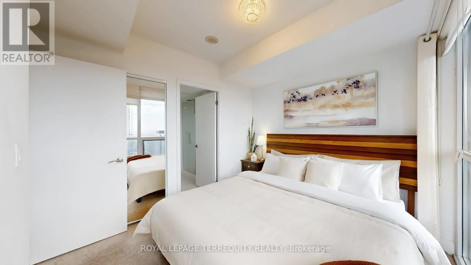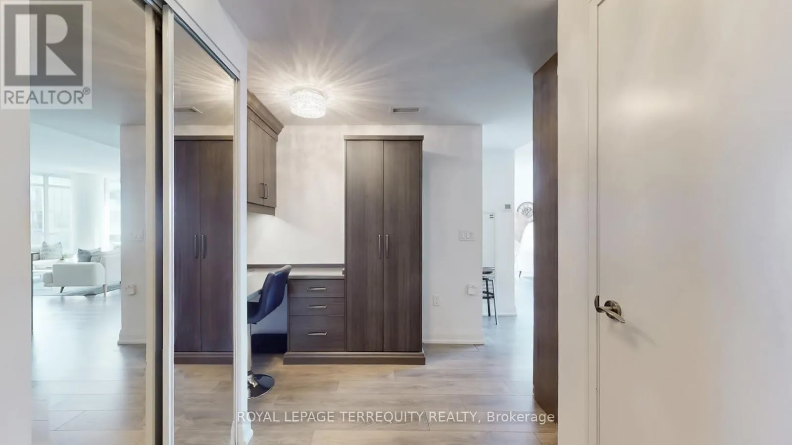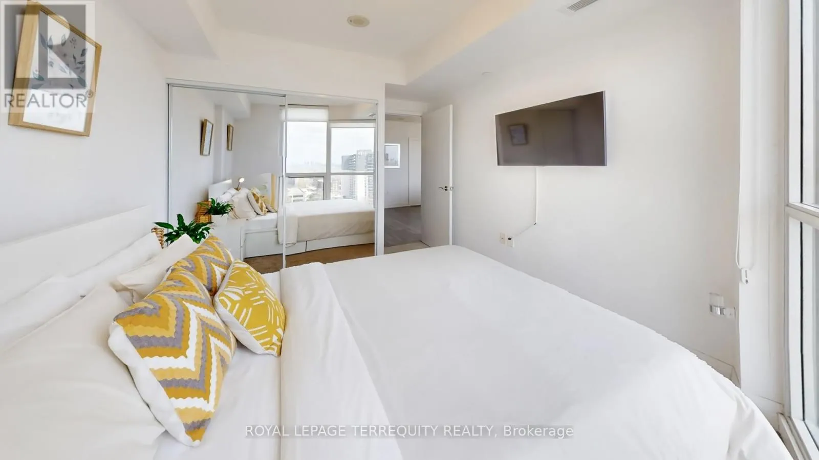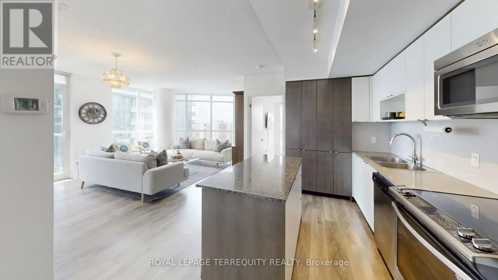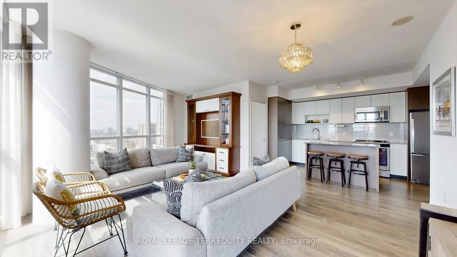 The open-concept living, dining, and kitchen area is designed for both everyday living and entertaining. The spacious living area is anchored by a custom-built TV unit with integrated shelving, while the dining space flows seamlessly into a gourmet kitchen featuring sleek countertops, modern appliances, and extensive cabinetry for ample storage. Both bedrooms are generously sized and include customized closets with built-in organizers to maximize space and efficiency. The two well appointed bathrooms offer great proportions and are equipped with additional storage units for everyday convenience. The thoughtfully designed study is tucked into a quiet alcove, creating a highly functional workspace. Complete with a built-in desk and custom shelving, this versatile area is perfect for a home office, study nook, or creative retreat offering both comfort and efficiency without compromising the flow of the main living space. Step out onto the south facing balcony to enjoy the beautiful panoramic views with your morning coffee or evening relaxation. Completing this exceptional offering is an incredible parking space paired with a huge double locker/bike storage conveniently located adjacent to the parking providing unmatched ease and ample storage. An exceptional opportunity to own a bright, upgraded corner suite that delivers on space, functionality, and stunning views. The building amenities include 24 hour concierge, gym, indoor pool, party room, guest suites, sauna, and more! Steps to shopping, public transit, parks, library and all major highways. (id:27476)