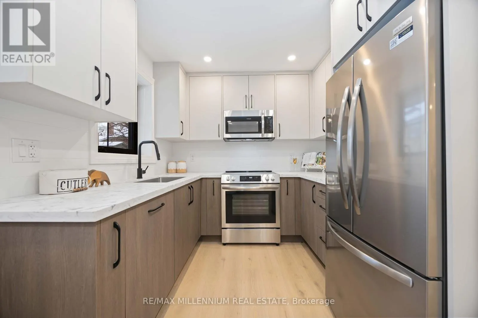 Both kitchens are fully equipped with stainless steel appliances, including 2 fridges, 2 stoves, 2 over-the-range microwaves, and 2 dishwashers (one custom-panelled, one stainless), along with 2 washers and 2 dryers for added convenience.This home has been extensively renovated inside and out, including newer sleek black windows, doors, and garage door, sleek black updated soffits, eavestroughs and downspouts, electrical, plumbing, insulation, fencing, and deck also updated. Exterior upgrades include a new concrete main entrance landing, asphalt driveway, 6x6 retaining wall, and custom garden planter boxes.Interior highlights include a custom oak staircase, wide-plank white oak hardwood flooring throughout the main floor, luxury vinyl flooring in the basement, 7" baseboards, updated window and door casings, all new interior doors, and custom cabinetry in both kitchens, bathrooms, and laundry areas. Additional features include pot lights, updated interior and exterior lighting, fresh paint throughout, Nest thermostat, furnace, A/C, and hot water tank.Enjoy a walkout from the main-floor bedroom to the deck via new patio doors, plus a fully separate basement walk up entrance-making this home move in ready. (id:27476)