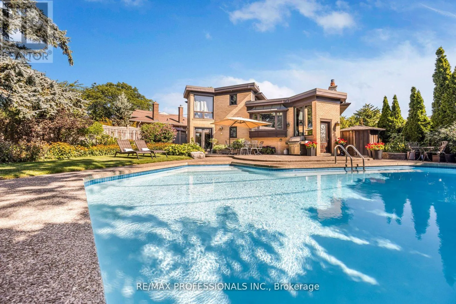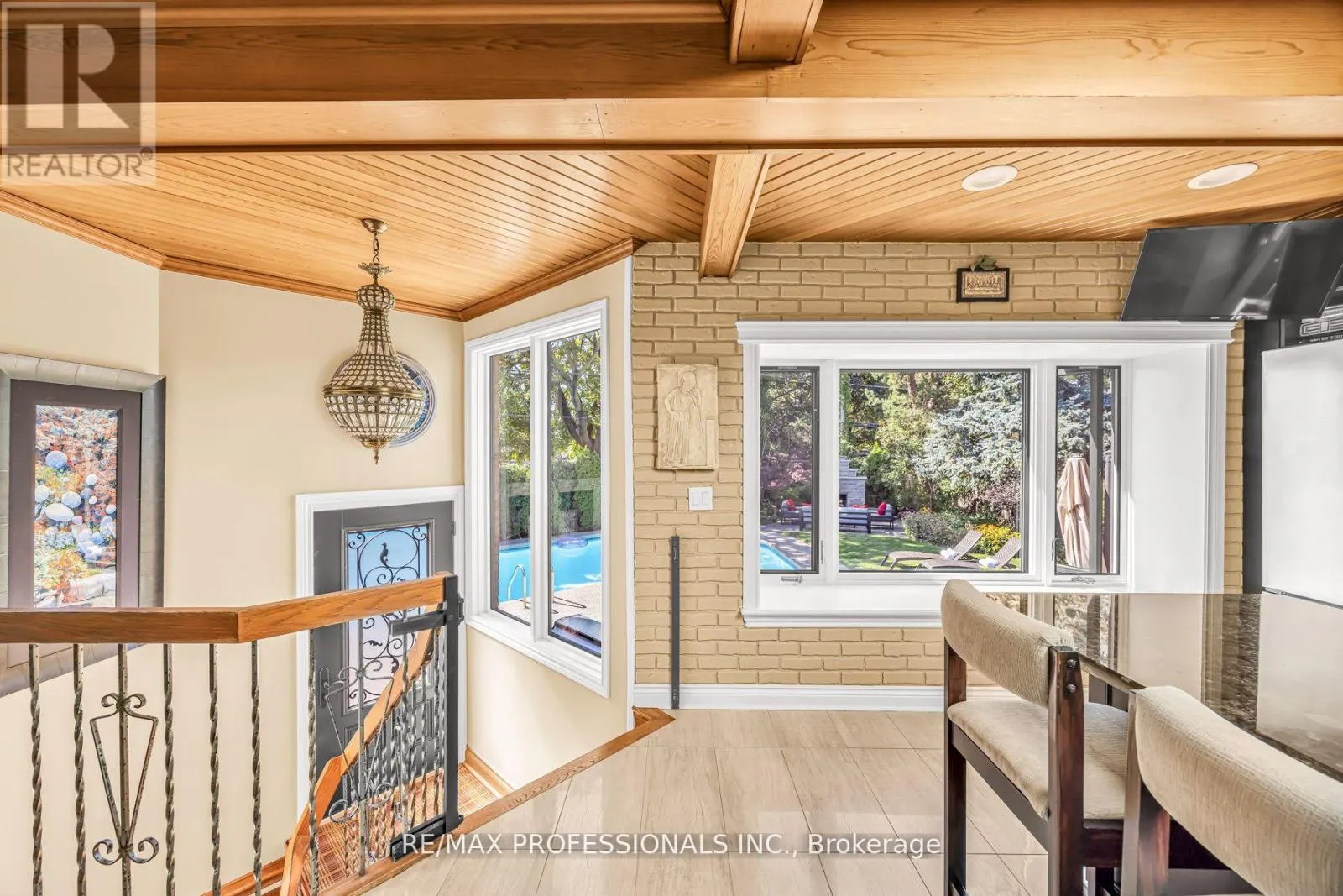 NW of Royal York Rd & Eglinton Ave West One-of-a-Kind, Customized Home with 3-Level Extension & Pool on a Pie-Shaped Lot! Enjoy private, resort-style living in this extensively customized 4-level sidesplit set on a quiet, tree-lined street & backing onto Green Meadows Park and Father Serra School grounds. Stunning stone exterior(2019) with ornate chimney, custom Amberwood solid wood door, stamped concrete driveway, and wrought-iron fence (2025)/gate provide timeless curb appeal.