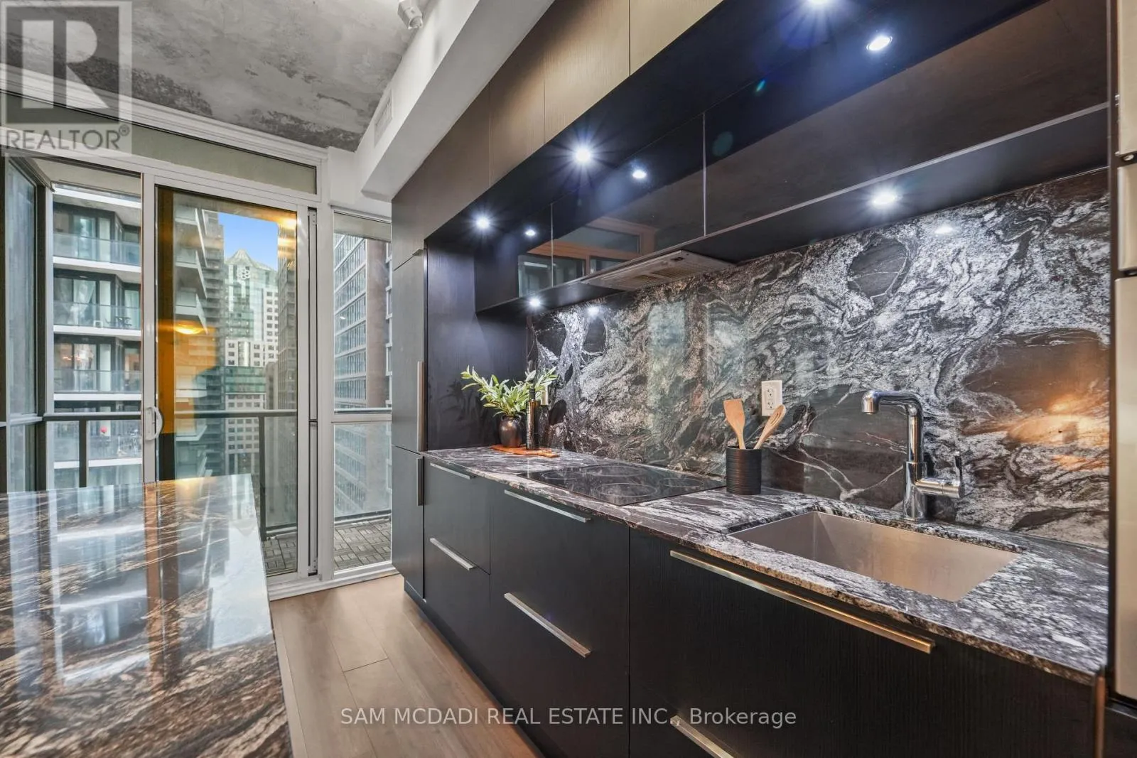 The hallway leads into an open-concept living space where exposed concrete ceilings, hardwood floors, and floor-to-ceiling windows create a modern, loft-inspired aesthetic. The sleek designer kitchen, crafted with interiors by Studio Munge and Kravitz Design Inc., features bold quartz countertops, a centre island, a custom marble backsplash, integrated stainless steel appliances, and generous prep space that flows naturally into the living and dining area, making it perfect for entertaining or casual dining. Beyond the living space, sliding doors lead to a private balcony overlooking the vibrant downtown skyline and the CN Tower. The thoughtfully separated bedroom provides a quiet retreat with ample storage, and convenient access to an updated 4 piece bath. Residents enjoy access to full-service amenities including a rooftop infinity pool, a state-of-the-art fitness centre, a billiards room, a party lounge, and 24-hour concierge service and more. Enjoy on-site fine dining option, including the acclaimed Akira Back and KOST, one of the city's most coveted rooftop destinations. Located steps from Rogers Centre, Scotiabank Arena, the underground PATH, and TIFF Bell Lightbox, this residence places the very best of downtown Toronto at your doorstep. (id:27476)