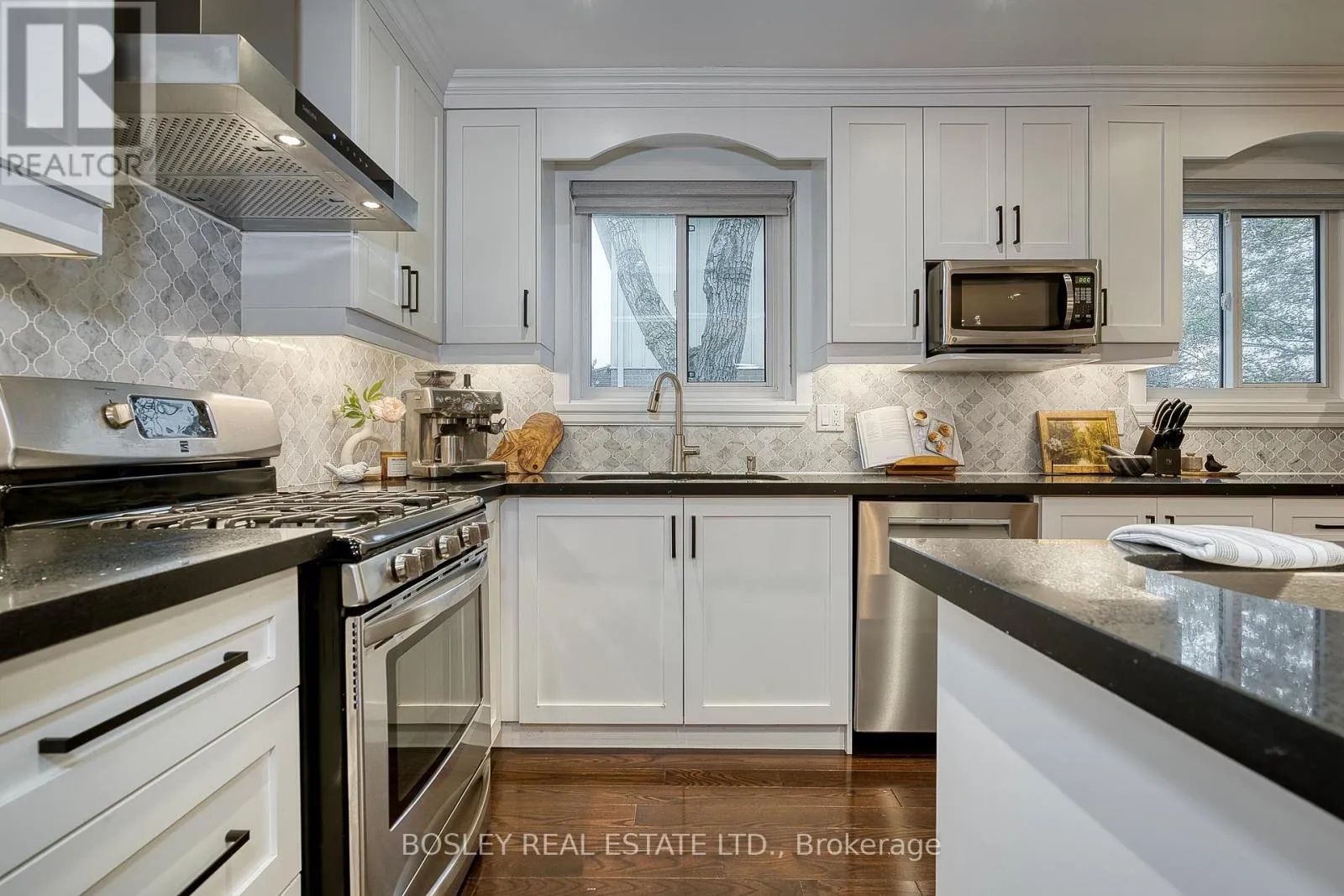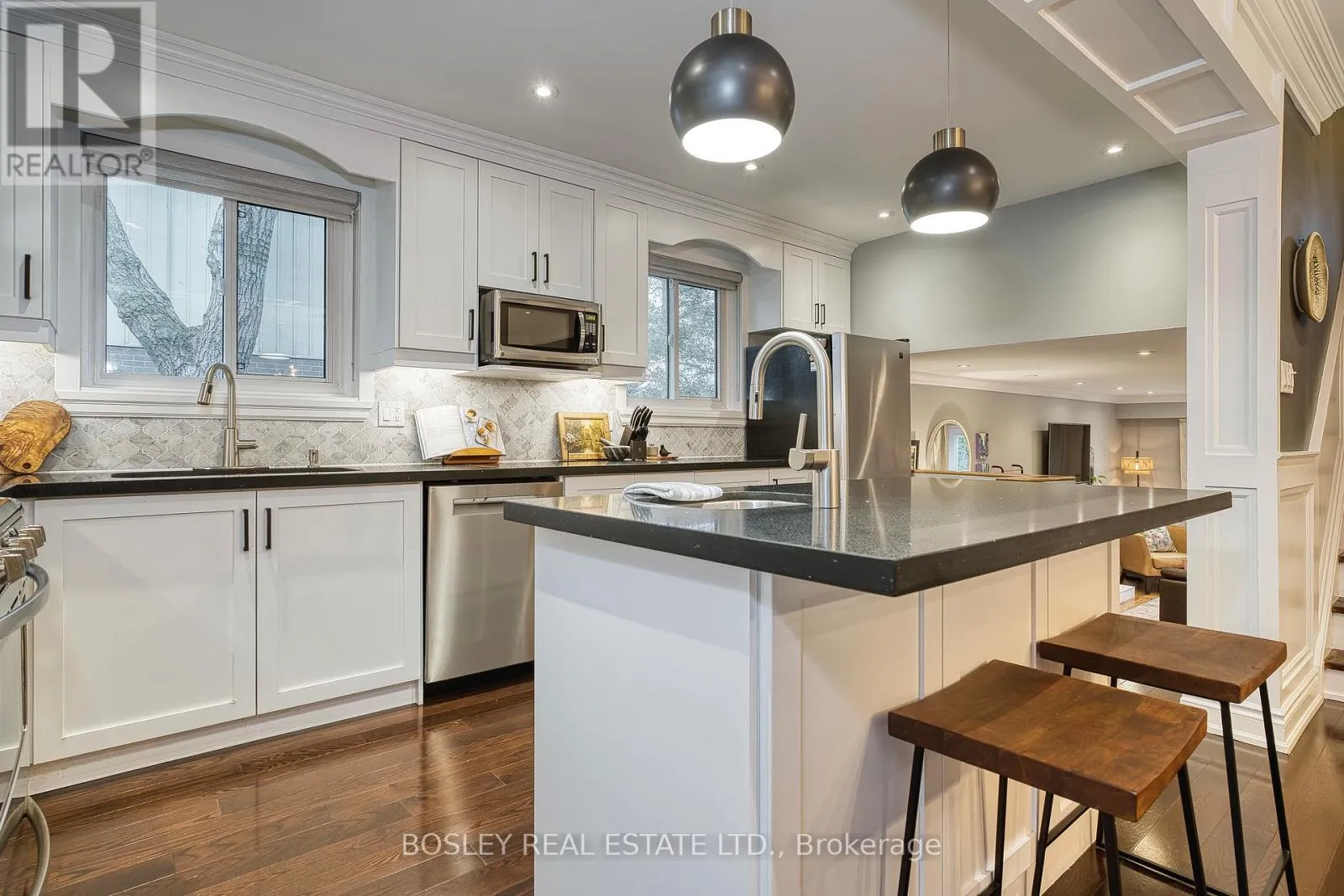 Sylvan and Bethune Prime Guildwood location! This beautifully renovated 4-level detached backsplit offers stylish, modern living just one street from the lake. Step into a spacious custom-tiled foyer with ample closet space, leading to an open-concept living and dining area filled with natural light. The updated kitchen overlooks the main living space and features a gas stove, stainless steel appliances, quartz counters, marble backsplash, and a functional island-perfect for everyday living and entertaining.
