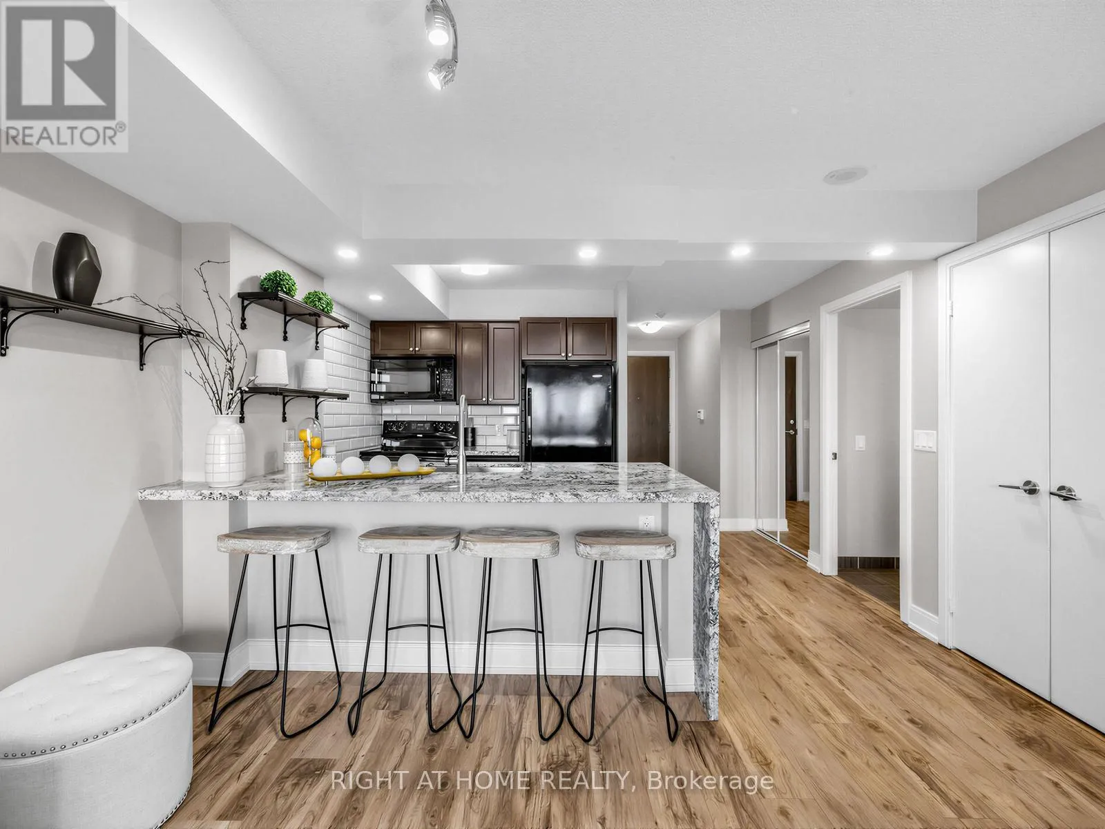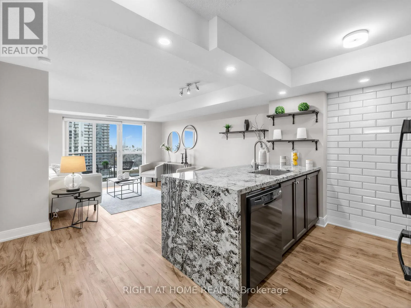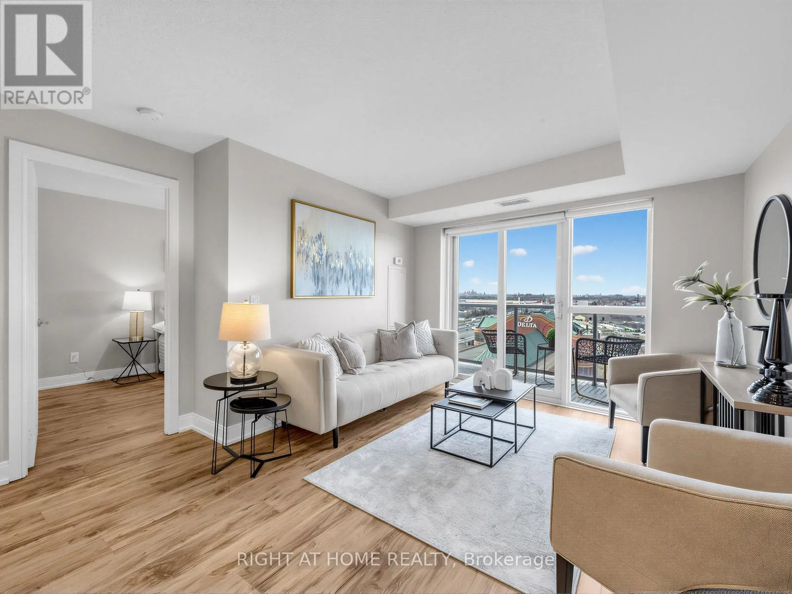 Luxury vinyl flooring extends throughout the suite.The primary bedroom features a walk-in closet and large window, while the spacious den with sliding panel blinds can easily function as a second bedroom or home office. The living area opens to a private balcony, perfect for enjoying beautiful sunset views.Residents enjoy resort-style amenities, including an indoor pool, fitness centre, party room, theatre room, and ample visitor parking. Conveniently located near Hwy 401, Kennedy Road, GO Transit, shopping, groceries, and entertainment. (id:27476)
