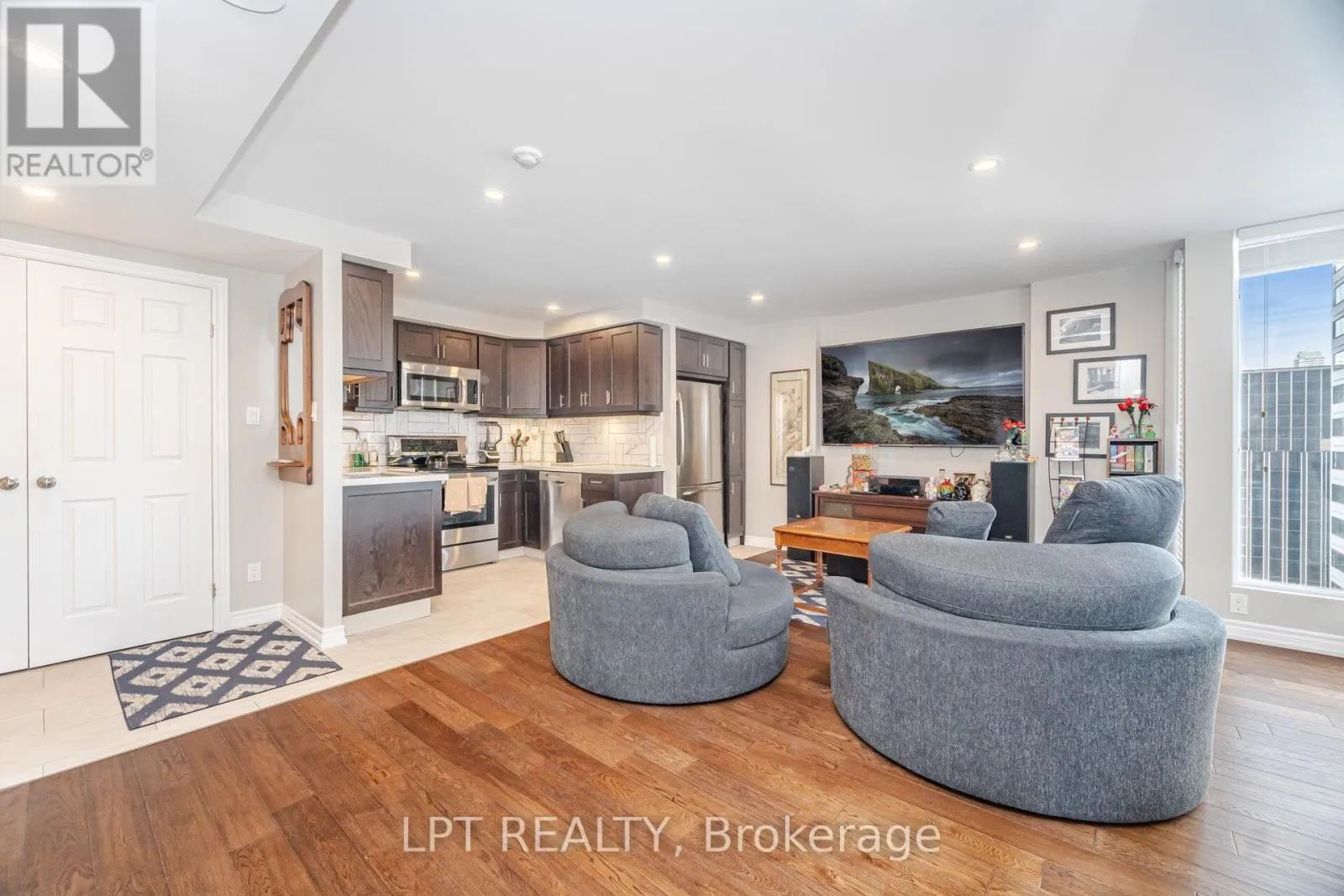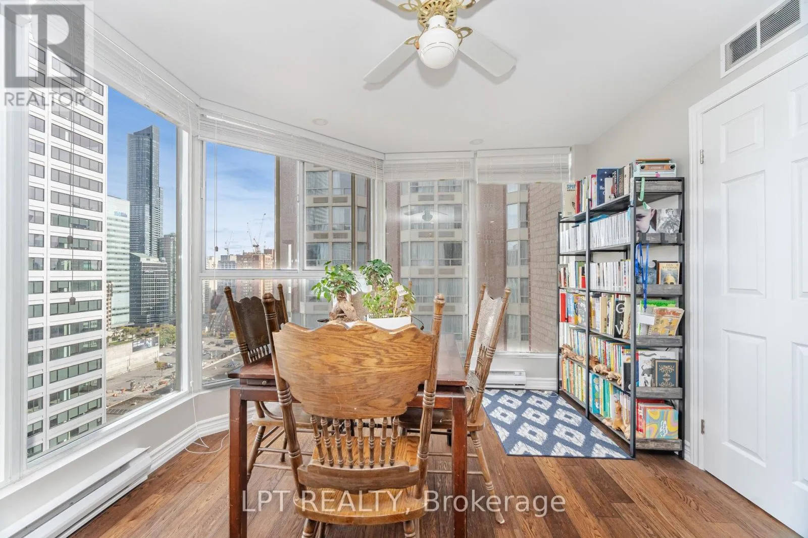 Cross Streets: Dundas Street & University. ** Directions: Dundas & University. Beautifully renovated and impeccably styled, this oversized one-bedroom plus solarium offers sophisticated urban living in the heart of downtown. The open-concept living and dining area flows effortlessly into the bright solarium, featuring floor-to-ceiling windows and rich hardwood floors-perfect for a home office, reading nook or 2nd bedroom.