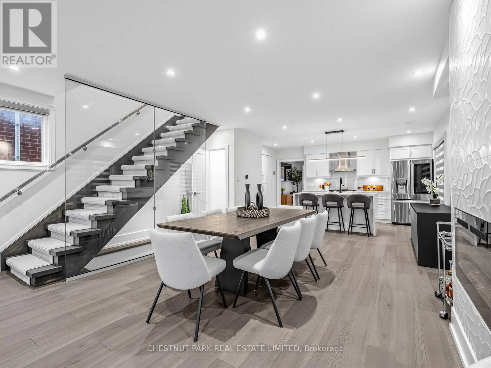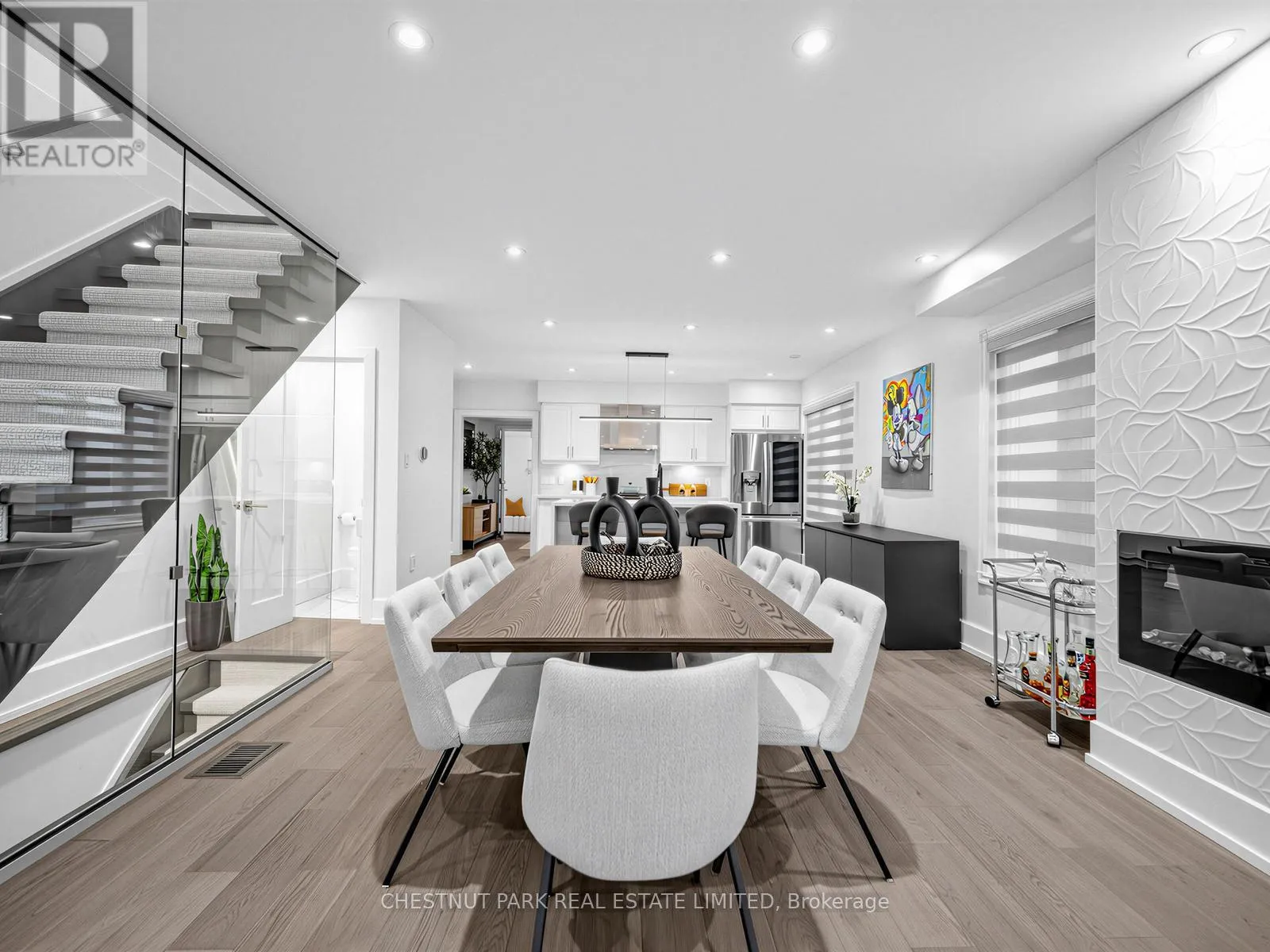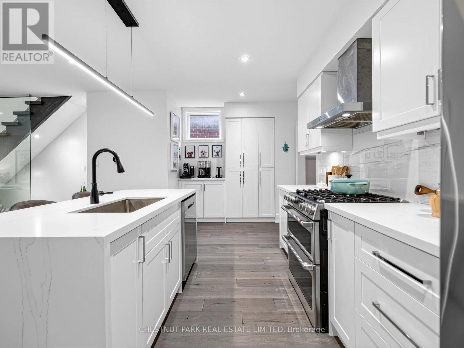 Oakwood/St Clair Oakwood Village at its finest-steps to Humewood-Cedarvale. Fully renovated, move-in ready, and done right. This modern open-concept home delivers clean lines, designer finishes, and exceptional functionality for family living. Engineered oak hardwood floors on the main and upper levels, striking glass railings, and curated lighting set the tone. The chef's kitchen anchors the home with a quartz centre island and premium appliances, flowing seamlessly into open living and dining spaces made for entertaining.