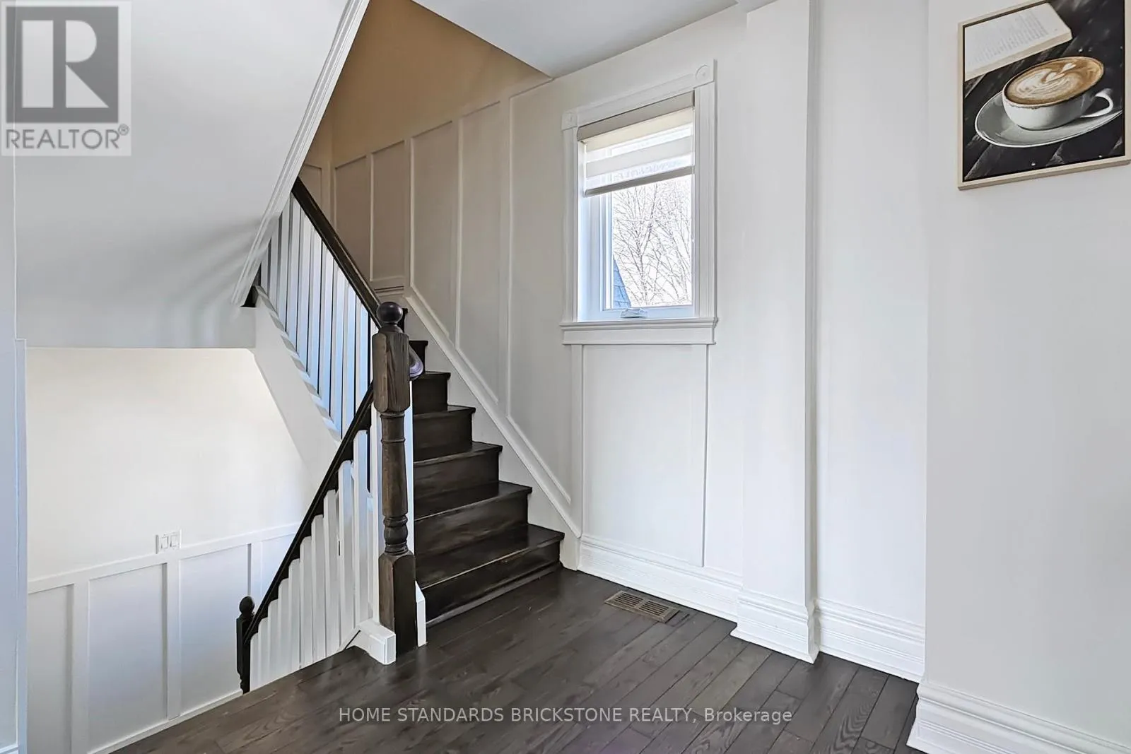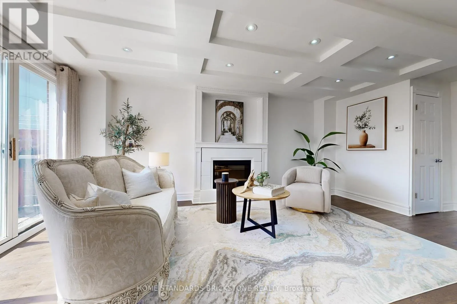 The open-concept main floor features a spacious living room highlighted by a stunning coffered ceiling and elegant fireplace. Hardwood flooring, pot lights, and a stylish powder room complete the space. The modern kitchen is designed for both function and style, offering a large quartz centre island, eat-in area, and stainless steel appliances.The bright walk-up basement includes a renovated bathroom, fresh paint, laminate flooring, and pot lights. (id:27476)