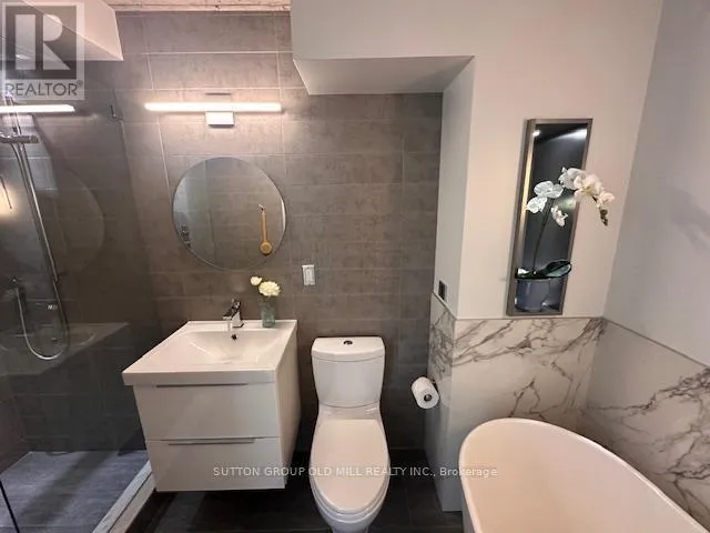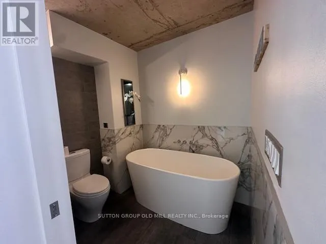 Long, modern linear high gloss kitchen with Caesar stone counter and Island that seats 6, glass backsplash, 9" plank eng flooring with natural finish, exposed concrete ceilings, select exposed concrete walls sealed for lustre, entire unit is re-done, nothing left untouched. Hard loft finishes with warm accents, truly a special space. Step into the stand alone resin soaker tub or the stand alone shower with 16"X16" rain head + hand held with 2 built in 5"x5" speakers for an acoustic shower experience then step out onto the heated bathroom floor. Space, light and tasteful design fill the space. 7th floor Gym, Sauna and enormous rooftop terrace with unparalleled City views.. Unit has parking and locker, full circle conveniences. Michelin Star neighbour at corner plus an entire strip of culinary options. (id:27476)