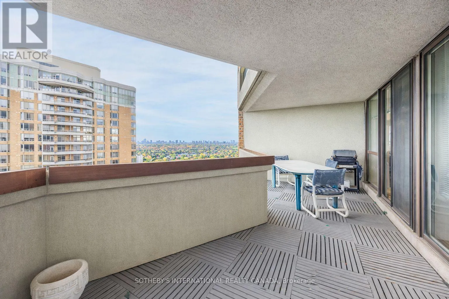 ft. west-facing terrace off the living and dining rooms, primary bedroom, and second bedroom, plus a second 180 sq.ft. balcony off the breakfast area and third bedroom.The living and dining rooms span nearly 30 feet with floor-to-ceiling windows and sweeping west views, ideal for entertaining and everyday living. The well-appointed kitchen features granite counters, ample storage, and a bright breakfast area with direct walk-out. A separate family room with French doors offers a quiet retreat or media space.The primary bedroom is a peaceful escape with walk-in closets, vanity, five-piece ensuite, and balcony access. The second bedroom includes its own ensuite and opens to the main terrace. The third bedroom, with private entry, ensuite, and access to the second balcony, offers excellent flexibility for guests or multigenerational living. Ensuite laundry, two owned parking spaces, and an out-of-suite locker add convenience.Residents enjoy 24-hour concierge service, indoor and outdoor pools, hot tub, saunas, gym, tennis and squash courts, golf simulator, party room with billiards, library, and visitor parking. Maintenance fees include all utilities: heat, hydro, water, cable, air conditioning, and parking. Ideally located near TTC, parks, schools, groceries, Fairview Mall, North York General Hospital, Seneca College, and Highways 401 and 404, this is a rare opportunity to enjoy true scale, comfort, and convenience in the city. (id:27476)