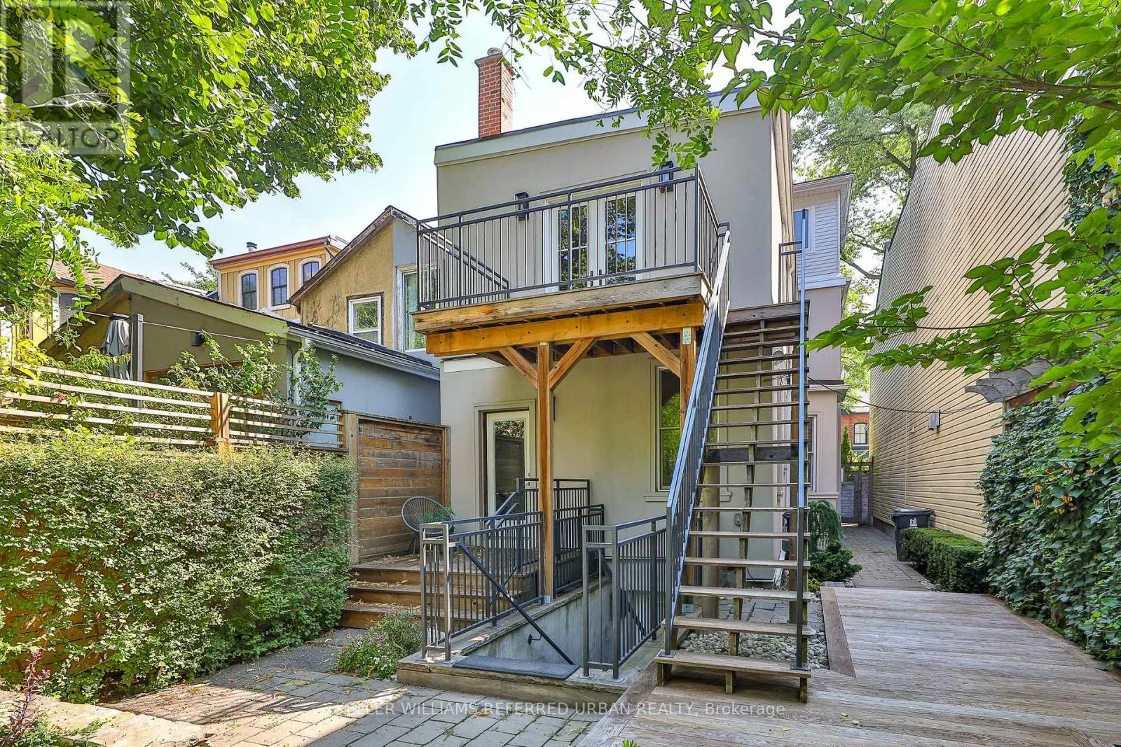 The custom kitchen features leathered granite counters, ideal for cooking and entertaining. The second floor includes a serene bath with a deep soaker tub and a rear bedroom/home office with walkout to a private balcony. The third-floor retreat boasts a walk- in closet, luxurious ensuite, and a rooftop deck nestled in the treetops a tranquil escape in the heart of the city. The main floor 1-bedroom apartment showcases original hardwood floors, intricate plaster moldings, soaring ceilings, and a spacious eat-in kitchen with a pressed tin ceiling. Step out to the landscaped backyard, perfect for relaxing or hosting. The newly renovated basement apartment offers 8-ft ceilings, 2 bedrooms, in-floor heating, and a 3-piece bath. Its custom kitchen, crafted from a reclaimed bowling alley lane, adds warmth and uniqueness. Rough-in plumbing for a second bath provides flexibility for future upgrades. The homes classic white façade and custom double-door entry highlight its 19th-century heritage. The detached carport includes two-car parking with a motorized roll-up door and a finished interior with plumbing and hydro ready for a potential laneway suite. Perfect for end-users or investors, this rare property offers multiple income streams, unmatched character, and modern upgrades a true gem in downtown Toronto. (id:27476)