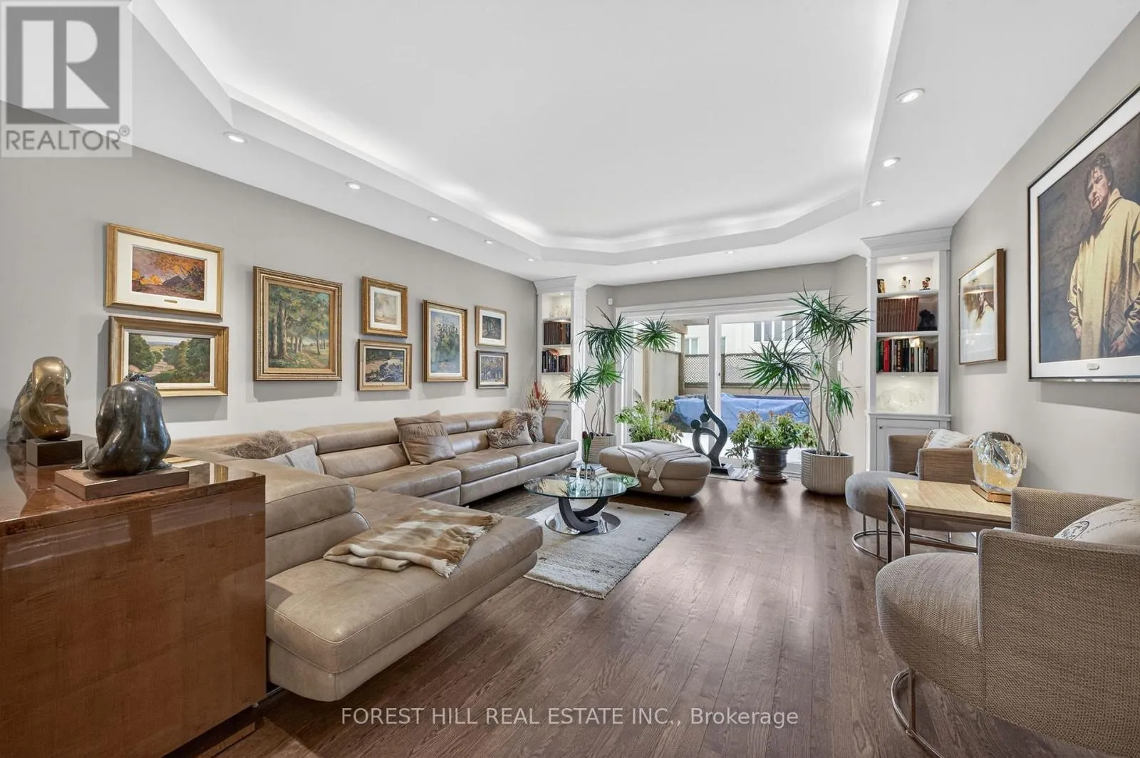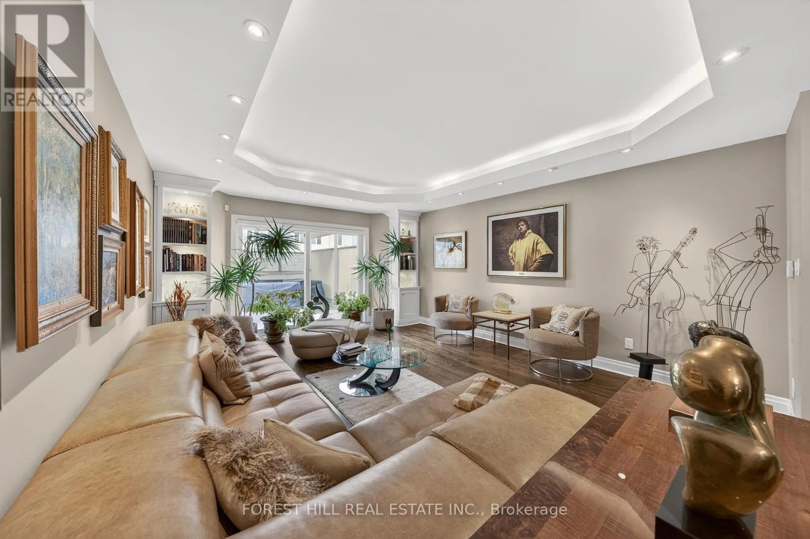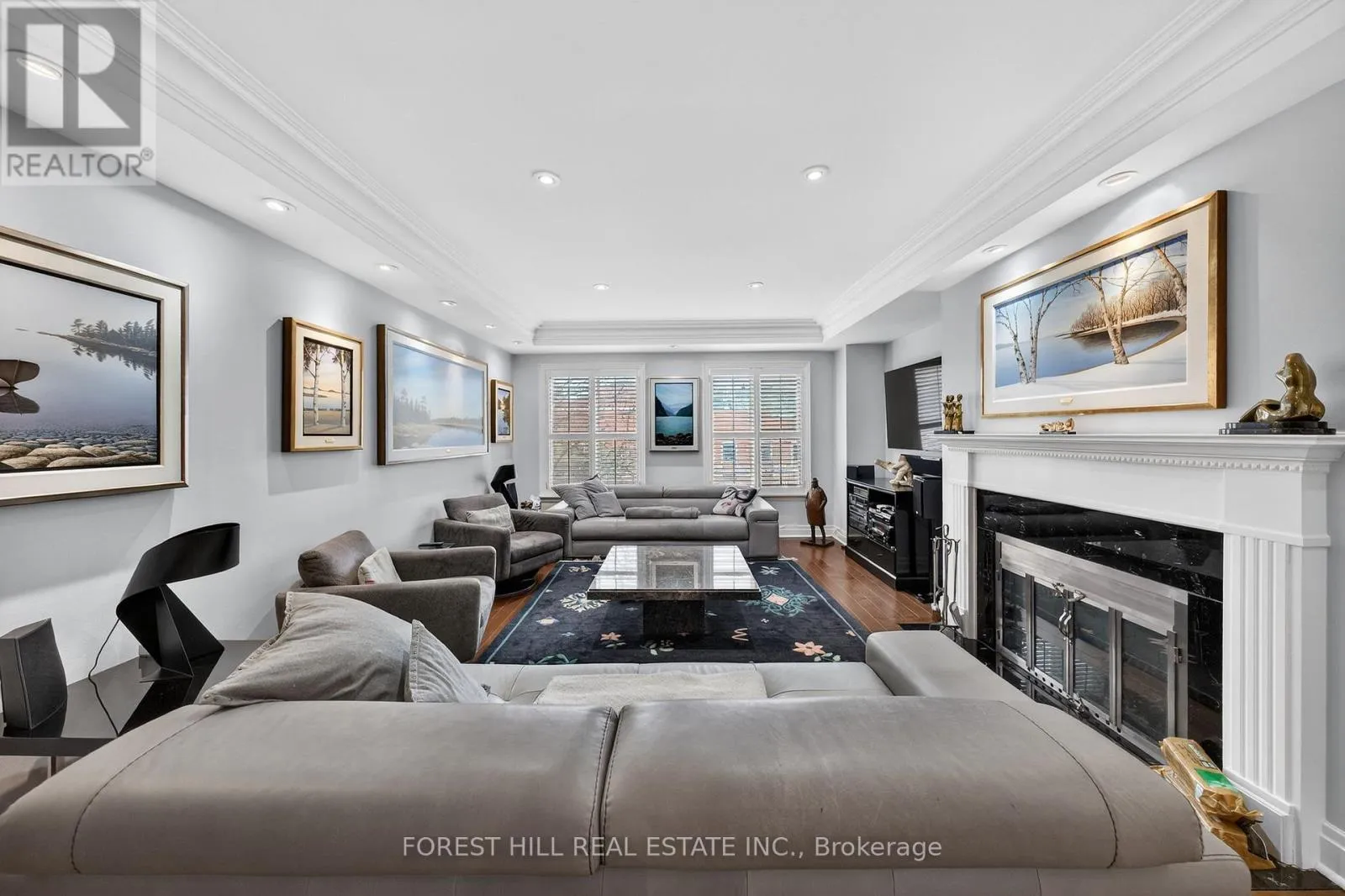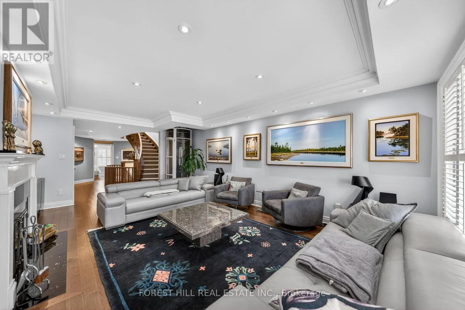 The main level showcases soaring and coffered ceilings, crown moulding throughout, wide-plank oak floors, custom built-ins, pot lights, California shutters, and integrated surround sound. The open-concept living and dining areas are designed for elevated entertaining. A custom chef's galley-style kitchen features premium appliances, abundant cabinetry, and a breakfast bar, with a seamless walkout to a private terrace for effortless indoor-outdoor living. A striking panoramic design PVE elevator provides access from the basement to the third floor. The second level offers a spacious family room with wood-burning fireplace and built-ins, a well-sized bedroom, full bath, and convenient second-floor laundry. The third floor features a dramatic two-storey primary retreat with 17-foot ceilings and two skylights. A loft-style upper lounge leads to a private rooftop terrace. The suite includes a spa-inspired ensuite that has a bathtub with a separate shower and his-and-hers walk-in closets with organizers. An additional bedroom with ensuite completes this level. The lower level offers an above-grade bedroom with large windows, full bath, private sauna, pantry, and flexible living space, plus direct access to a spacious two-car garage with ample storage. Freehold with association fee covering landscaping and snow removal. Steps to Dupont Subway Station, Casa Loma, Yorkville, Forest Hill Village, parks, and top private schools including UCC and BSS. (id:27476)