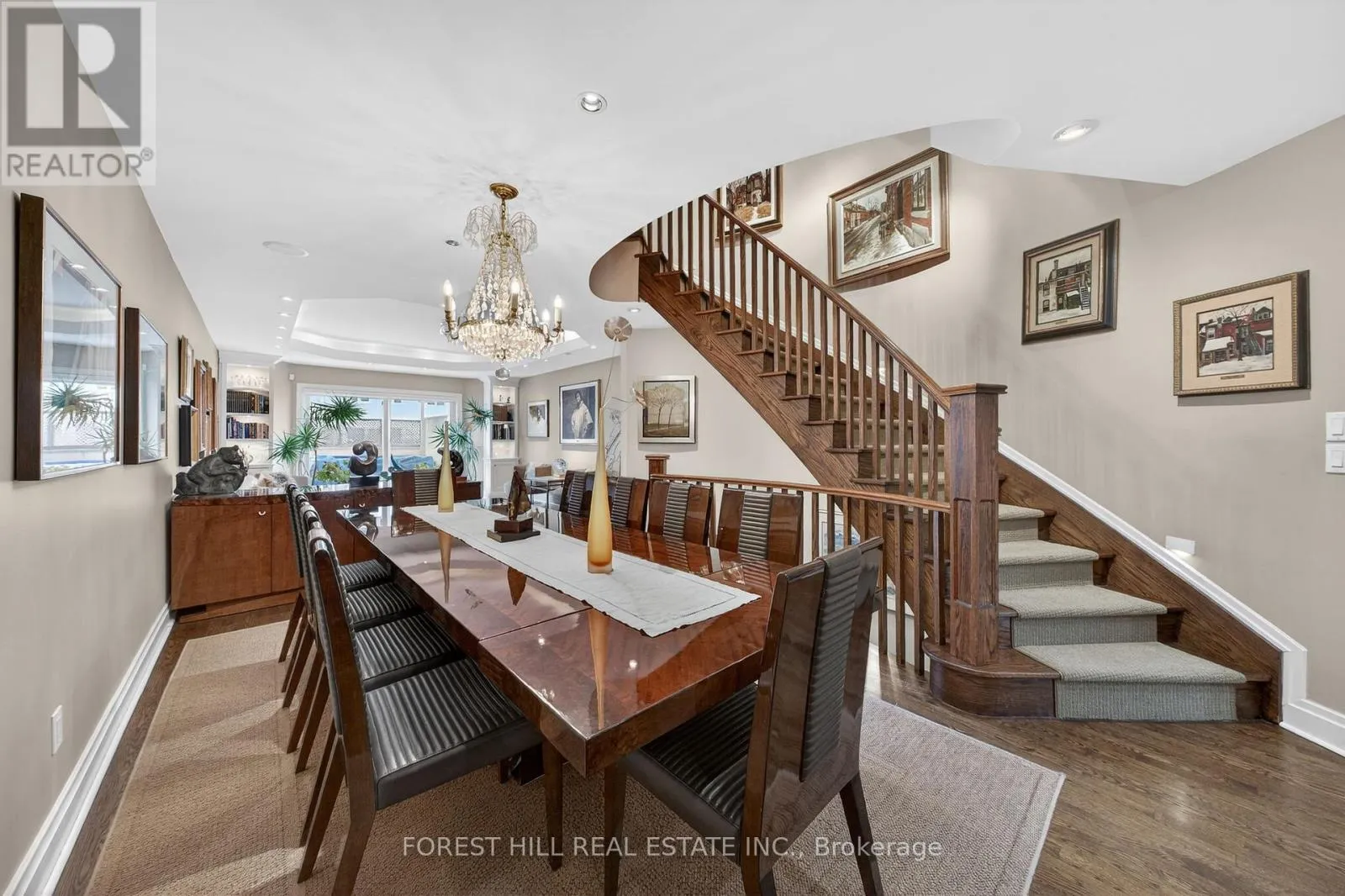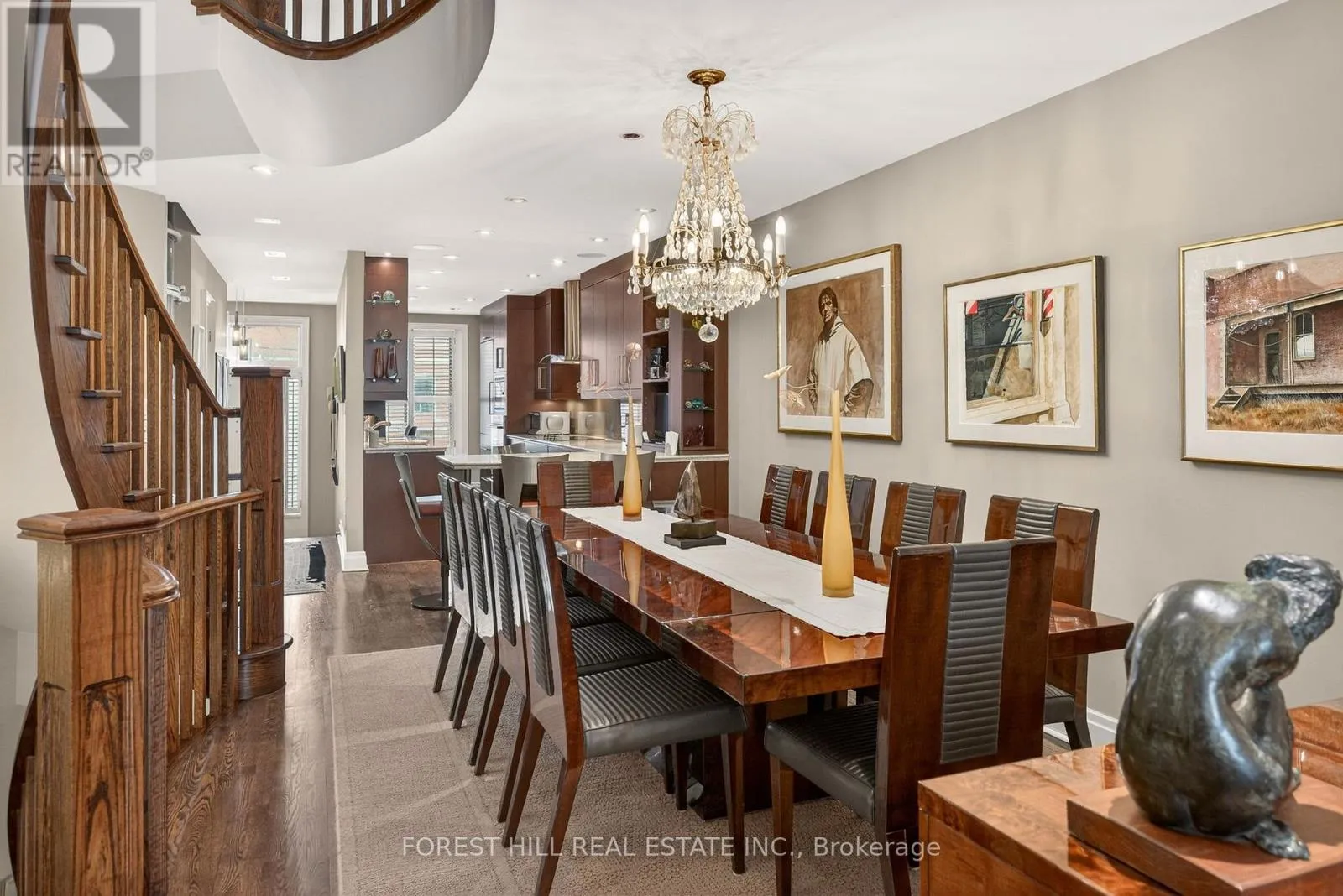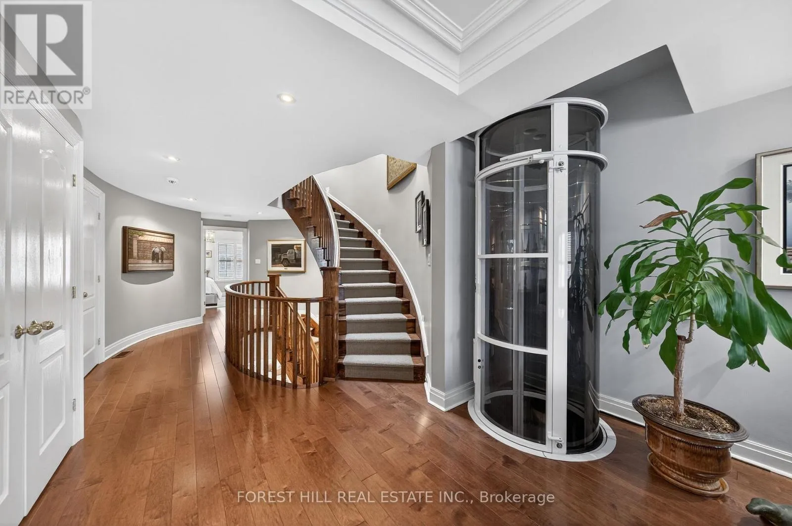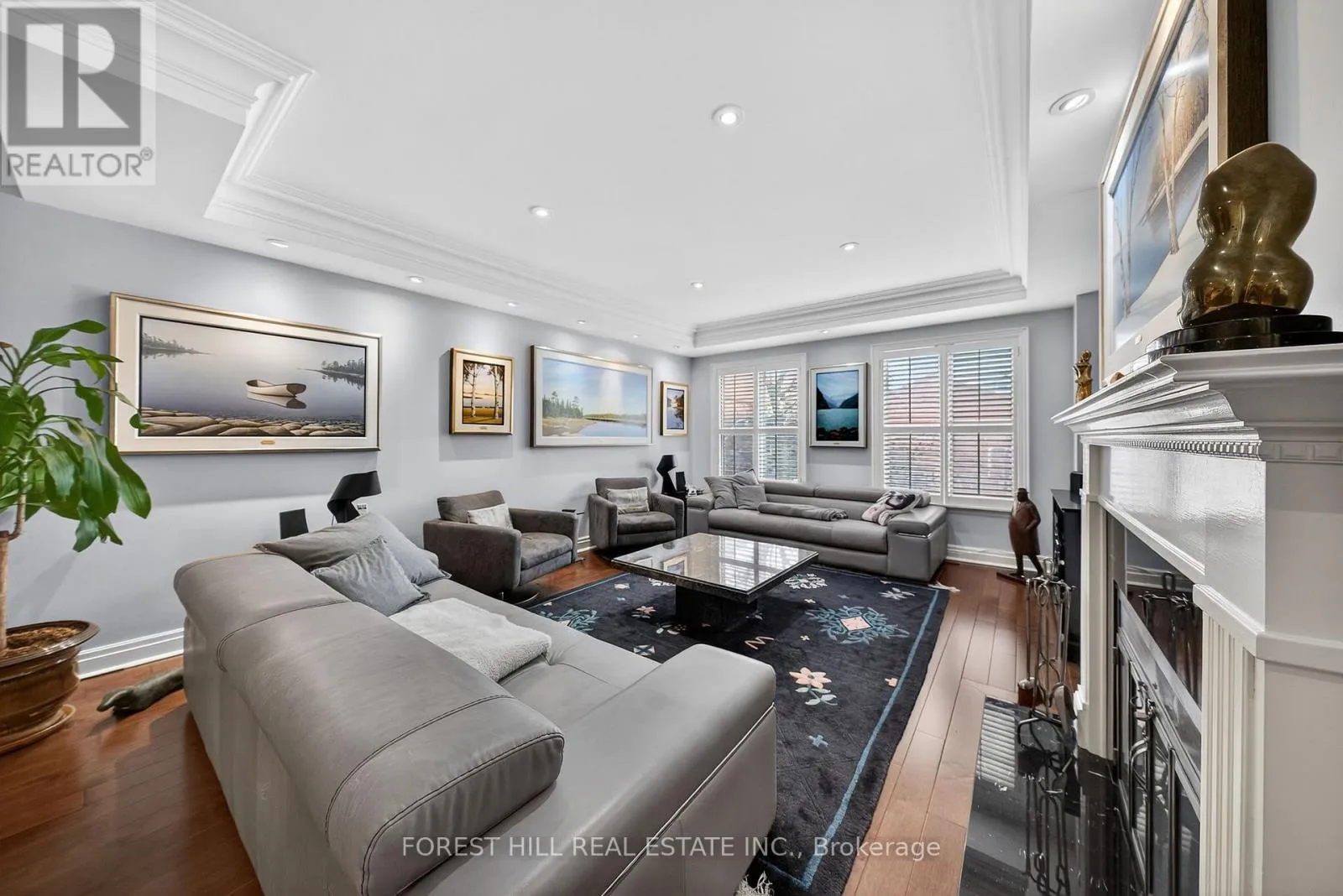 The main level showcases soaring and coffered ceilings, crown moulding throughout, wide-plank oak floors, custom built-ins, pot lights, California shutters, and integrated surround sound. The open-concept living and dining areas are designed for elevated entertaining. A custom chef's galley-style kitchen features premium appliances, abundant cabinetry, and a breakfast bar, with a seamless walkout to a private terrace for effortless indoor-outdoor living. A striking panoramic design PVE elevator provides access from the basement to the third floor. The second level offers a spacious family room with wood-burning fireplace and built-ins, a well-sized bedroom, full bath, and convenient second-floor laundry. The third floor features a dramatic two-storey primary retreat with 17-foot ceilings and two skylights. A loft-style upper lounge leads to a private rooftop terrace. The suite includes a spa-inspired ensuite that has a bathtub with a separate shower and his-and-hers walk-in closets with organizers. An additional bedroom with ensuite completes this level. The lower level offers an above-grade bedroom with large windows, full bath, private sauna, pantry, and flexible living space, plus direct access to a spacious two-car garage with ample storage. Freehold with association fee covering landscaping and snow removal. Steps to Dupont Subway Station, Casa Loma, Yorkville, Forest Hill Village, parks, and top private schools including UCC and BSS. (id:27476)
