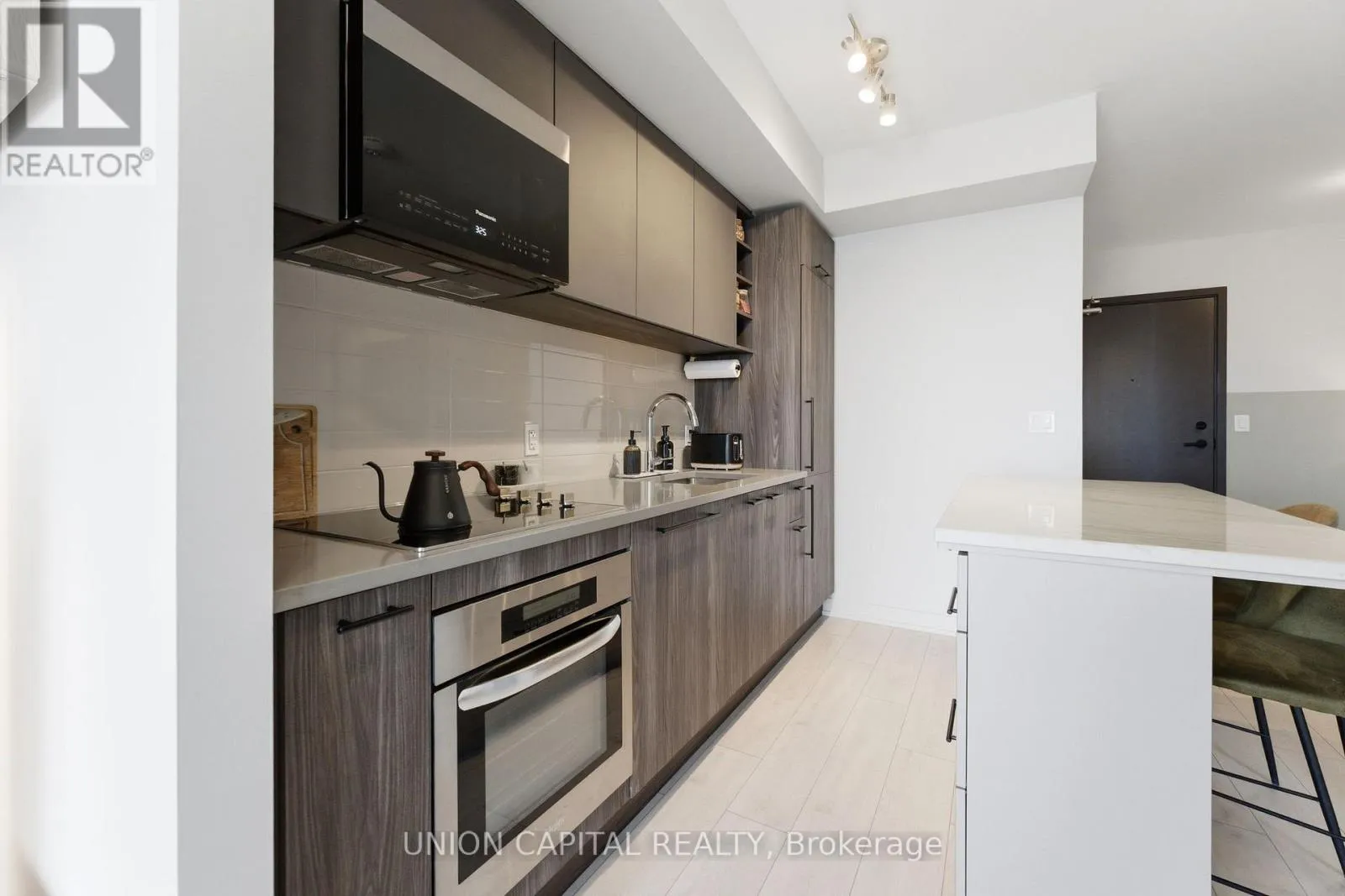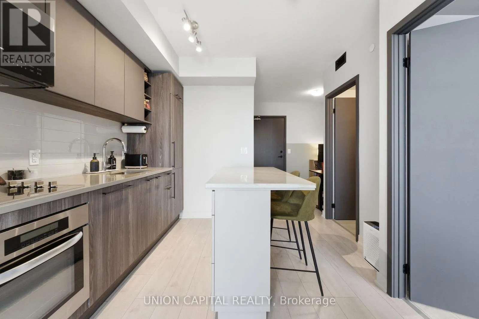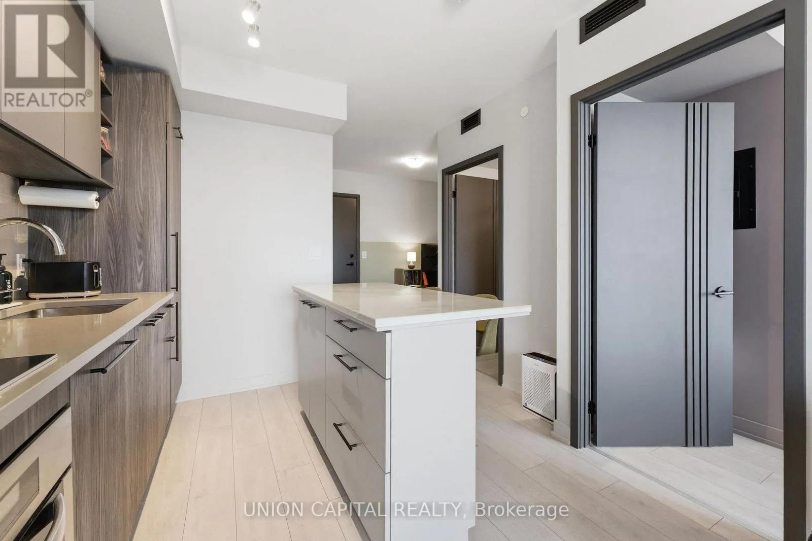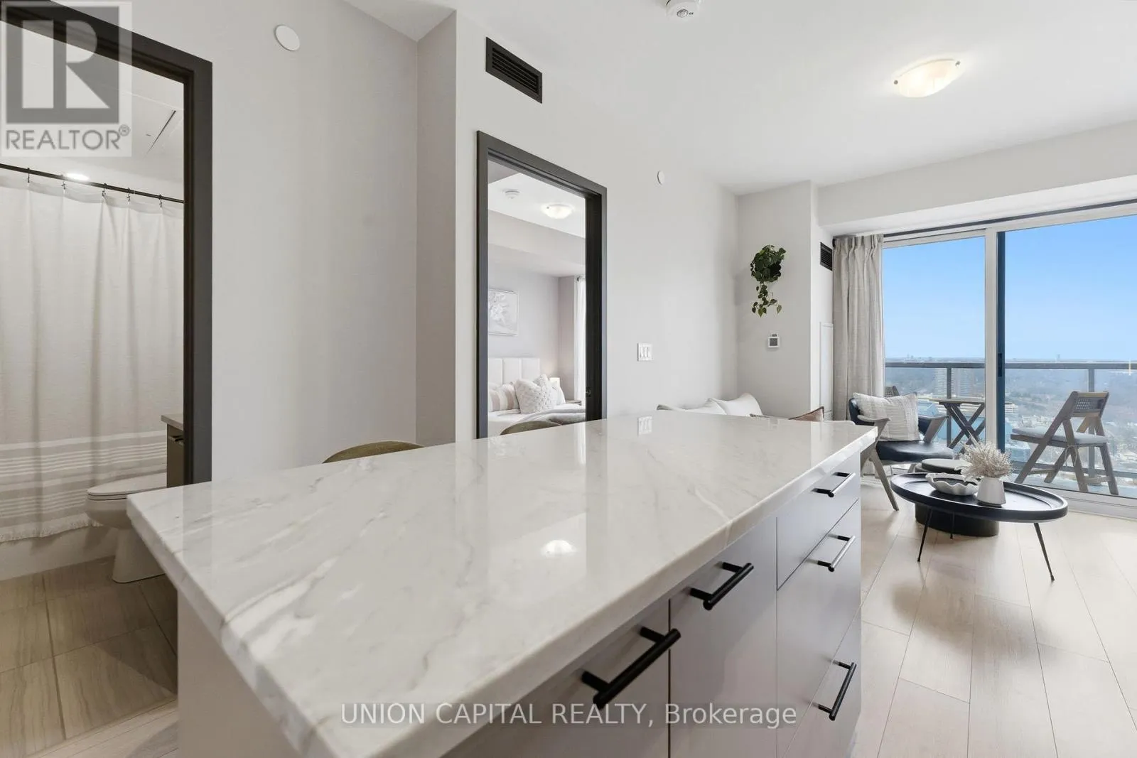 Kennedy Rd & Sheppard Ave East Welcome to Unit 2720 at 2031 Kennedy Road - a fully upgraded designed 1-bedroom + large den suite offering tons of functional living space plus a private balcony. The open-concept layout features a modern kitchen with custom island including custom cabinet organizers with an eat-in area, a bright primary bedroom, and a versatile den ideal for a home office or guest space.