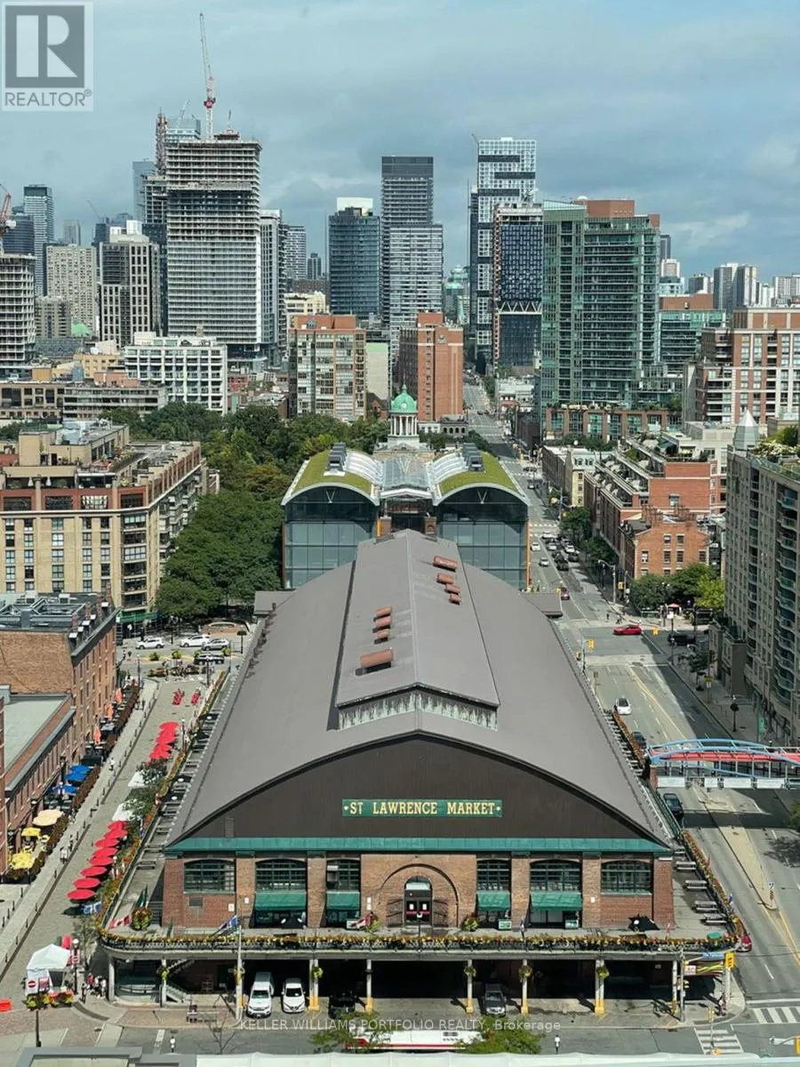 Lawrence Market. Loblaws is right next door, and the Gardiner's Jarvis exit is moments away for stress-free driving. This is urban convenience without compromise - and it's only getting better with the massive, 200-hectare Don Valley Port Lands revitalization now underway. Inside, you'll find beautifully upgraded living space with real hardwood floors, upgraded solid-core sound-reducing doors, modern lighting, Miele appliances, and custom roller blinds. The well-designed split-bedroom layout maximizes privacy, while floor-to-ceiling windows bathe the living space in natural light and open onto a nearly 300 sq ft wraparound balcony with panoramic views of the lake, city skyline, and future Don River Parklands. Bathrooms are finished with sleek tiling and built-in soap niches. LED lighting & smooth ceilings throughout add contemporary elegance. Two side-by-side parking spaces on P2 near the elevators and two side-by-side lockers (just steps away from the parking spaces) make this offering truly rare - especially in downtown Toronto. Residents also enjoy access to the exclusive Spotlight Club, offering 5-star amenities: a fully equipped gym, tennis/basketball court, rooftop deck with BBQs, party room, theatre, community garden plots, craft studio, and more. Stylish, smart, and exceptionally located - this is a standout suite in one of Toronto's most vibrant new communities. 2nd parking + 2nd locker currently rented out ($250+$70/mo $320 total), assumable/cancellable on closing. (id:27476)