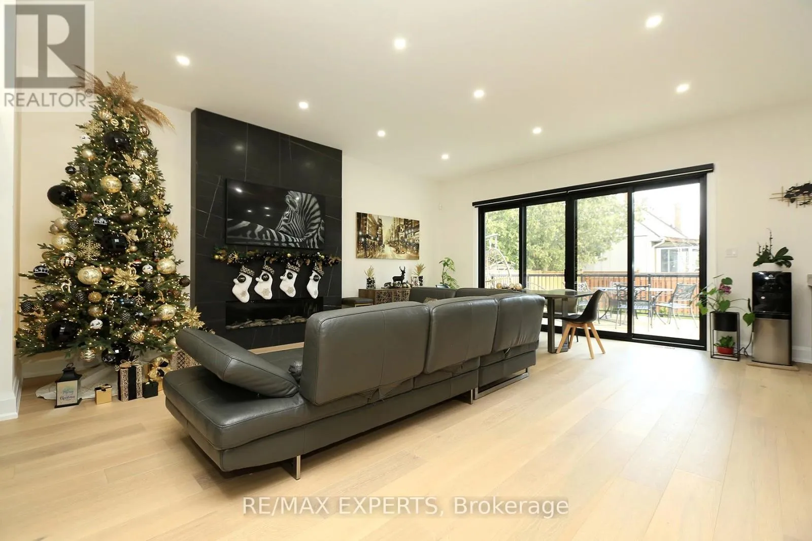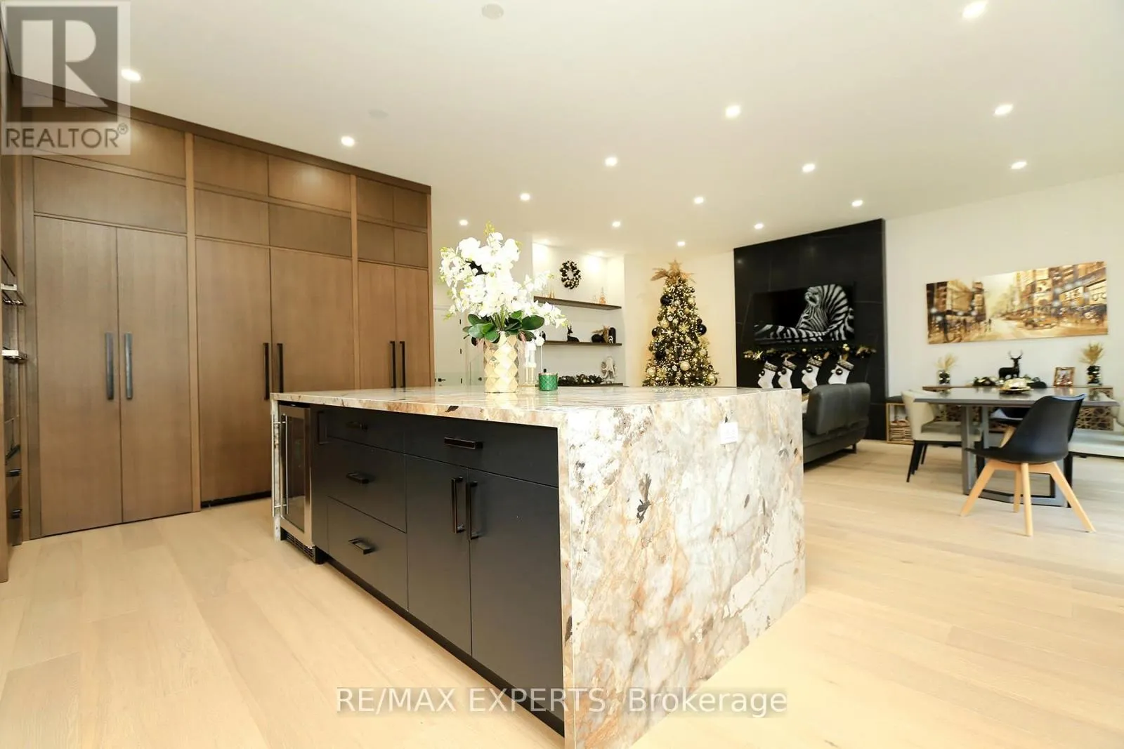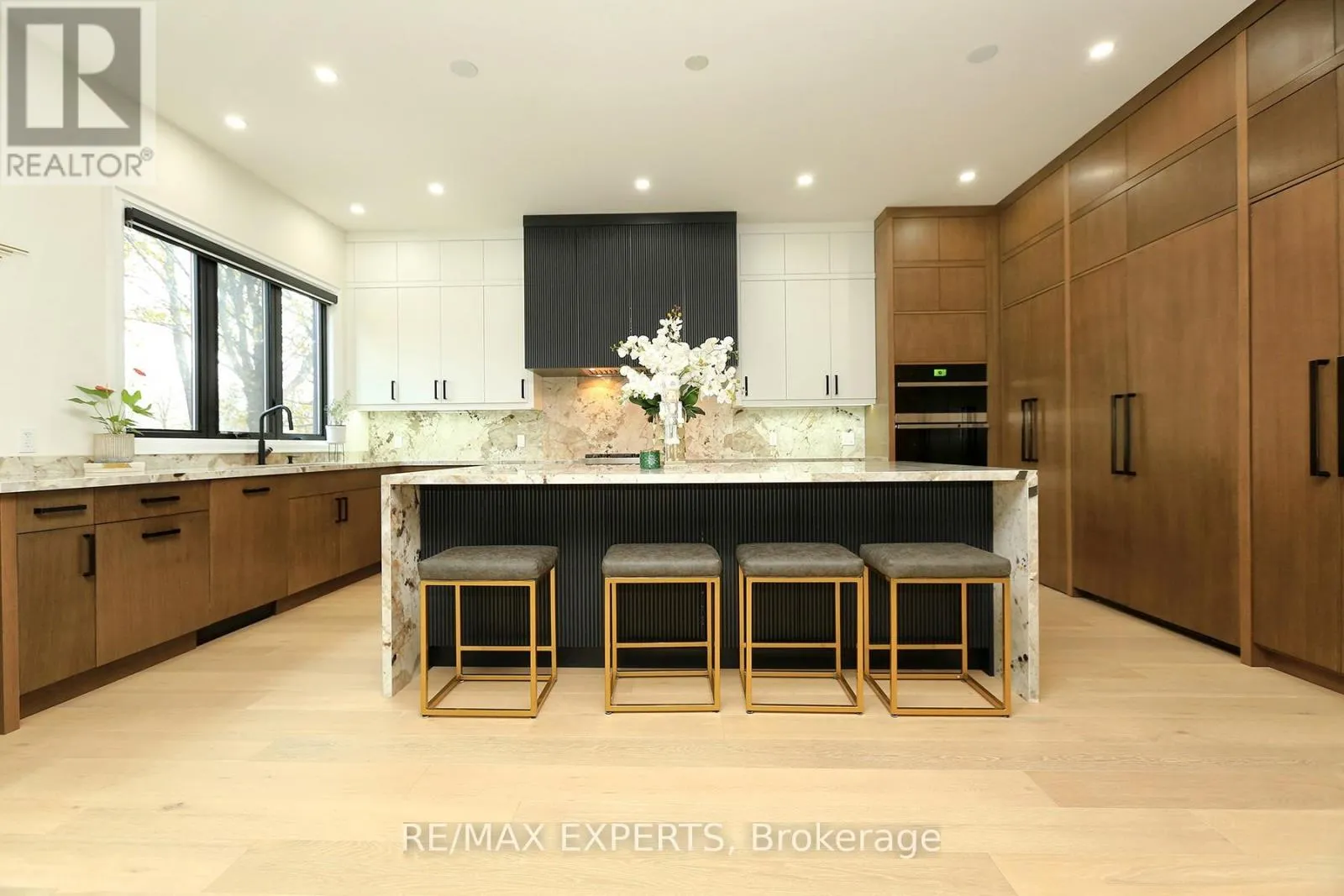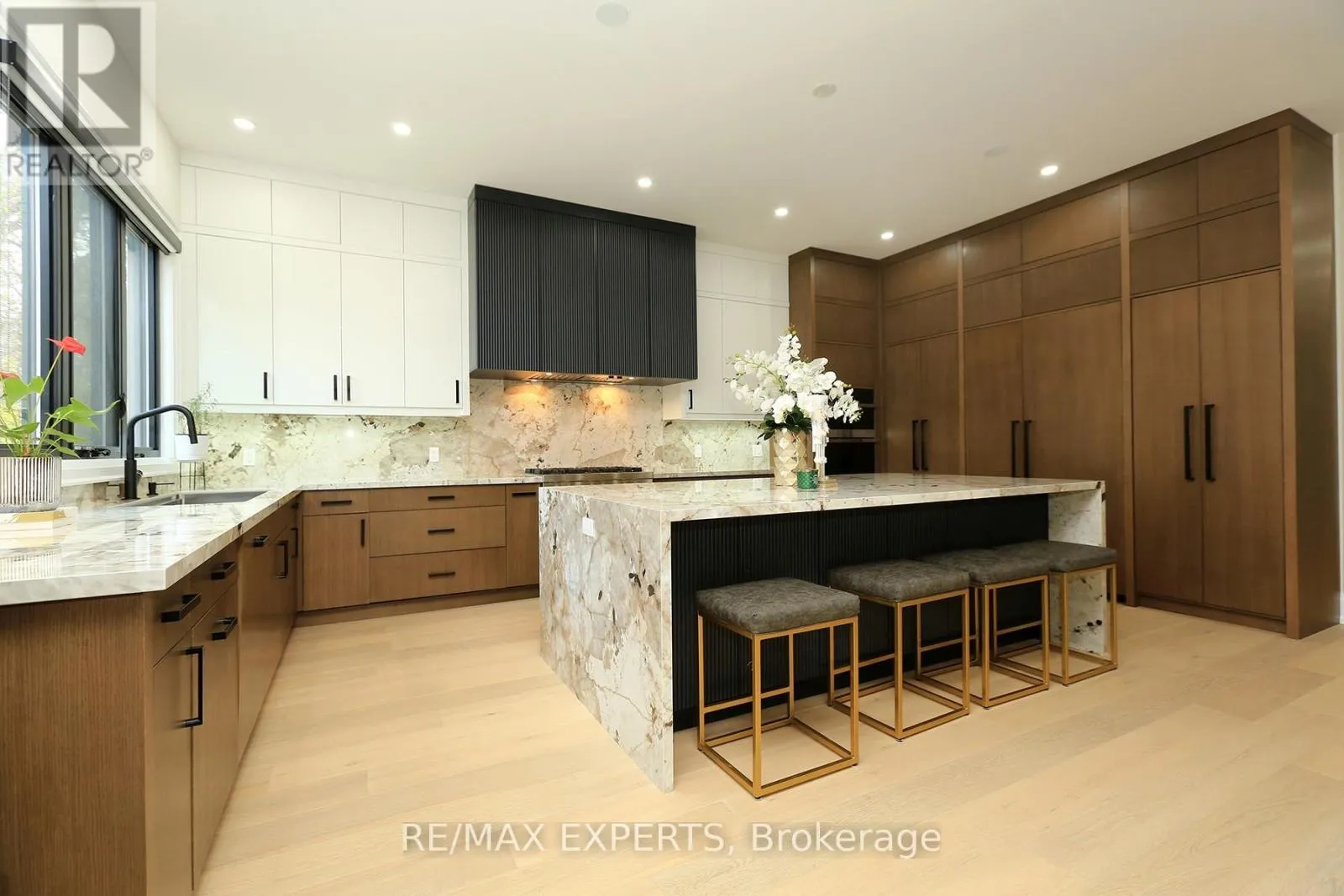 Brownsline and Valermo This 4 bedroom, 5-bathroom home seamlessly blends the warmth of a modern residence with the clean lines and open-concept design of modern living. Floor-to-ceiling windows flood the interior with natural light, creating a harmonious connection between indoor and outdoor spaces. The gourmet kitchen is both inviting and sophisticated, featuring an oversized waterfall porcelain island, hidden shelving, porcelain counter top and backsplash features a butlers pantry, professional appliances, and stunning designer lighting.