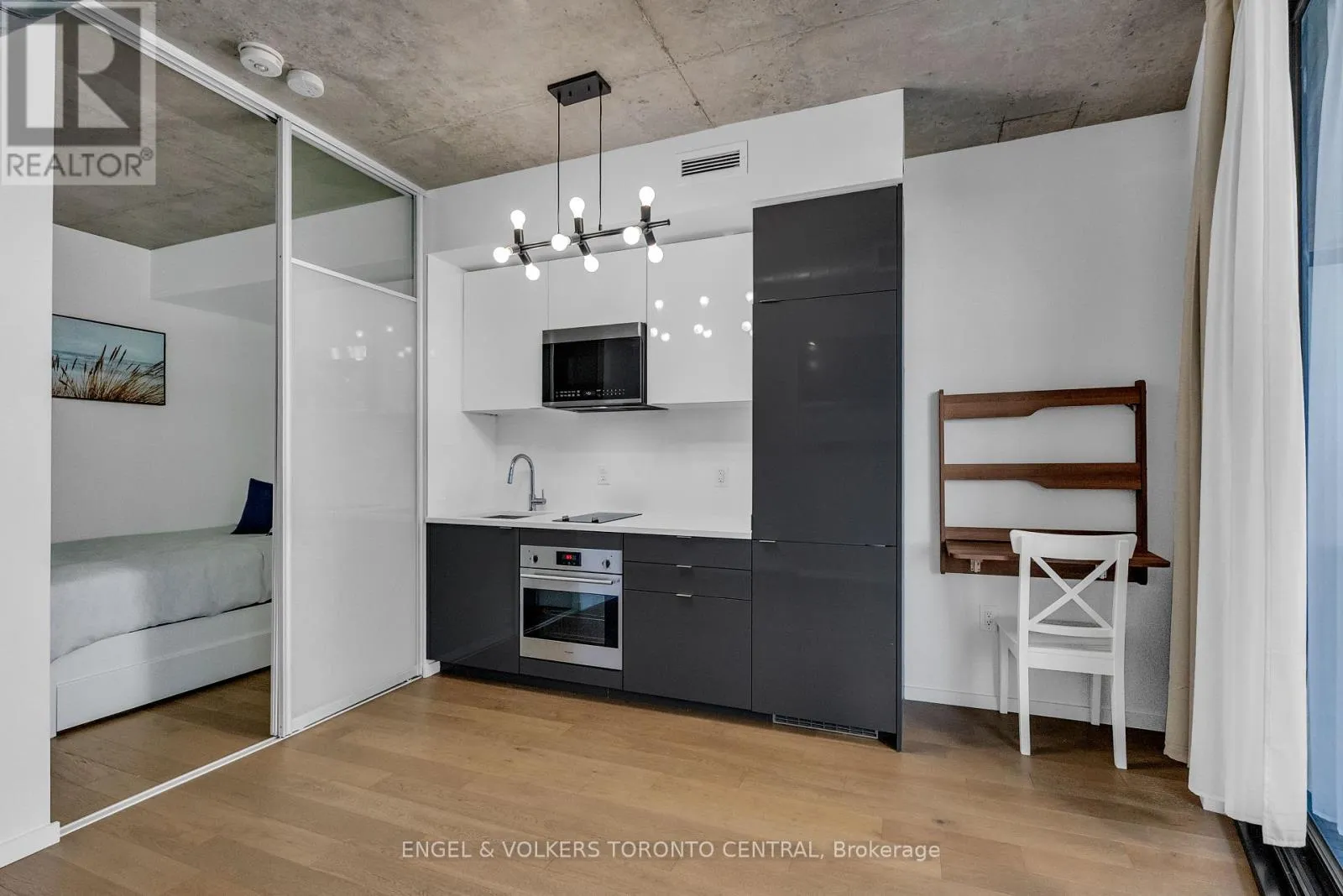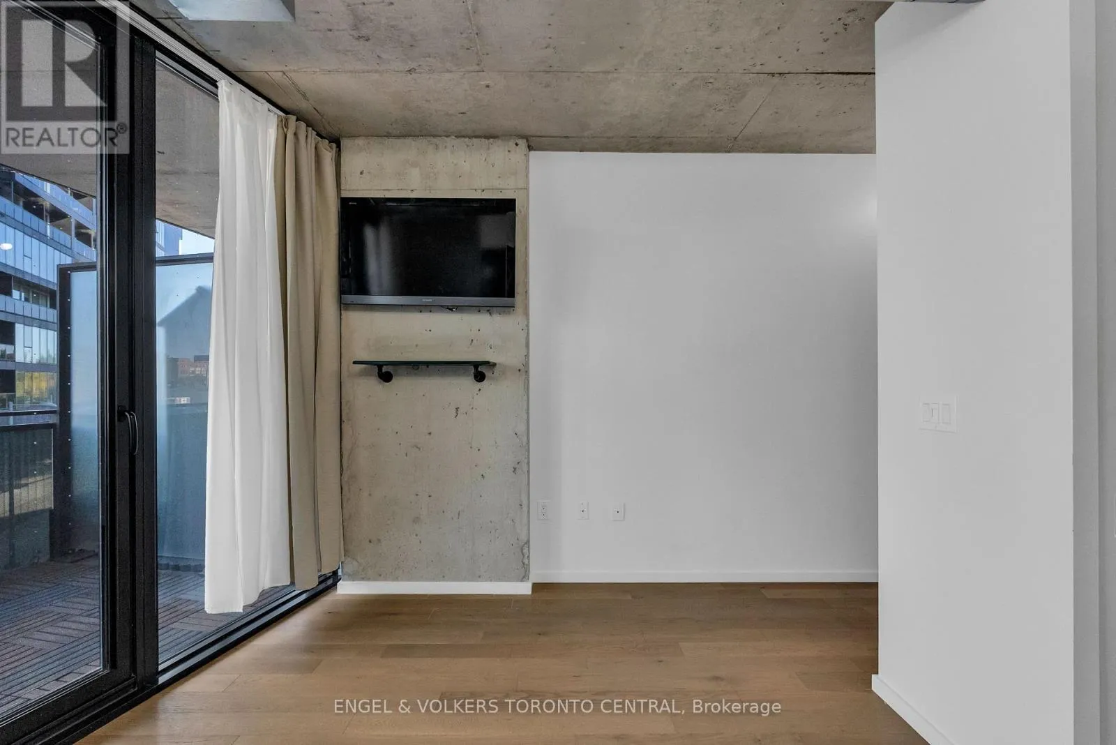Lower River Street & Bayview Avenue Welcome to this 1 bedroom stylish space that offers an east-facing exposure and fills the space with warm morning light through floor-to-ceiling windows. The open-concept layout, with expose concrete ceiling, large terrace and contemporary finishes make smart use of every inch-perfect for first-time buyers, young professionals, or savvy investors alike. Enjoy the convenience of two secure bike racks, ideal for urban living.