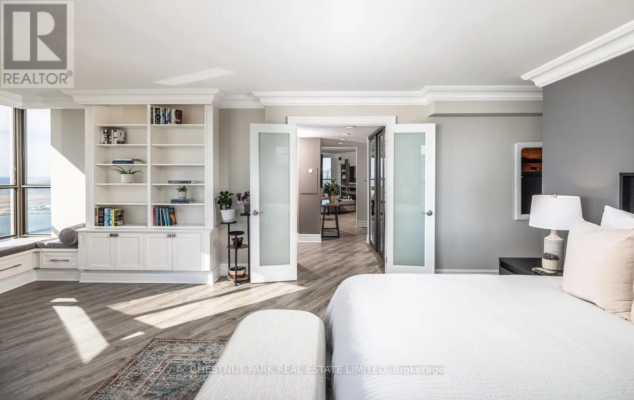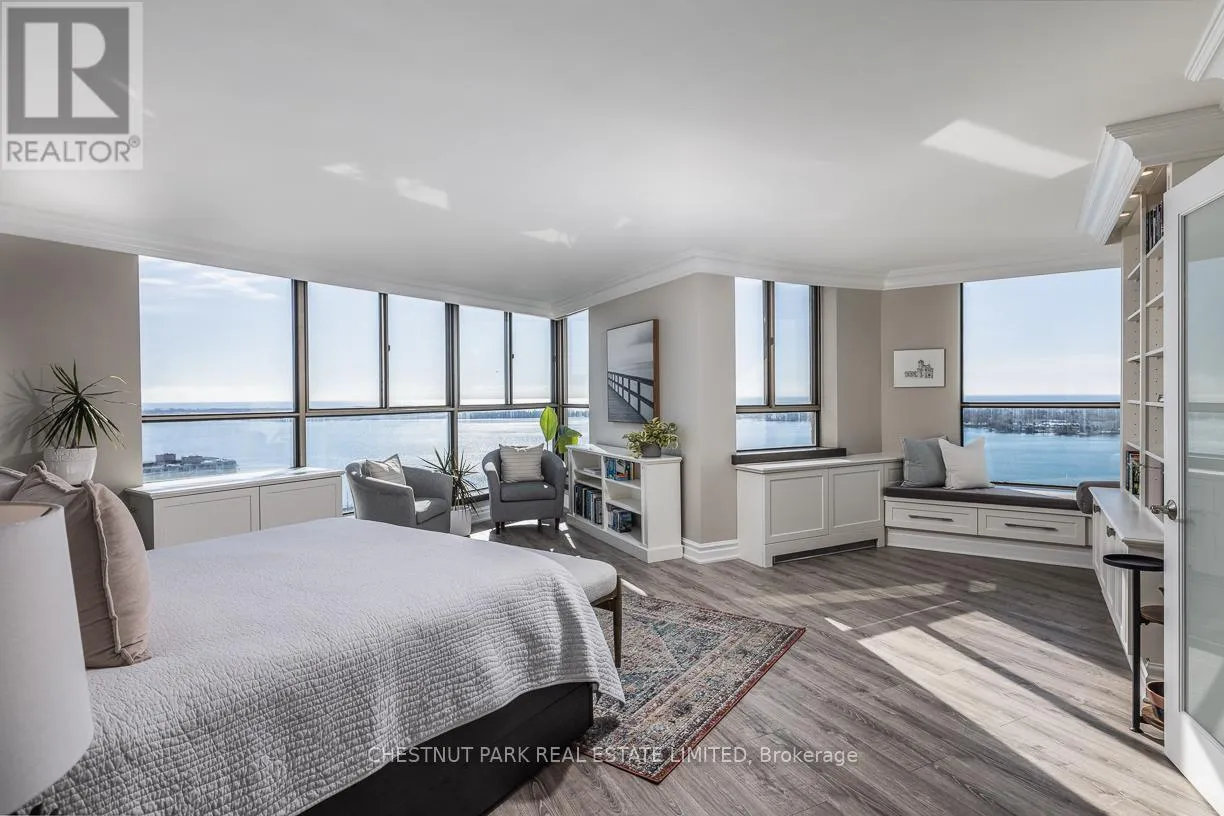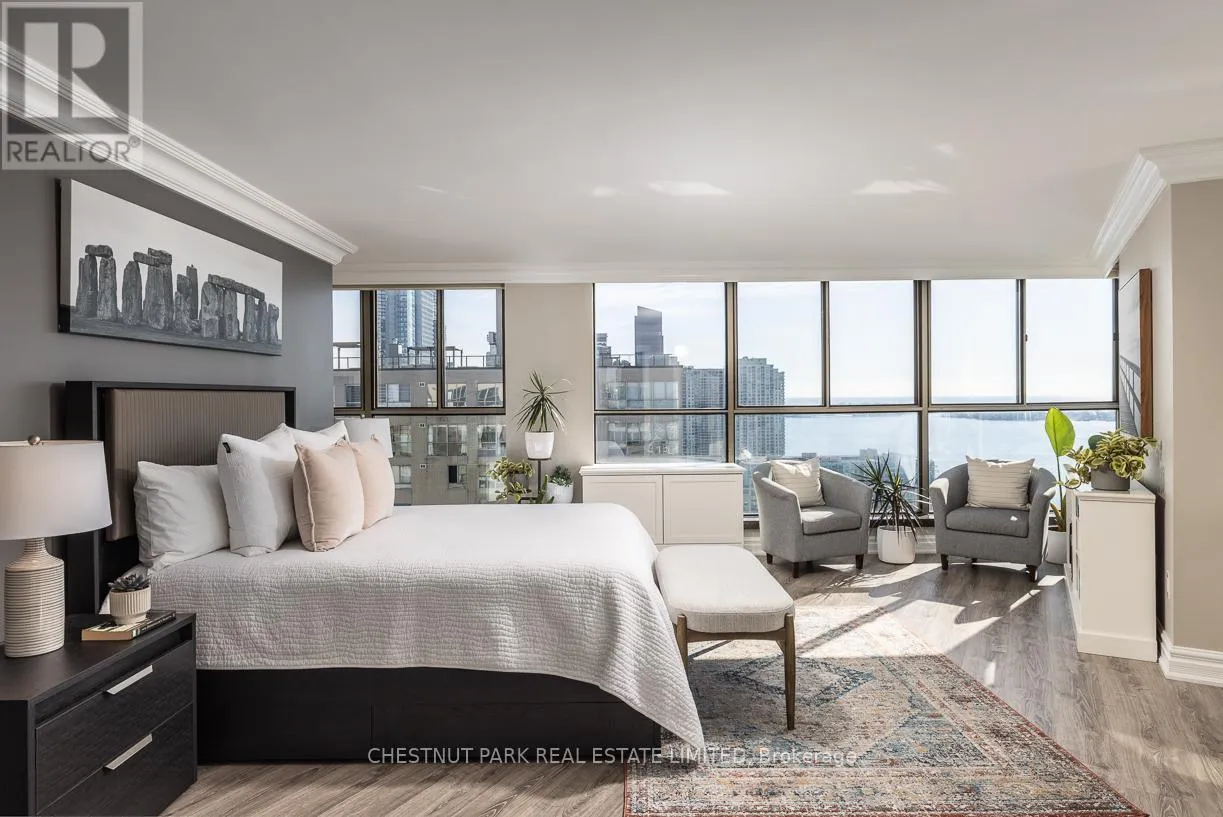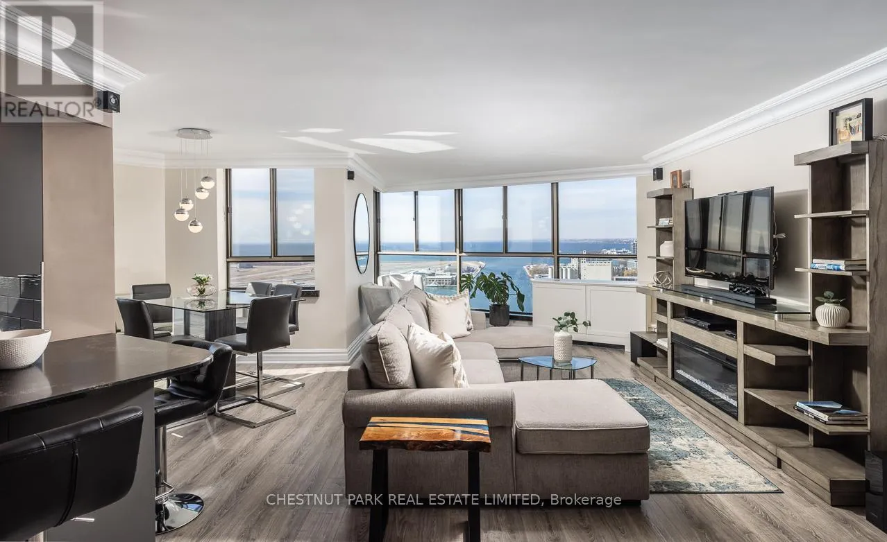 The sleek, contemporary chef's kitchen was renovated in 2024 and features ample storage, quartz countertops, pantry cupboards, double drawers, and a wine fridge. The extra-large primary suite showcases incredible views of the city skyline and lake, along with two seating areas, custom built-ins, a small office area, a large walk-in closet, and a stone, spa-inspired ensuite. The dining area overlooks the famed Toronto Islands. The spacious living area features custom cabinetry and an electric fireplace, while a separate bar area offers the option for a second dining space. The second bedroom includes a large double closet and stunning west-facing views of parkland and the Toronto skyline. Additional features include Hunter Douglas electric blinds, a smart lighting system, two designated side-by-side parking spots, and two oversized lockers. Enjoy a newly renovated, notable rooftop terrace with BBQs just one floor away. TTC is right at your door, with minutes to the Financial District, Harbourfront, Billy Bishop Airport, and the UP Express. This waterfront downtown penthouse truly has it all! Note: Fibre internet and cable are included in the maintenance fee. (id:27476)