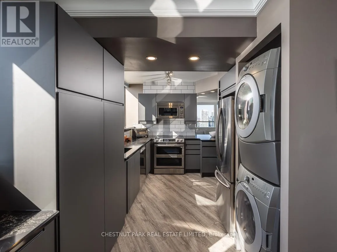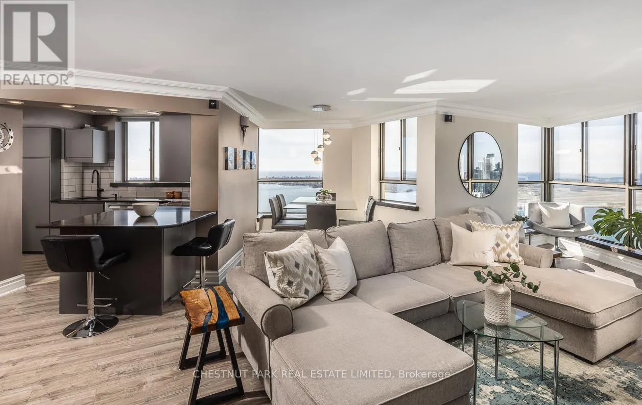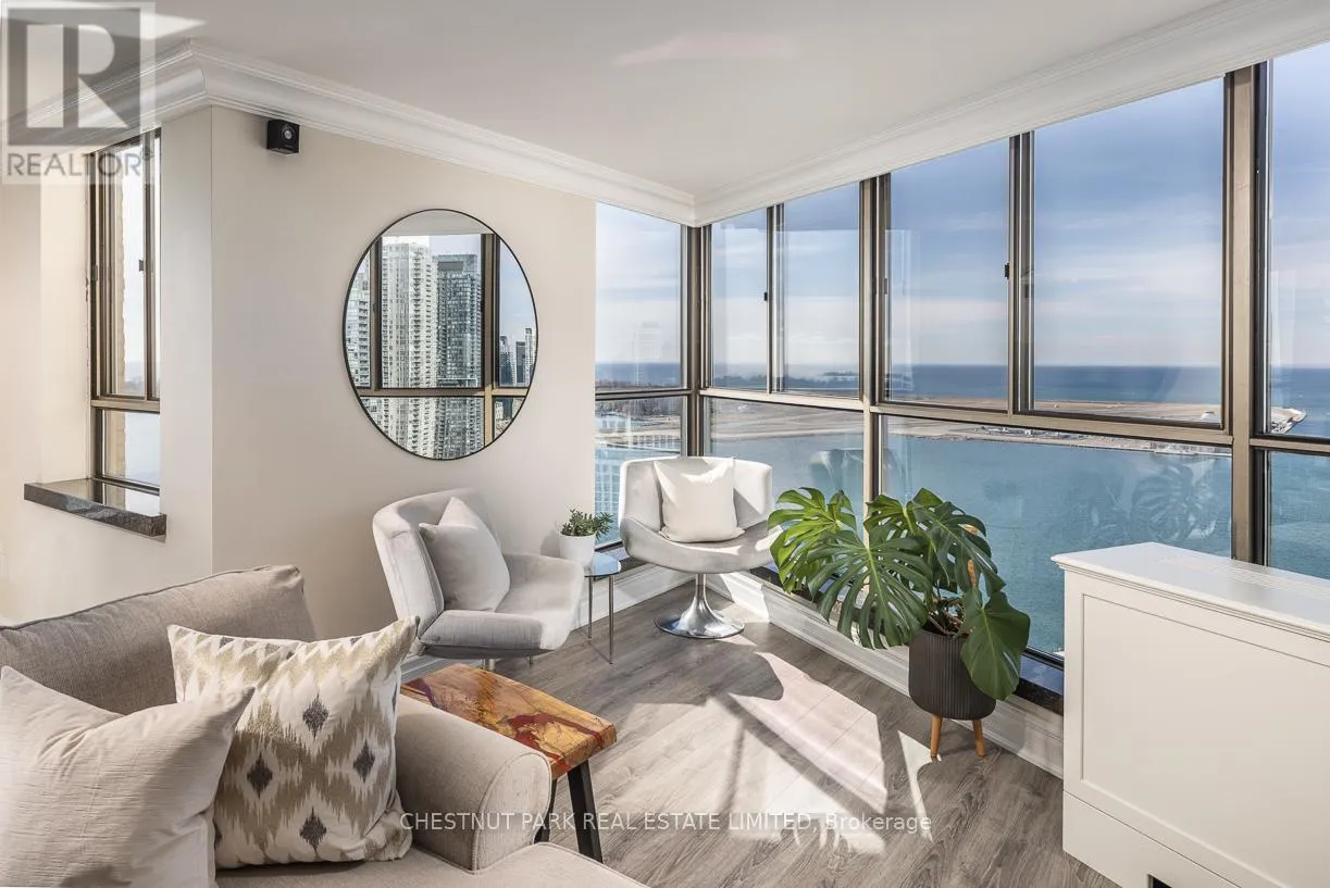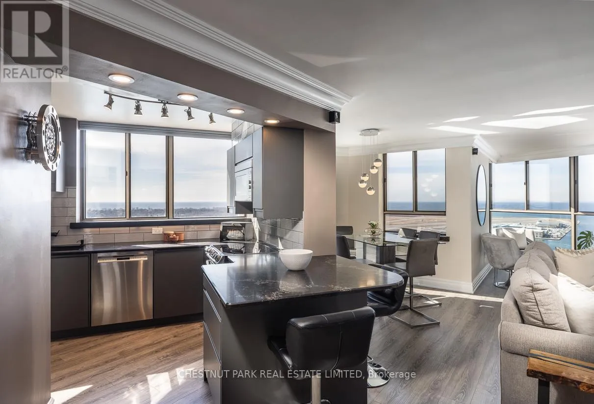 The sleek, contemporary chef's kitchen was renovated in 2024 and features ample storage, quartz countertops, pantry cupboards, double drawers, and a wine fridge. The extra-large primary suite showcases incredible views of the city skyline and lake, along with two seating areas, custom built-ins, a small office area, a large walk-in closet, and a stone, spa-inspired ensuite. The dining area overlooks the famed Toronto Islands. The spacious living area features custom cabinetry and an electric fireplace, while a separate bar area offers the option for a second dining space. The second bedroom includes a large double closet and stunning west-facing views of parkland and the Toronto skyline. Additional features include Hunter Douglas electric blinds, a smart lighting system, two designated side-by-side parking spots, and two oversized lockers. Enjoy a newly renovated, notable rooftop terrace with BBQs just one floor away. TTC is right at your door, with minutes to the Financial District, Harbourfront, Billy Bishop Airport, and the UP Express. This waterfront downtown penthouse truly has it all! Note: Fibre internet and cable are included in the maintenance fee. (id:27476)