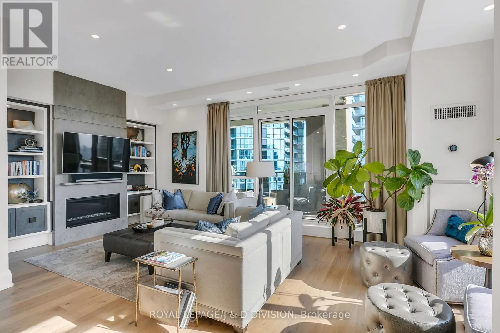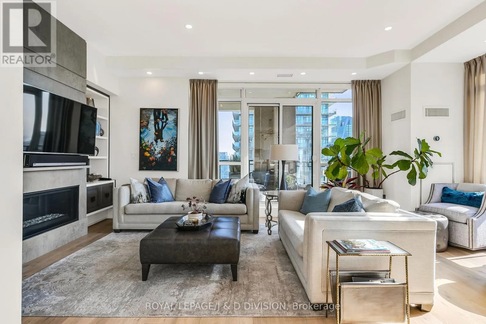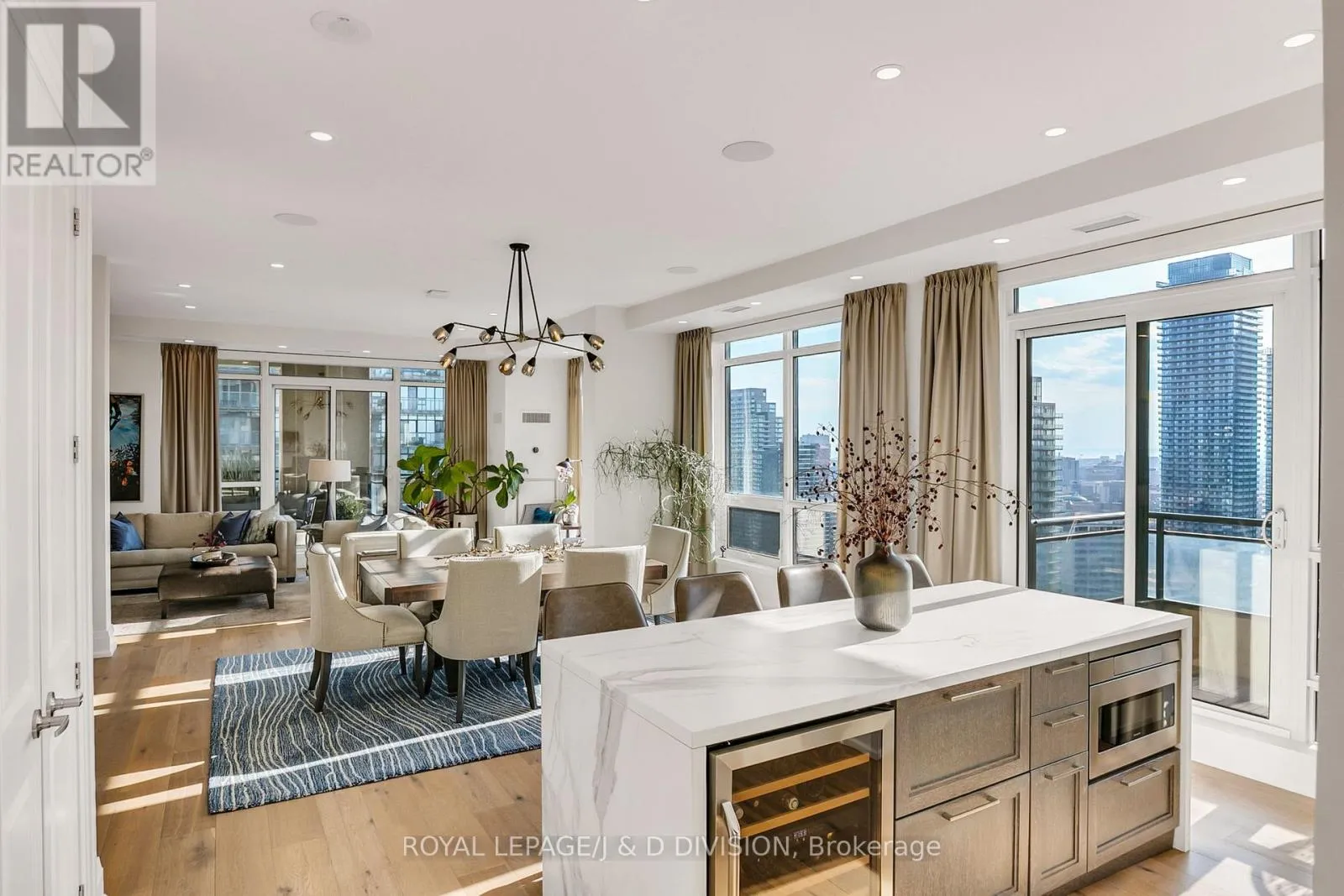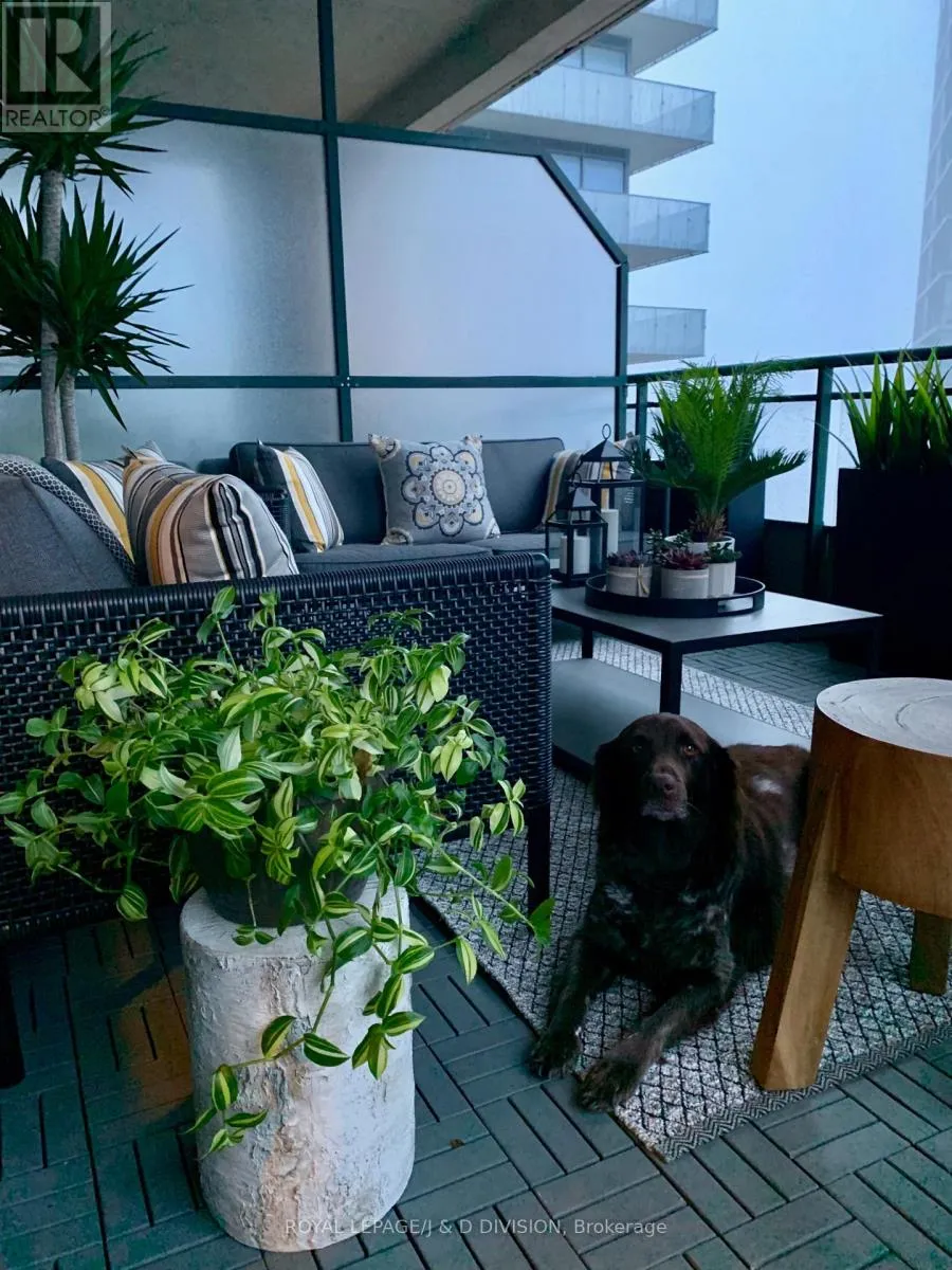 Bathed in epic natural light from floor-to-ceiling windows and soaring 10-foot ceilings throughout, the interior is finished with stunning wide-plank white oak hardwood and elegant porcelain flooring.The heart of the home is an open-concept living and dining area anchored by a cozy gas fireplace, a custom porcelain-clad waterfall island, and a strategic pantry/bar area with a full-size wine fridge and abundant storage. The chef-inspired kitchen is a standout, featuring custom-designed cabinetry by the renowned Downsview Kitchens, premium appliances, and a gas range. Truly extraordinary for city living, this residence boasts five sets of patio doors leading to a spacious south-facing terrace and two west-facing balconies-totalling 371 sq. ft. of private outdoor space. The main terrace features a rare built-in gas line for BBQs, which are permitted. For added convenience, gas service for the BBQ, fireplace, and cooktop is included in the monthly maintenance fee.Unique to this home are two separate entrances: a formal main entry and a highly functional secondary mudroom with a custom built-in bench. The primary suite is a true retreat featuring a 5-piece spa-like ensuite, four closets, and private balcony access. Includes two-car parking and an owned locker. Residents enjoy premium amenities including a 24-hour concierge, exercise room, pool, a 17th-floor garden, and two available guest suites for visiting family and friends.This dog-friendly building welcomes pets of all shapes and sizes. Steps from the subway, Eataly, and world-class shopping, this is a rare opportunity for refined city living with flexible possession available. (id:27476)