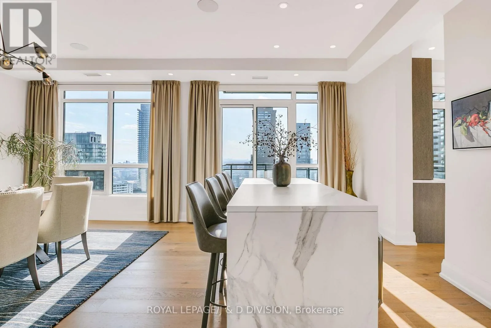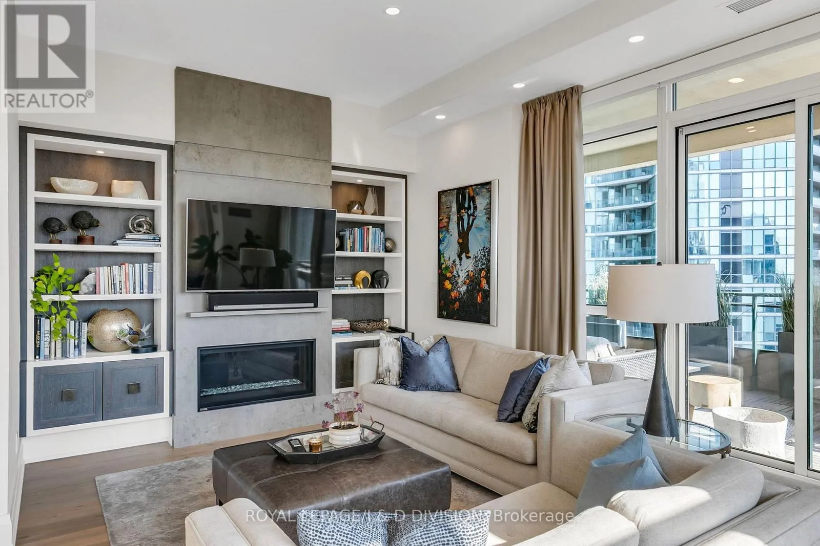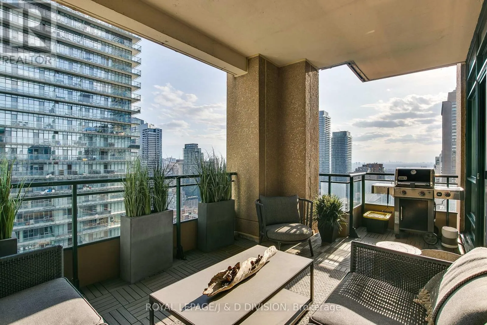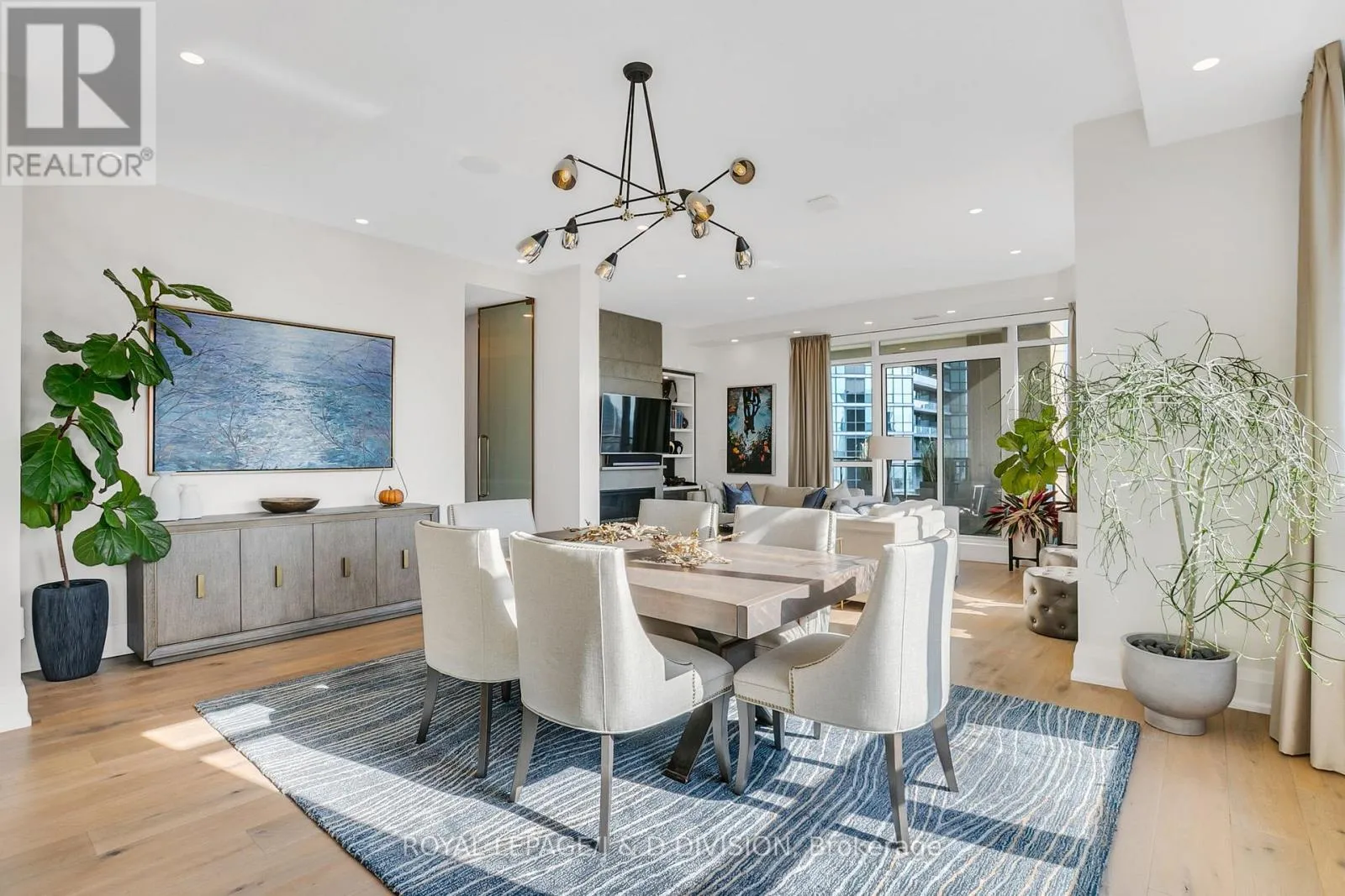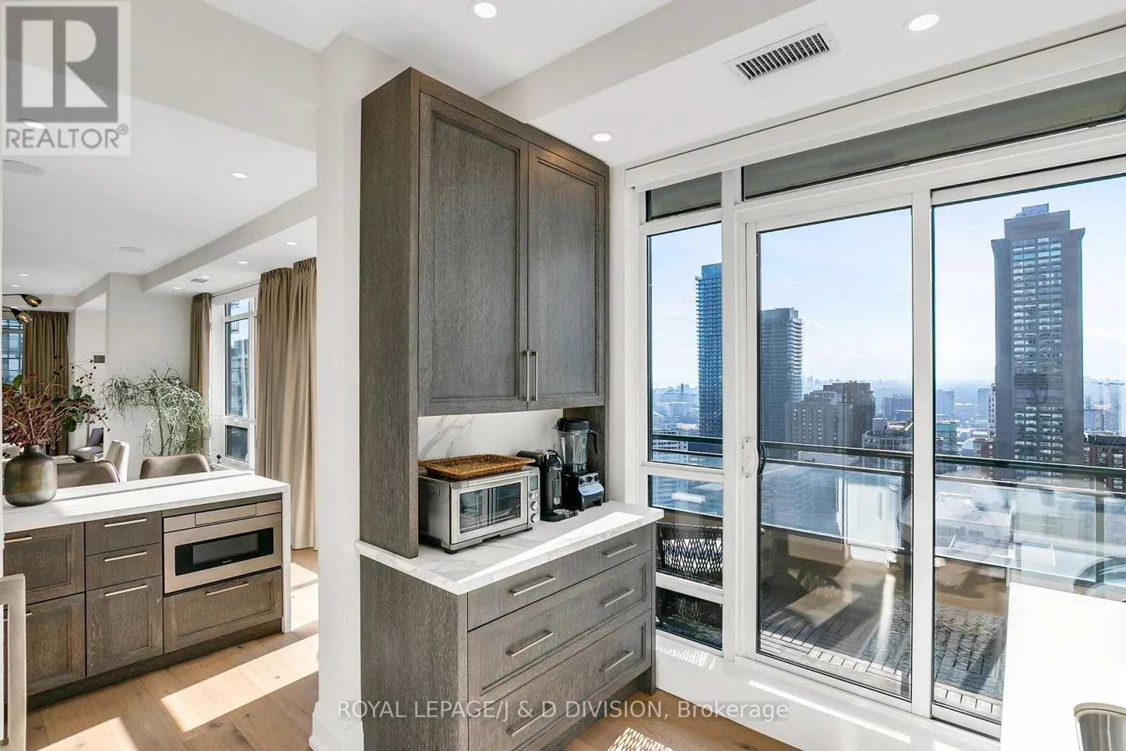 Bathed in epic natural light from floor-to-ceiling windows and soaring 10-foot ceilings throughout, the interior is finished with stunning wide-plank white oak hardwood and elegant porcelain flooring.The heart of the home is an open-concept living and dining area anchored by a cozy gas fireplace, a custom porcelain-clad waterfall island, and a strategic pantry/bar area with a full-size wine fridge and abundant storage. The chef-inspired kitchen is a standout, featuring custom-designed cabinetry by the renowned Downsview Kitchens, premium appliances, and a gas range. Truly extraordinary for city living, this residence boasts five sets of patio doors leading to a spacious south-facing terrace and two west-facing balconies-totalling 371 sq. ft. of private outdoor space. The main terrace features a rare built-in gas line for BBQs, which are permitted. For added convenience, gas service for the BBQ, fireplace, and cooktop is included in the monthly maintenance fee.Unique to this home are two separate entrances: a formal main entry and a highly functional secondary mudroom with a custom built-in bench. The primary suite is a true retreat featuring a 5-piece spa-like ensuite, four closets, and private balcony access. Includes two-car parking and an owned locker. Residents enjoy premium amenities including a 24-hour concierge, exercise room, pool, a 17th-floor garden, and two available guest suites for visiting family and friends.This dog-friendly building welcomes pets of all shapes and sizes. Steps from the subway, Eataly, and world-class shopping, this is a rare opportunity for refined city living with flexible possession available. (id:27476)