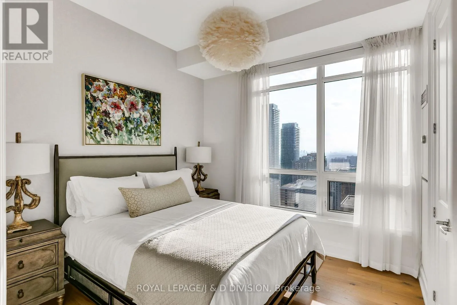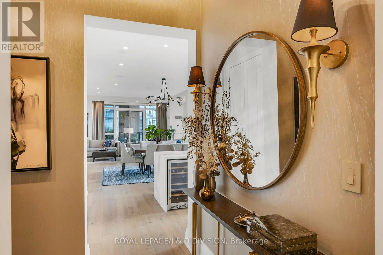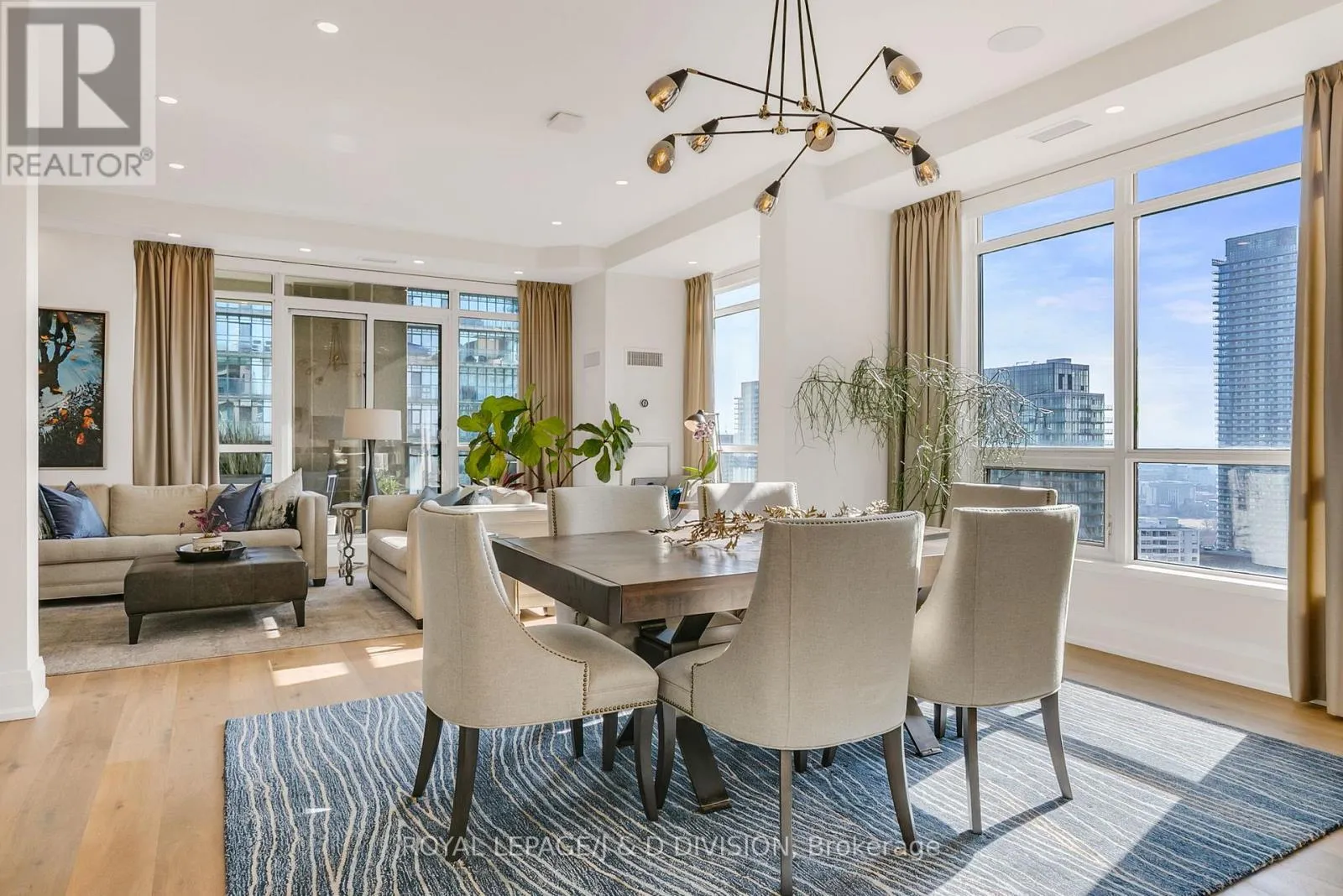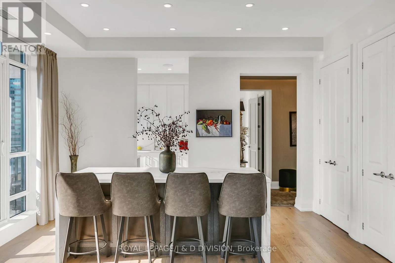 Bathed in epic natural light from floor-to-ceiling windows and soaring 10-foot ceilings throughout, the interior is finished with stunning wide-plank white oak hardwood and elegant porcelain flooring.The heart of the home is an open-concept living and dining area anchored by a cozy gas fireplace, a custom porcelain-clad waterfall island, and a strategic pantry/bar area with a full-size wine fridge and abundant storage. The chef-inspired kitchen is a standout, featuring custom-designed cabinetry by the renowned Downsview Kitchens, premium appliances, and a gas range. Truly extraordinary for city living, this residence boasts five sets of patio doors leading to a spacious south-facing terrace and two west-facing balconies-totalling 371 sq. ft. of private outdoor space. The main terrace features a rare built-in gas line for BBQs, which are permitted. For added convenience, gas service for the BBQ, fireplace, and cooktop is included in the monthly maintenance fee.Unique to this home are two separate entrances: a formal main entry and a highly functional secondary mudroom with a custom built-in bench. The primary suite is a true retreat featuring a 5-piece spa-like ensuite, four closets, and private balcony access. Includes two-car parking and an owned locker. Residents enjoy premium amenities including a 24-hour concierge, exercise room, pool, a 17th-floor garden, and two available guest suites for visiting family and friends.This dog-friendly building welcomes pets of all shapes and sizes. Steps from the subway, Eataly, and world-class shopping, this is a rare opportunity for refined city living with flexible possession available. (id:27476)