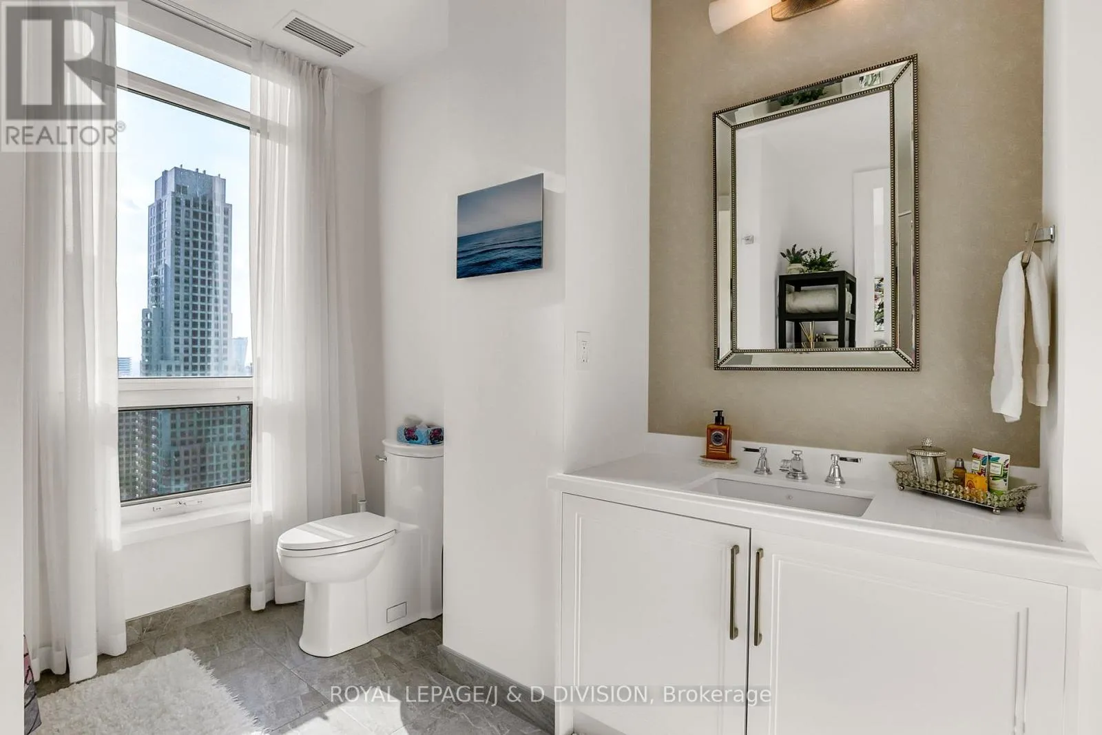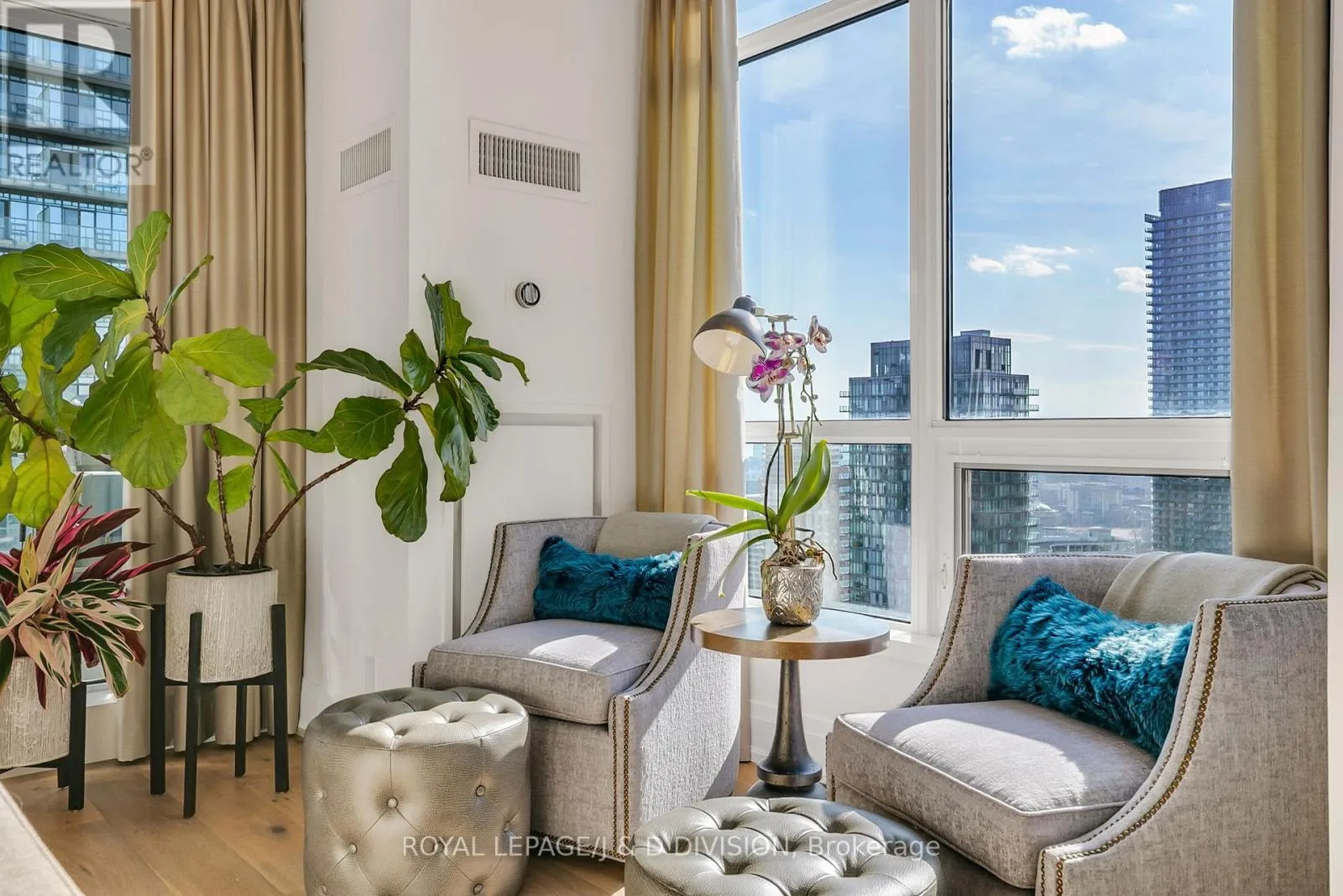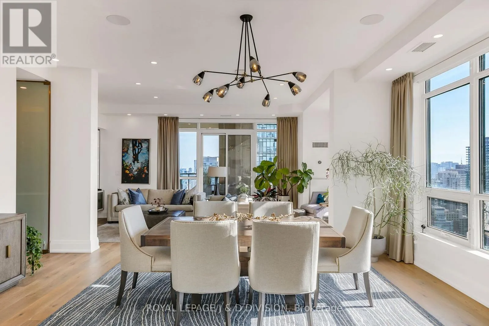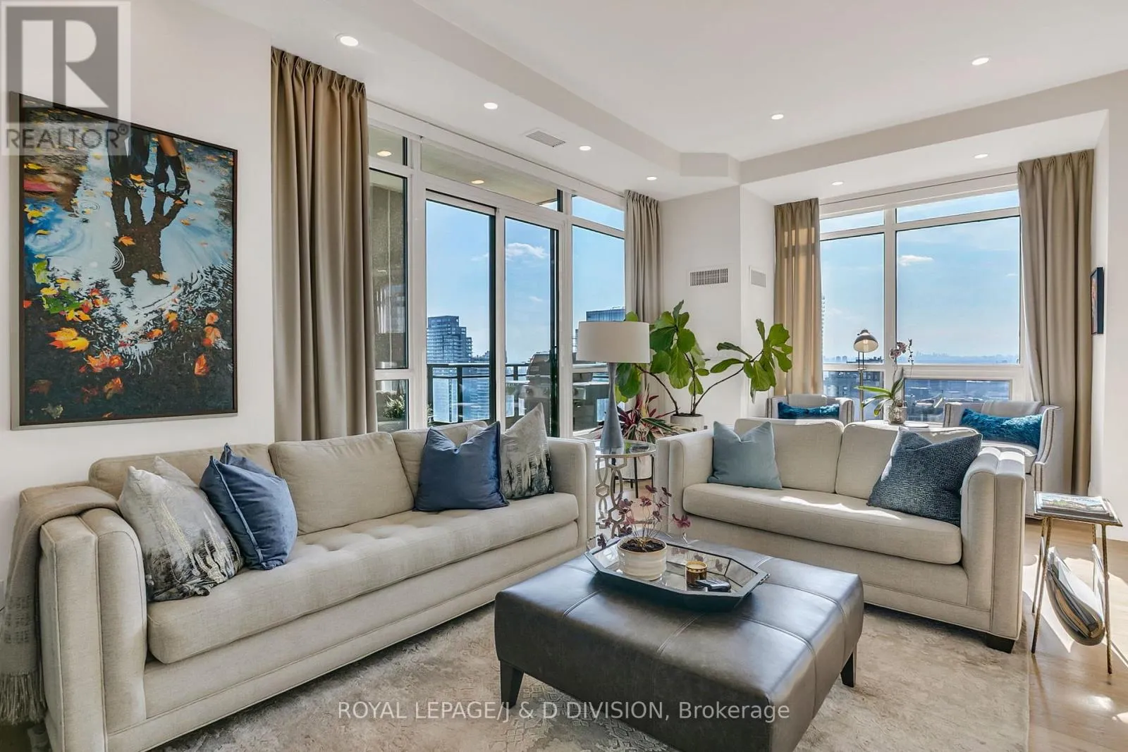 Bathed in epic natural light from floor-to-ceiling windows and soaring 10-foot ceilings throughout, the interior is finished with stunning wide-plank white oak hardwood and elegant porcelain flooring.The heart of the home is an open-concept living and dining area anchored by a cozy gas fireplace, a custom porcelain-clad waterfall island, and a strategic pantry/bar area with a full-size wine fridge and abundant storage. The chef-inspired kitchen is a standout, featuring custom-designed cabinetry by the renowned Downsview Kitchens, premium appliances, and a gas range. Truly extraordinary for city living, this residence boasts five sets of patio doors leading to a spacious south-facing terrace and two west-facing balconies-totalling 371 sq. ft. of private outdoor space. The main terrace features a rare built-in gas line for BBQs, which are permitted. For added convenience, gas service for the BBQ, fireplace, and cooktop is included in the monthly maintenance fee.Unique to this home are two separate entrances: a formal main entry and a highly functional secondary mudroom with a custom built-in bench. The primary suite is a true retreat featuring a 5-piece spa-like ensuite, four closets, and private balcony access. Includes two-car parking and an owned locker. Residents enjoy premium amenities including a 24-hour concierge, exercise room, pool, a 17th-floor garden, and two available guest suites for visiting family and friends.This dog-friendly building welcomes pets of all shapes and sizes. Steps from the subway, Eataly, and world-class shopping, this is a rare opportunity for refined city living with flexible possession available. (id:27476)