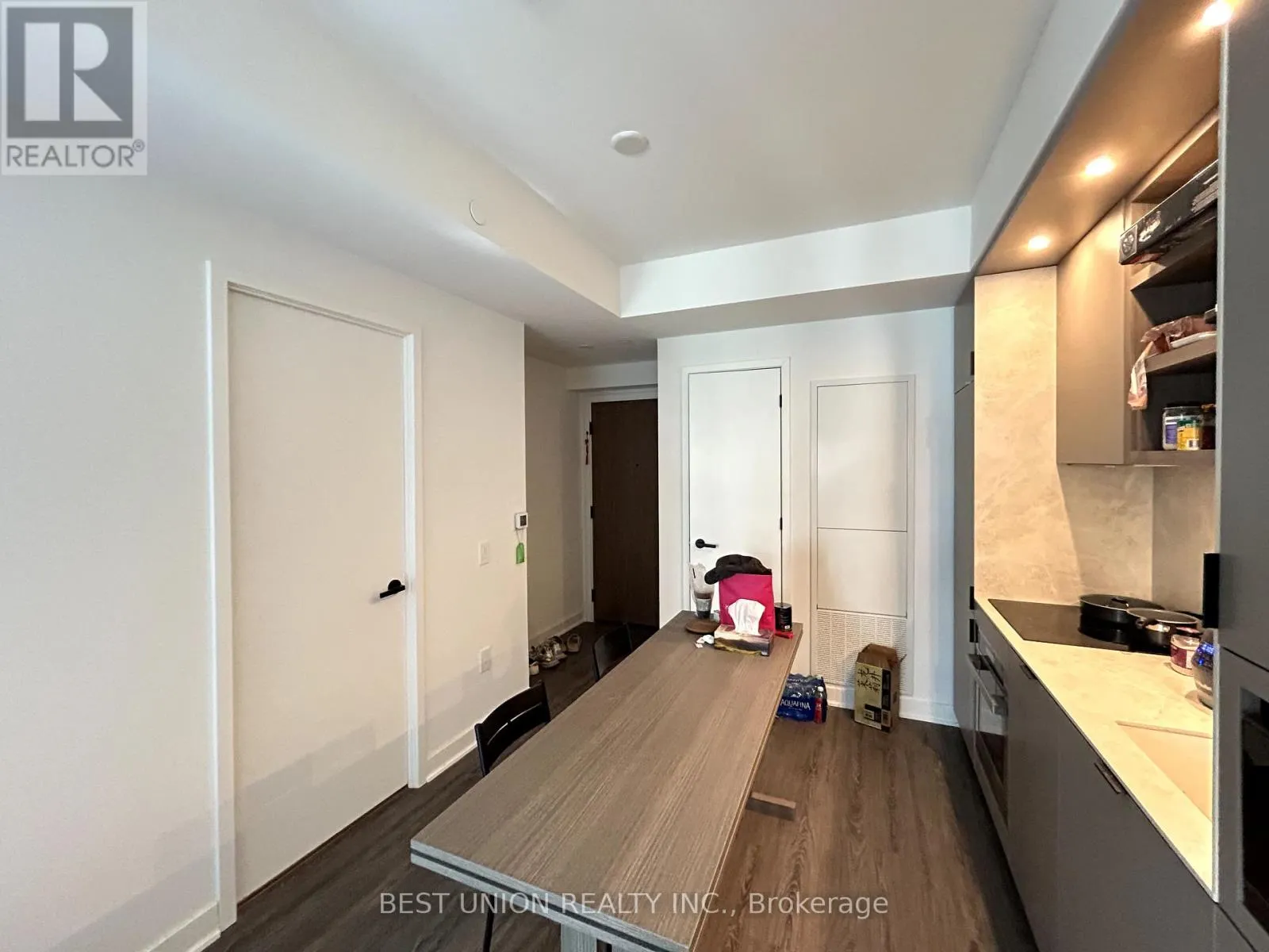 The modern Trevisana kitchen is equipped with built-in appliances, soft-close cabinetry, porcelain slab counters and backsplash, plus custom millwork with a built-in seating bench, movable table, pantry, and storage closet.The spacious primary bedroom offers large windows, his-and-hers closets, and access to a semi-ensuite bath. The signature bathroom doubles as a guest powder room, featuring an integrated Corian sink and vanity with wall-mounted faucet, backlit mirror, soft-close drawers, and functional shelving. A spa-inspired shower with rain head, handheld extension, frameless glass enclosure, and tiled niche completes this modern residence. (id:27476)