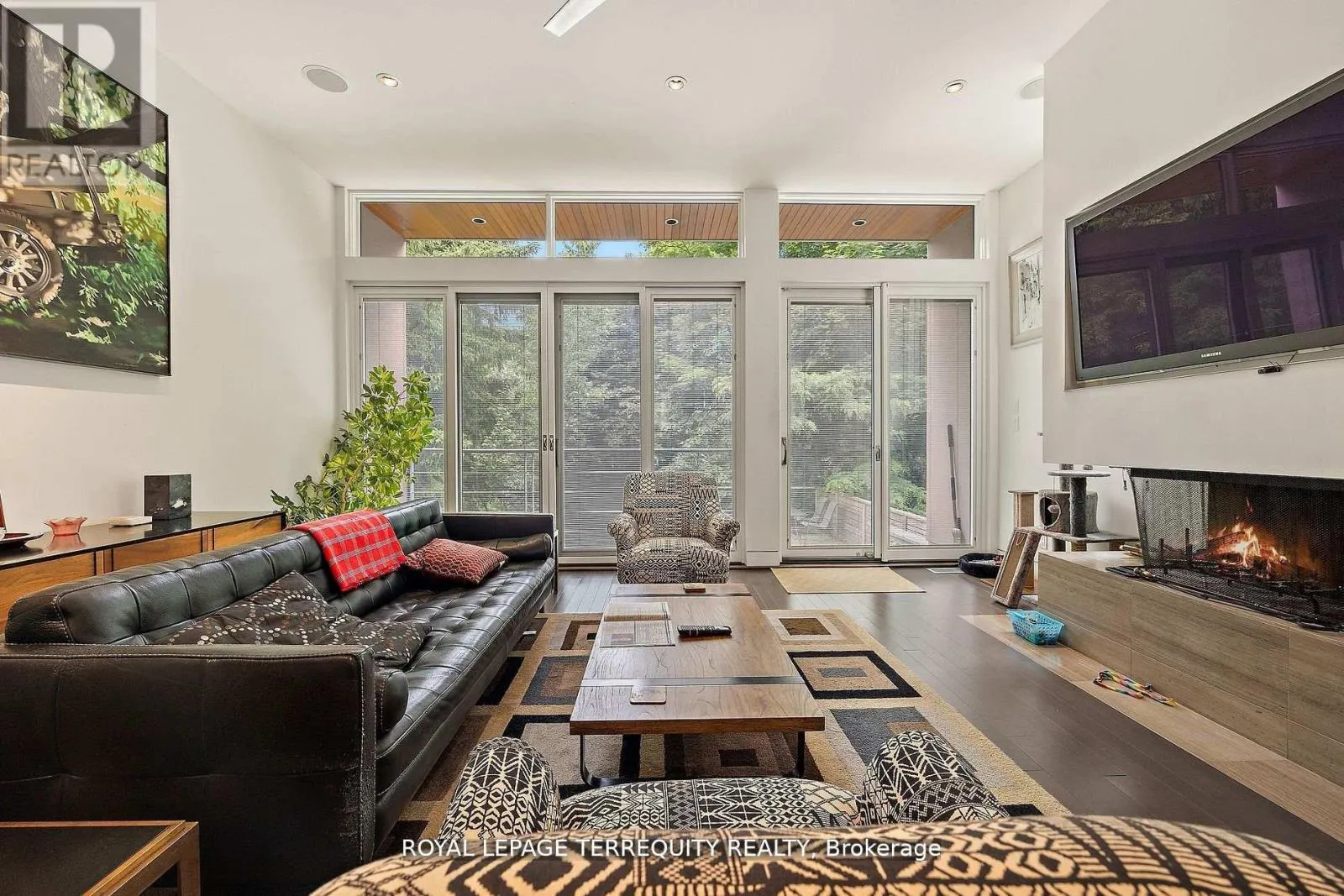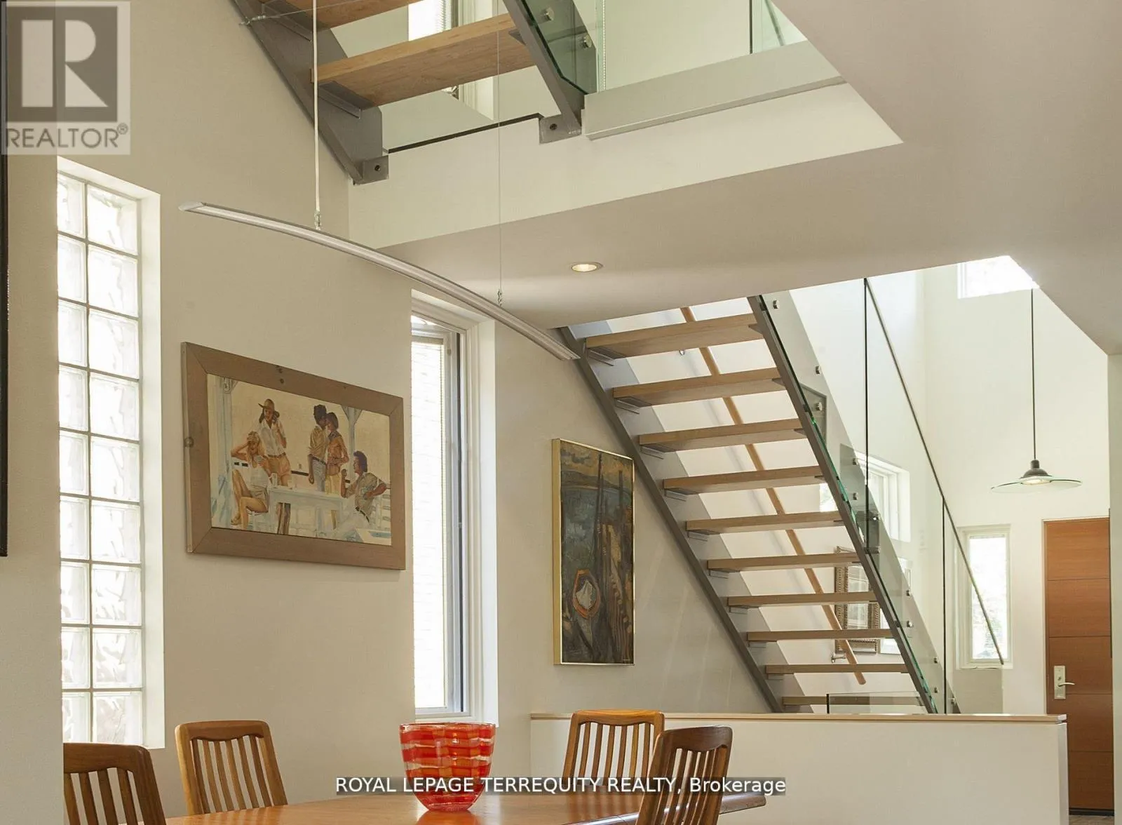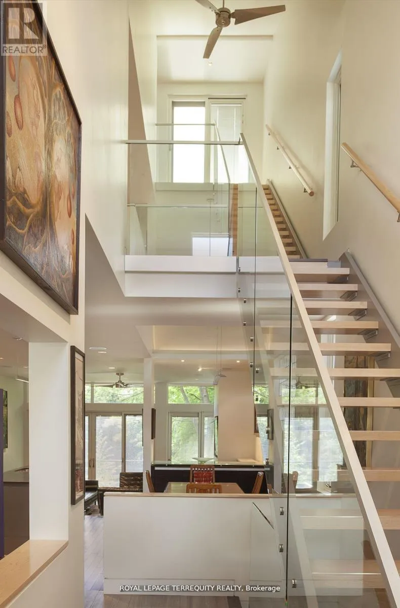 Stainless steel ceiling fans in the high ceilings complement the contemporary design of the floating staircases and the functionality of the dual HVAC. The second floor boasts a unique workstation/storage unit with generous cupboards and a large countertop overlooking the dining room and its glass block feature, as well as the laundry room, 3 bedrooms and 2 full bathrooms, one of them ensuite. The Binns' galley kitchen and dining room overlook the main floor family room with its wood burning fireplace and walk-out to the deep wooded lot. The recreation room or 5th bedroom also has a walk-out to the garden as well as a 3-piece bathroom. There is direct access to the garage and a separate front entrance on this floor. Located on a quiet, neighbourly, dead-end street in an eminently walkable area, there are three parking spaces. Magnificent Home. Motivated seller. (id:27476)