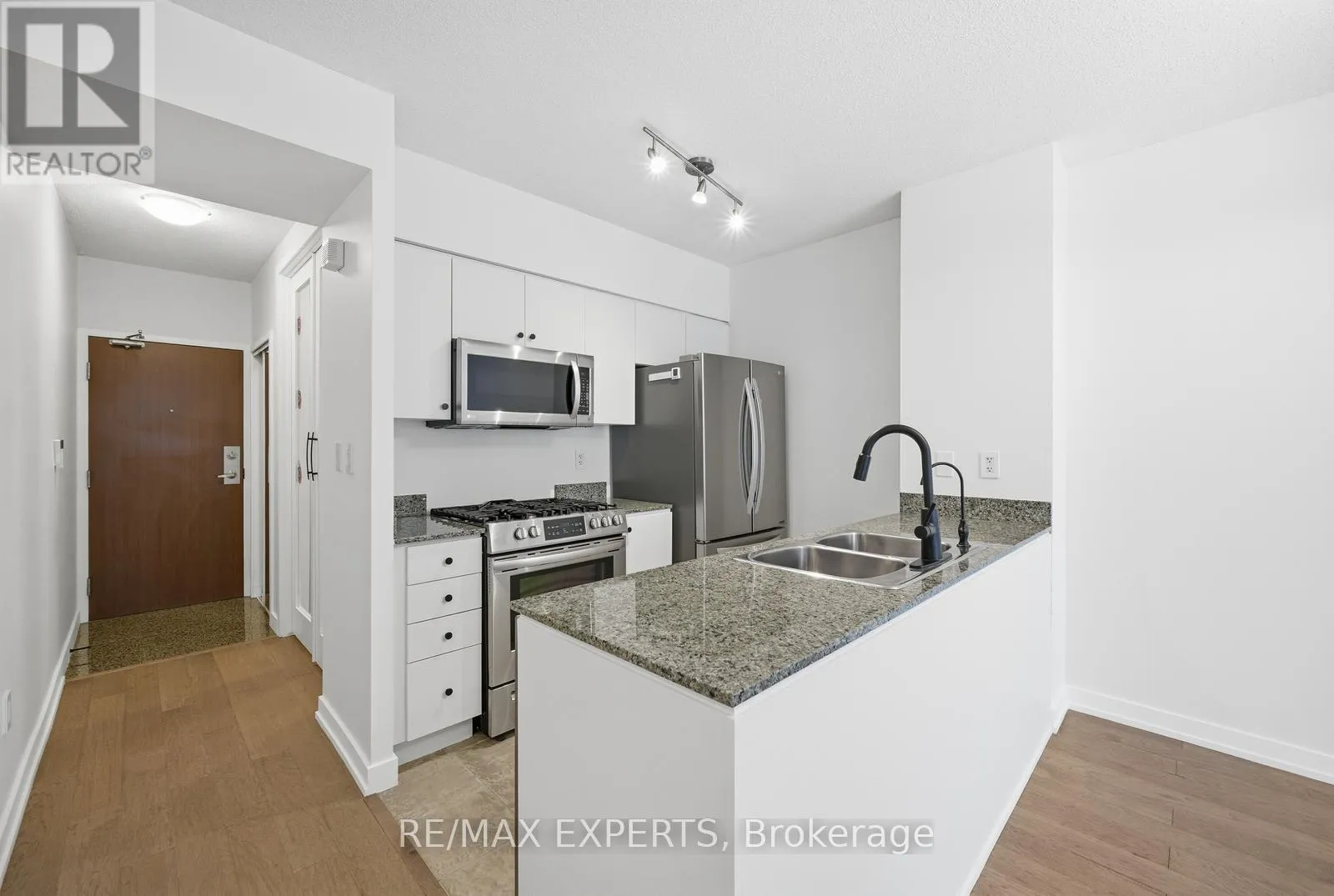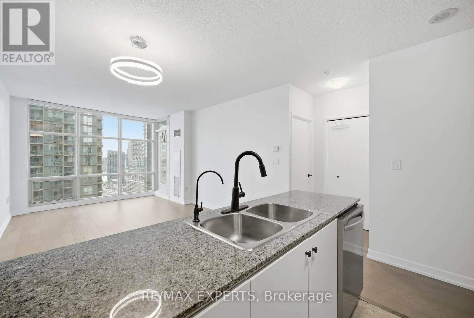 Spadina & Bremner Welcome to this bright and spacious one plus den executive suite featuring unobstructed, south-west facing views. Floor-to-ceiling windows flood the open-concept living and dining areas with natural light, creating a warm and inviting atmosphere. The modern kitchen is thoughtfully designed with a gas range, ample cabinetry, and generous storage. The meticulously maintained and professionally painted unit features a versatile den, is ideal for a home officeor study and can be privately enclosed with custom doors, while the primary bedroom features expansive windows, a serene outlook, and ample closet space.