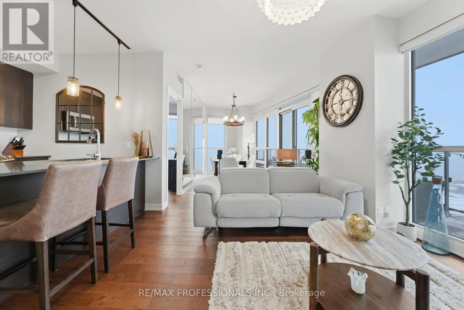 The open-concept layout features a sleek modern kitchen with quartz counters, full-size appliances, a centre island with breakfast bar, and seamless flow into the living and dining space - perfect for entertaining against an unforgettable backdrop. The split-bedroom floor plan provides exceptional privacy. The primary suite features a walk-in closet and a 3-piece ensuite, while the spacious second bedroom enjoys its own corner exposure and easy access to the main bath. The suite-length balcony with upgraded flooring and lighting off the living/dining area allows you to soak in the waterfront vistas from sunrise to sunset. Recently painted right down to the baseboards, this unit is ready for you to move in and enjoy! Westlake Village is a vibrant urban community offering underground access to the 50,000 sq ft Club W - an unrivalled collection of 5-star amenities including an indoor pool, fitness centre, yoga & pilates studio, party room, outdoor terrace with BBQs, and more. Direct indoor access to Metro, Shoppers Drug Mart, LCBO, banks, cafés, and restaurants adds everyday convenience, especially in winter. Step outside to the best of Humber Bay Shores: lakefront parks, trails, and Marine Parade's destination restaurants. Transit is at your doorstep with quick access to the Gardiner, making commuting effortless. Pet-friendly building (up to two pets, 35 lbs each). (id:27476)