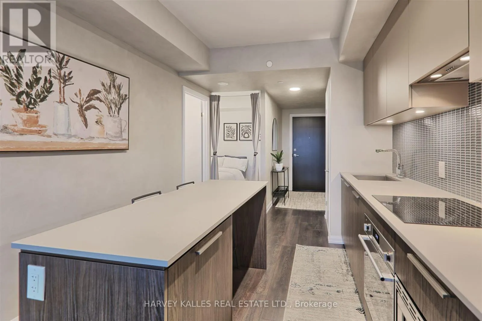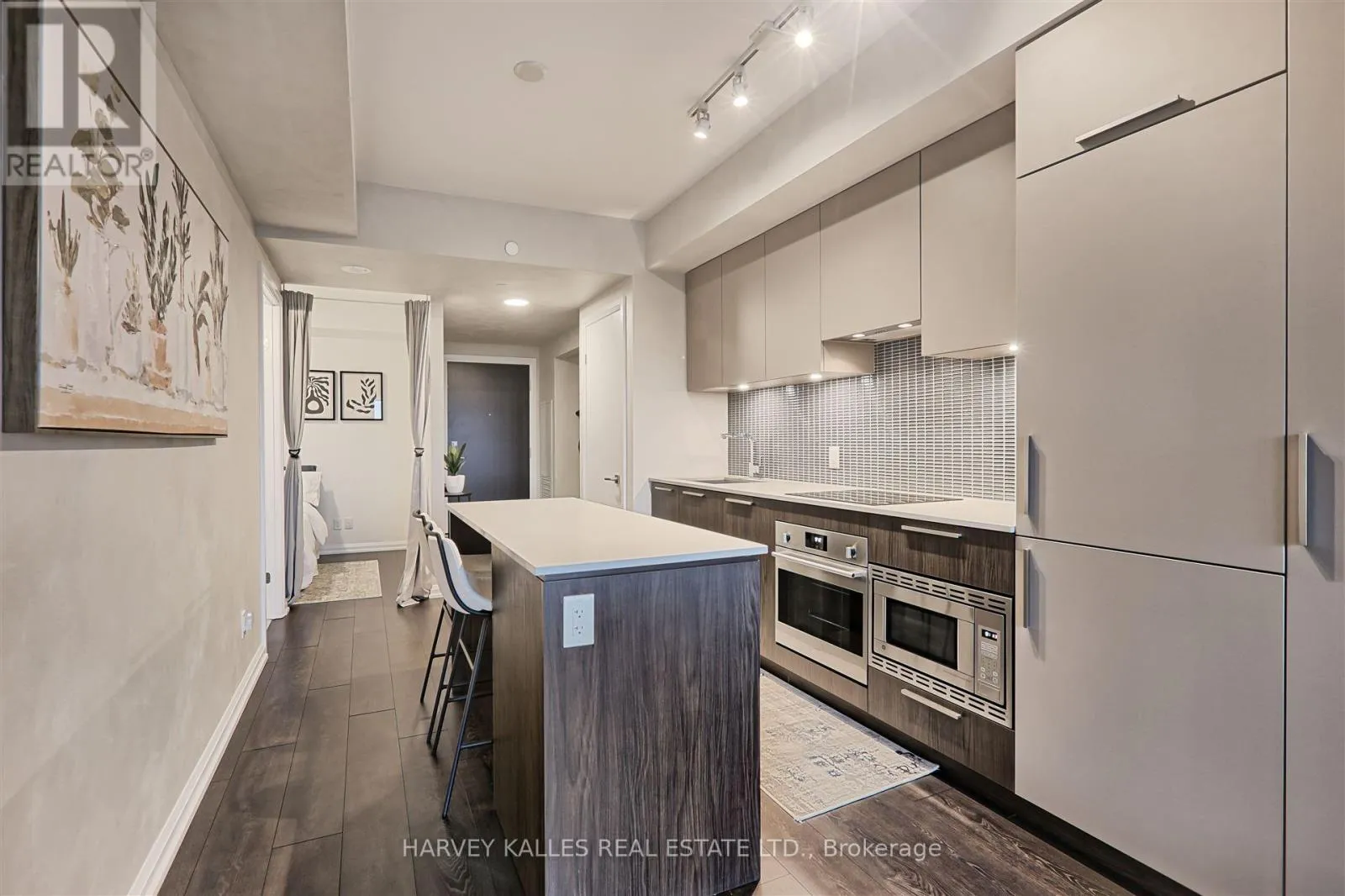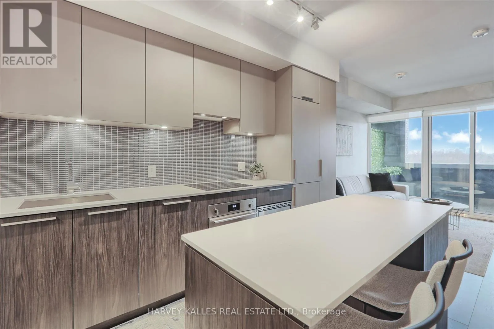 The unit boasts numerous upgrades, including a custom-designed kitchen island with seating and storage, integrated dishwasher and refrigerator, built-in wall oven, cooktop, and ample pantry storage perfect for cooking and entertaining. High ceilings and floor-to-ceiling windows create a bright and airy atmosphere, while the large private terrace has unobstructed south-facing views . The primary bedroom is generously sized, complete with a walk-in double closet for optimal organization. Upgraded bathroom fixtures and finishes ensure comfort, and wide plank flooring flows throughout the living areas and bedrooms.One parking and locker included. This boutique condo loft is ideally situated near highly-rated schools, surrounded by green spaces and the river valley. Residents can enjoy world-class amenities, including a service kitchen for hosting private events, a lounge with multiple sitting areas, fire pits, BBQ stations, and dining tables for summer gatherings. A fully equipped fitness center, 24-hour security, and visitor parking complete this exceptional living experience. Dont miss the opportunity to make this luxurious condo your new home! (id:27476)