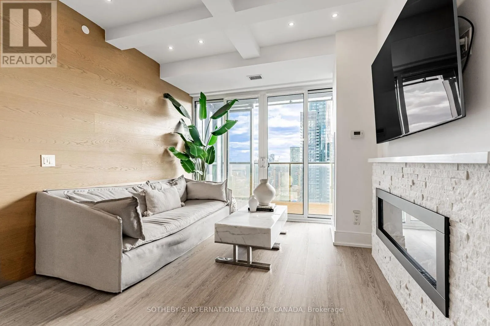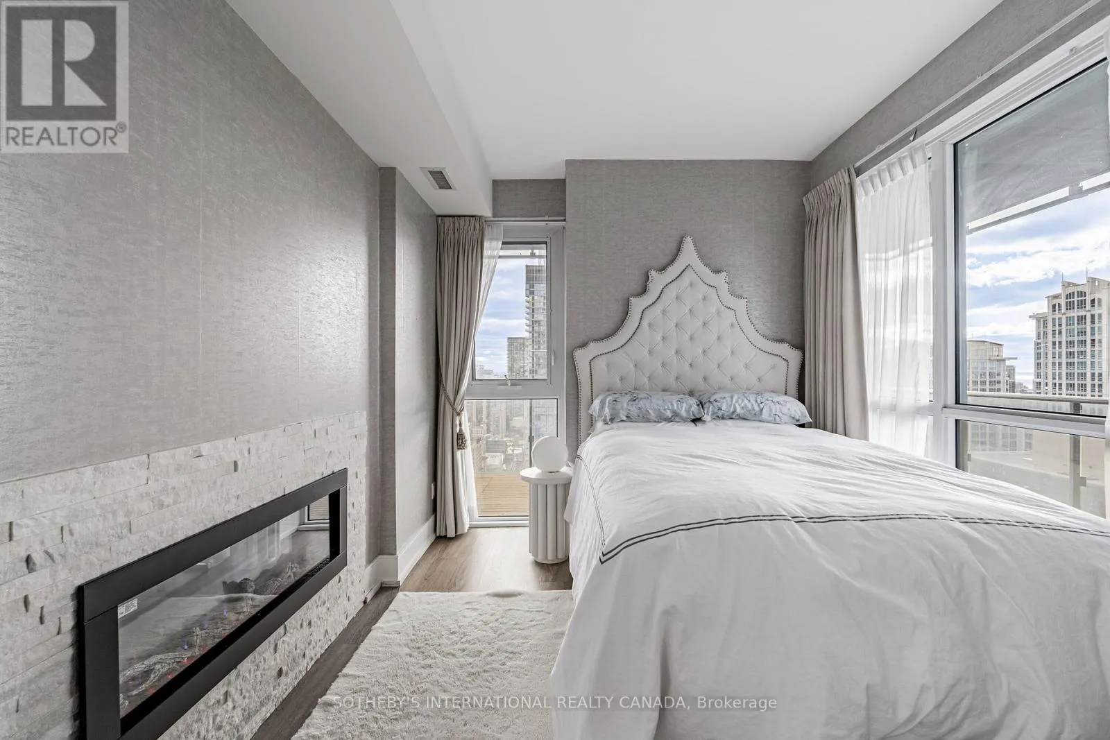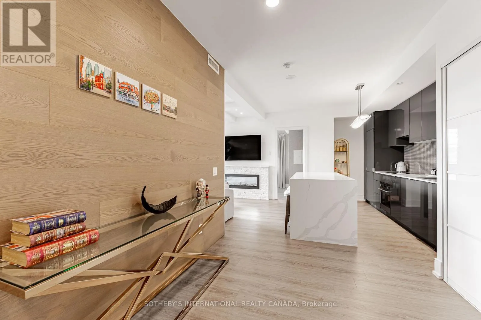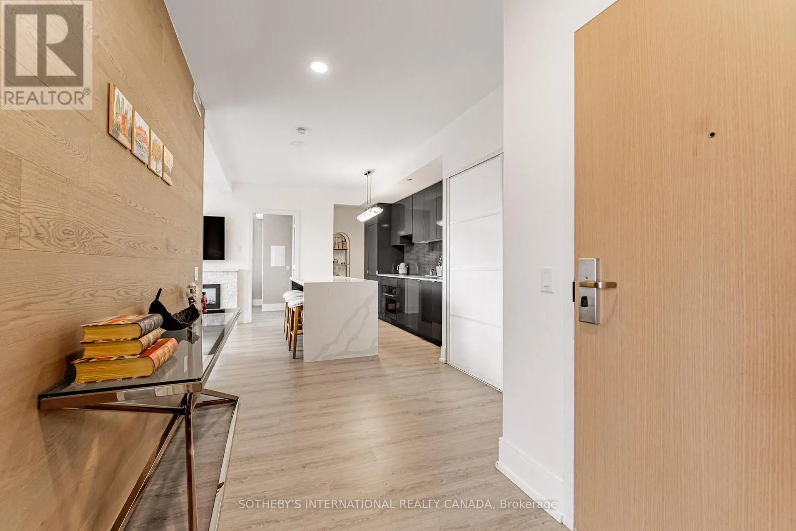 The list of upgrades from the builder include hardwood floors, over-sized kitchen island with bar fridge and Quartz waterfall countertops, panelled appliances, pot lights and backsplash! Originally, purchased as a 3 bedroom unit from the builder, one bedroom has been converted into a fully accessible walk-in closet off the second bedroom with tons of built-in organizers - can easily be converted back. Both bathrooms include state-of-the-art Japanese TOTO toilets. Main living space offers wood panelled walls, coffered ceilings, a two-way fireplace and an abundance of natural light. Walk-out to a very deep wrap around southwest terrace-like balcony and an additional private balcony off the second bedroom giving you over 400 square feet of outdoor living space. Just minutes from U of T, TMU, Toronto Film School, public transit, and anything else you might desire - Welcome Home! (id:27476)