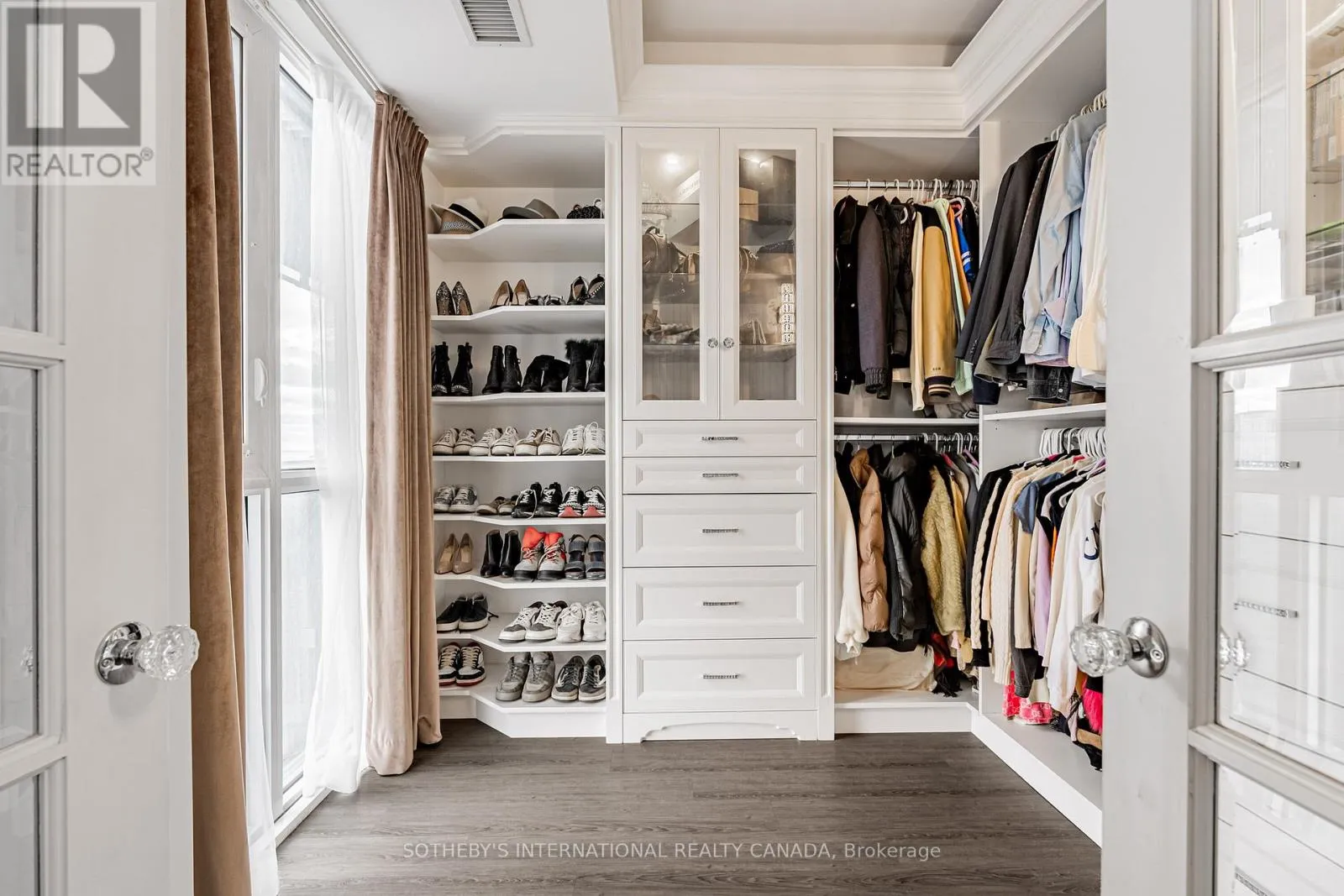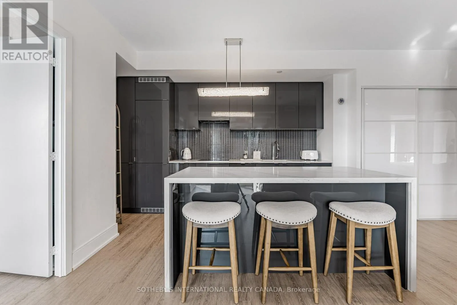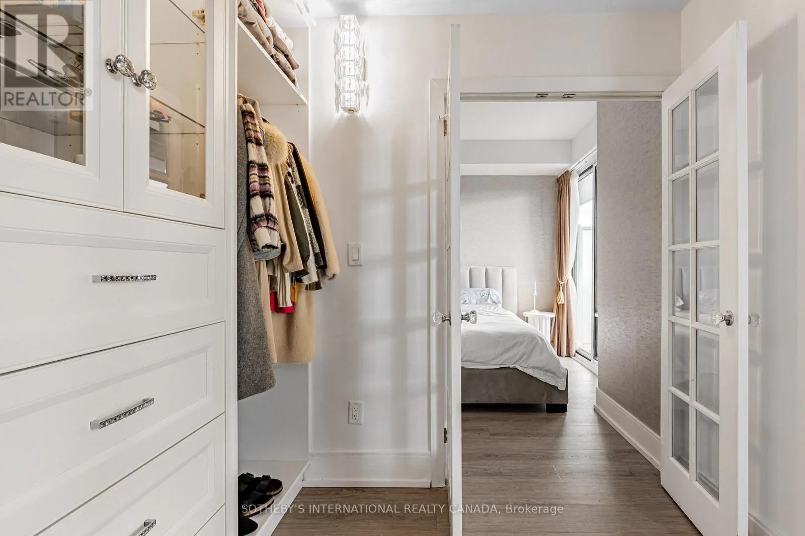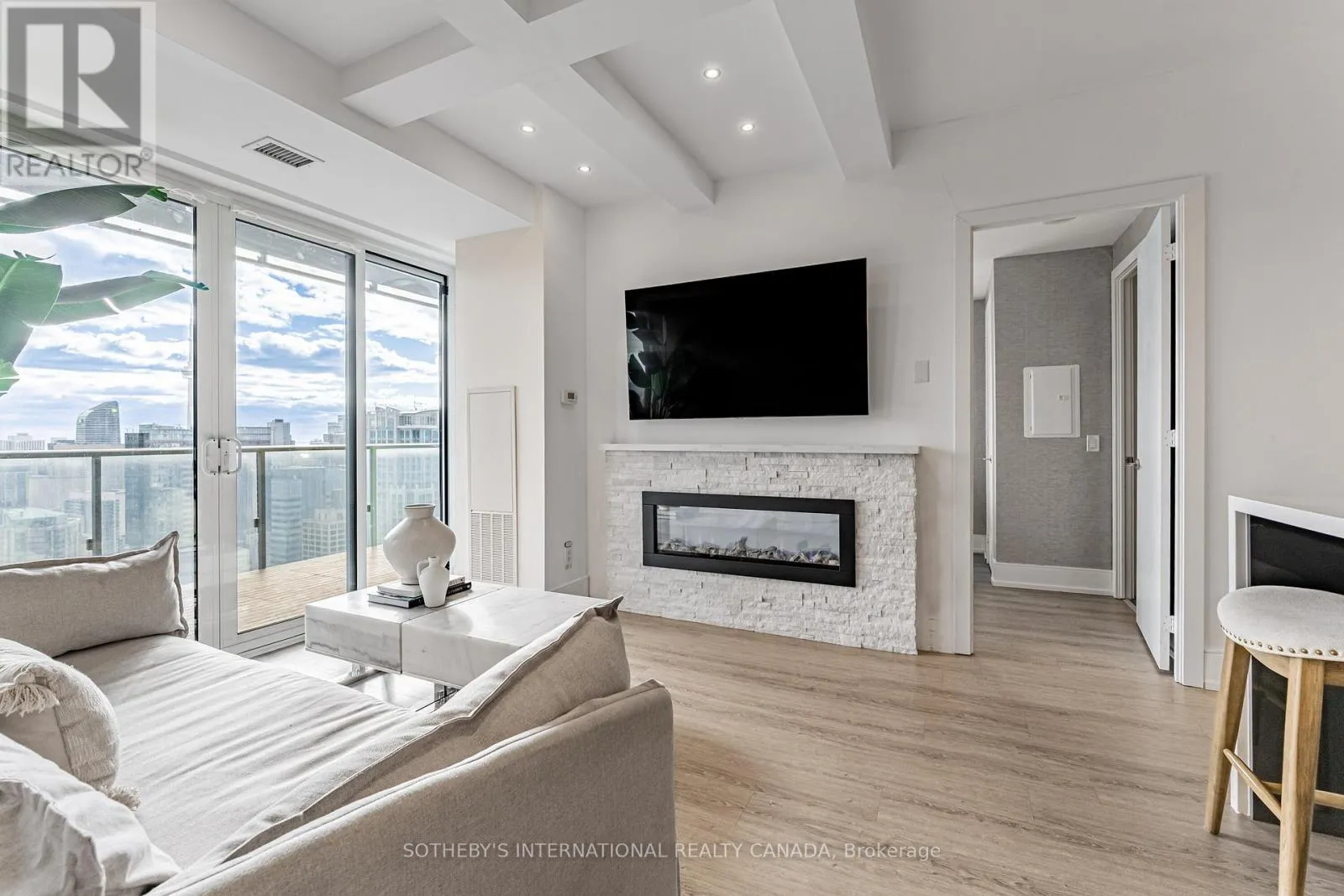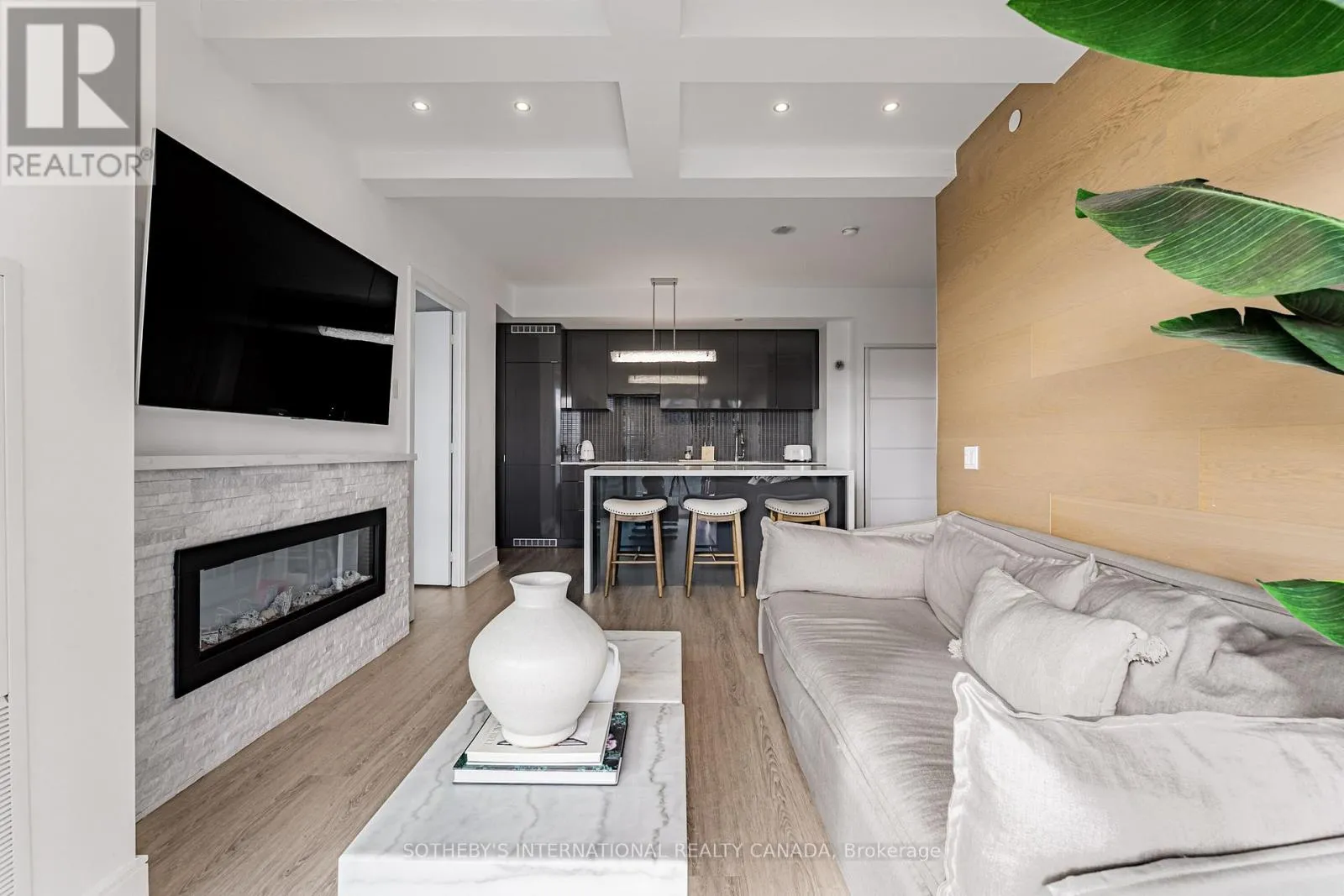 The list of upgrades from the builder include hardwood floors, over-sized kitchen island with bar fridge and Quartz waterfall countertops, panelled appliances, pot lights and backsplash! Originally, purchased as a 3 bedroom unit from the builder, one bedroom has been converted into a fully accessible walk-in closet off the second bedroom with tons of built-in organizers - can easily be converted back. Both bathrooms include state-of-the-art Japanese TOTO toilets. Main living space offers wood panelled walls, coffered ceilings, a two-way fireplace and an abundance of natural light. Walk-out to a very deep wrap around southwest terrace-like balcony and an additional private balcony off the second bedroom giving you over 400 square feet of outdoor living space. Just minutes from U of T, TMU, Toronto Film School, public transit, and anything else you might desire - Welcome Home! (id:27476)