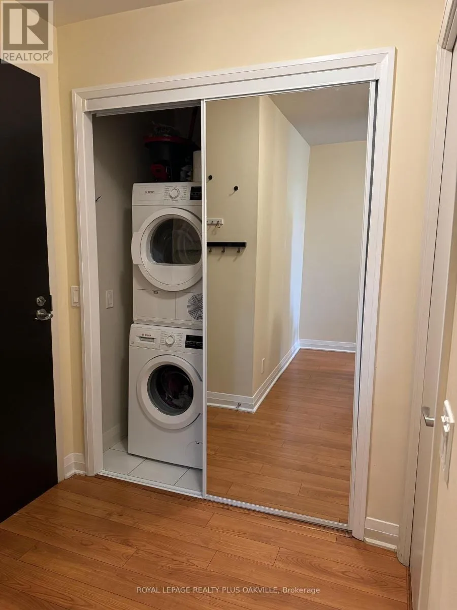 Burnhamthorpe/Hwy 427 This 5th floor, 1-bedroom + den condo in Valhalla offers just under 700 sq ft of living space with an open-concept layout and floor-to-ceiling windows. The den, measuring 8 x 8 feet, can serve as an office or potential second bedroom. The main living area includes an additional office nook, while the kitchen features a large movable island and pantry. The bedroom, which fits a queen bed, has a walk-in and a linen closet.